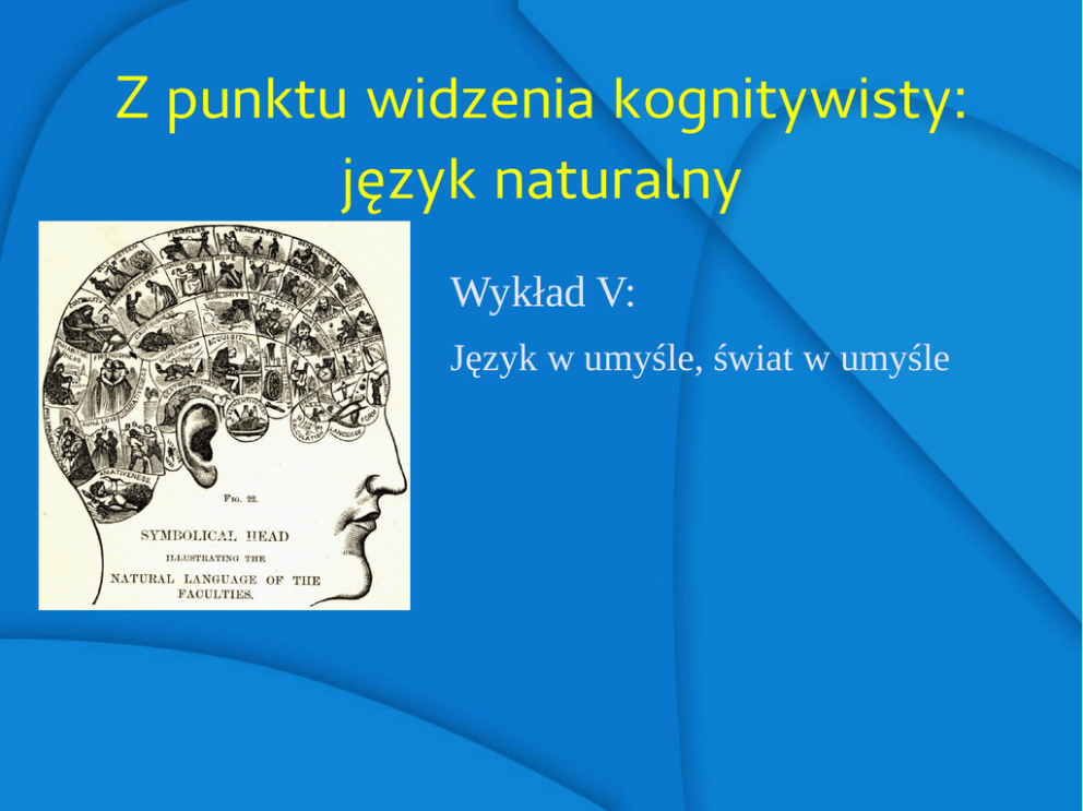 Z punktu widzenia kognitywisty: język naturalny Wykład V: Język w umyśle, świat w umyśle O “obiektach” Podejście zdroworozsądkowe: intuicyjna charakterystyka obiektów i stanów rzeczy Ale mówi się również (m.in.) o: postaciach fikcyjnych i mitycznych obiektach geograficznych obiektach wirtualnych jednostkach społecznych obiektach wychwytywanych słuchem innych: najlepszy z możliwych światów, zbiór możliwych światów O “obiektach” Podejście zdroworozsądkowe: intuicyjna charakterystyka obiektów i stanów rzeczy Ale mówi się również (m.in.) o: postaciach fikcyjnych i mitycznych obiektach geograficznych obiektach wirtualnych jednostkach społecznych obiektach wychwytywanych słuchem innych: najlepszy z możliwych światów, zbiór możliwych światów Psychologizacja świata Podejście zdroworozsądkowe: tajemnicze powiązanie umysłu ze światem: na poziomie języka lub na poziomie pojęć podejrzane pojęcie “obiektów w świecie” Na potrzeby teorii referencji wepchnąć świat do umysłu wraz z językiem Realistyczna koncepcja referencji: Fraza P języka L wypowiedziana w kontekście C odnosi się do jednostki E w świecie Konceptualistyczna koncepcja referencji: Mówiący językiem L uznaje frazę P wypowiedzianą w kontekście C za odnoszącą się do jednostki E w świecie skonceptualizowanym przez S Prosty akt referencji Hej, spójrz na TO! to – bez zawartości deskryptywnej, semantyka referencyjna siatkówka –> wizja niskiego i średniego poziomu –> percept Percept – struktura kognitywna o charakterze pozajęzykowym Świat fenomenalny to “rzeczywistość” tworzona przez system percepcyjny w odpowiedzi na to, co jest na zewnątrz Percept: formalna struktura realizowana neuronowo Poczucie, iż doświadczamy obiektów na zewnątrz, nie zaś perceptów efektem naszej budowy Odniesienie i spełnianie Odniesienie i spełnianie Hej, spójrz na TO! Sem. realistyczna: spełnianie to relacja między wyrażeniem językowym a obiektem w świecie Sem. konceptualistyczna: spełnianie to relacja między wyrażeniem językowym a obiektem w świecie skonceptualizowanym przez użytkownika języka Rozmawiałem wczoraj z Danielem Dennettem domniemany referent obecny w bazie wiedzy brak referenta w bazie wiedzy domniemany referent pozostaje w konflikcie z bazą wiedzy domniemany referent zawiera cechy konfliktujące ze sobą Referencja zdań formalna semantyka: referentem zdania jest jego wartość logiczna (Frege) alternatywa: referencją zdania jest sytuacja (stan rzeczy) Jana zdziwiło to, że Wisła przegrała. Baza wiedzy obejmuje zdarzenie iż Wisła przegrała To, że Wisła przegrała nie znajduje się w bazie wiedzy Baza wiedzy zawiera coś pozostającego w konflikcie z tym, że Wisła przegrała Opisowe cechy domniemanego zdarzenia pozostają w konflikcie Język. Próba formalnej definicji [Żegleń] Językiem nazywamy uporządkowany system znaków słownych (słownik) wraz z regułami używania tych znaków. [Ziembiński] Język to system znaków słownych, z którymi odpowiednie reguły znaczeniowe każą wiązać myśli określonego rodzaju a inne reguły określają dopuszczalny sposób wiązania tych słów w wyrażenia złożone (reg. składniowe) Język. Reguły językowe reguły łączenia (konstruowania) znaków reguły przekształcania (transformacji) znaków reguły uznawania (określające sensowność): aksjomatyczne dedukcyjne empiryczne [K. Ajdukiewicz] Język. Akty mowy John Austin, How to Make Things with Words Akt lokucyjny (akt mówienia) wypowiadanie zbudowanego wg. reguł gramatyki ciągu fonicznego, stanowiącego wypowiedź odnoszącą się do pewnego stanu rzeczy akt fonetyczny akt fatyczny akt retyczny Język. Akty mowy Akt illokucyjny (akt zachodzący w mówieniu) wypowiadanie czegoś przez nadawcę z pewną intencją (stwierdzania, przyrzeczenia); każda wypowiedź illokucyjna wiąże się z pewną siłą illokucyjną Akt perlokucyjny (akt zachodzący dzięki mówieniu) wytworzony w akcie mowy element oddziaływania na odbiorcę, wywołujący np.: Język. Akty mowy reakcję (określone zachowanie) zmianę nastawienia poznawczego zmianę nastawienia emocjonalnego (zachwyt, zgorszenie, znudzenie) (Niekiedy mówi się też o) akcie interlokucyjnym, który pojawia się, gdy między nadawcą a odbiorcą utrzymuje się kontakt (rozmowa, wywiad, egzamin itp.)