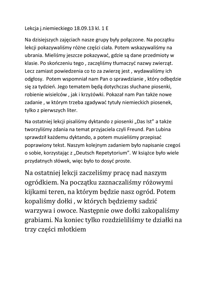 Lekcja j.niemieckiego 18.09.13 kl. 1 E Na dzisiejszych zajęciach nasze grupy były połączone. Na początku lekcji pokazywaliśmy różne części ciała. Potem wskazywaliśmy na ubrania. Mieliśmy jeszcze pokazywać, gdzie są dane przedmioty w klasie. Po skończeniu tego , zaczęliśmy tłumaczyć nazwy zwierząt. Lecz zamiast powiedzenia co to za zwierzę jest , wydawaliśmy ich odgłosy. Potem wspomniał nam Pan o sprawdzianie , który odbędzie się za tydzień. Jego tematem będą dotychczas słuchane piosenki, robienie wisielców , jak i krzyżówki. Pokazał nam Pan także nowe zadanie , w którym trzeba zgadywać tytuły niemieckich piosenek, tylko z pierwszych liter. Na ostatniej lekcji pisaliśmy dyktando z piosenki „Das Ist” a także tworzyliśmy zdania na temat przyjaciela czyli Freund. Pan Lubina sprawdził każdemu dyktando, a potem musieliśmy przepisać poprawiony tekst. Naszym kolejnym zadaniem było napisanie czegoś o sobie, korzystając z „Deutsch Repetytorium”. W książce było wiele przydatnych słówek, więc było to dosyć proste. Na ostatniej lekcji zaczeliśmy pracę nad naszym ogródkiem. Na początku zaznaczaliśmy różowymi kijkami teren, na którym będzie nasz ogród. Potem kopaliśmy dołki , w których będziemy sadzić warzywa i owoce. Następnie owe dołki zakopaliśmy grabiami. Na koniec tylko rozdzieliliśmy te działki na trzy części młotkiem Na początku dzisiejszej lekcji pisaliśmy dyktando z piosenki „Ich heisse”. Potem dawaliśmy kartki do innych grup, aby one sprawdziły nasze prace. Po oddaniu wszystkich kartek, Pan Lubina pokazał nam oś czasu po niemiecku. Następnie właśnie tam zamieszczaliśmy czas życia wcześniej wybranego kompozytora (moja grupa wybrała Beethovena). Podczas lekcji szukaliśmy informacji na temat danego kompozytora, słuchając przy tym jego muzyki. Lekcja języka niemieckiego , 13.09.2013 , klasa I E Na początku ostatniej lekcji śpiewaliśmy piosenki „Das ist” i „Guten Morgen”. Następnie opowiadał nam Pan o różnicach w mowie Polaków i Niemców. Wspomniał Pan także , że męzczyźni inaczej uczą niż kobiety. Potem rozdał nam Pan kartki z alfabetem niemieckim, i słowami zaczynającymi się na litery z tego alfabetu. Naszym pierwszym zadaniem było układanie imion i nazwisk z pierwszych liter słów, które nam Pan dyktował. Nasze drugie zadanie było odwrotne, mieliśmy ze słów piosenki wybranej ze śpiewnika ułożyć wyrazy, które inne grupy próbowały zgadywać. Przy robieniu tego zadania rozbrzmiewała piosenka zespołu „Feuer Frei” , co po polsku oznacza komendę : „ognia !”. Przykłady tworzenia słów: Dora Anton Samuel Ida Samuel Theodor Dora Ida Emil Berta Ludwig Ulrich Martha Emil Das ist die blume Dora Anton Samuel Ida Samuel Theodor Dora Ida Emil Theodor Übermut Richard. Das ist die tür Wczorajsza lekcja miała charakter przygotowawczy. Pan nauczyciel objaśnił nam zasady oceniania i wymagania stawiane uczniom. Dowiedzieliśmy się, że system oceny opierał się będzie na sporządzanych samodzielnie lub przez grupę notatkach z przebiegu lekcji (min. 24) oraz na ćwiczeniach. Zobaczyliśmy także osiągnięcie naszych starszych kolegów, którzy stworzyli na portalu You Tube kanał, na którym zamieszczali filmiki edukacyjne. Następnie nauczyciel pokazał nam gablotkę ze zdjęciami absolwentów szkoły. Pod koniec lekcji zostaliśmy podzieleni na 5-osoobowe grupy, w ramach których będziemy doskonalić znajomości języka niemieckiego. Zasady wyjazdu: 1.Przed wyjazdem należy posiadać podstawowe umiejętności z języka niemieckiego. 2.Należy być dobrze wychowanym. 3.Wiedza o Niemczech i Polsce. 4.Należy uczestniczyć w każdych spotkaniach wyjazdowych. 5.Noclegi za dzień będą kosztowały około 5€. 6.Przed wyjazdem należy mieć wystawione oceny. 7.Na wyjazd może pojechać maksymalnie 22 osoby.