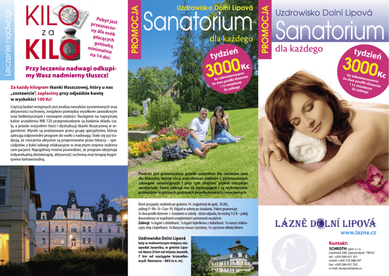 Sanatorium Sanatorium dla każdego ń tydzie Kc 0 0 0 3 Przy leczeniu nadwagi odkupimy Wasz nadmierny tłuszcz! owanie ie water 6x zak osiłki dzienn ap 5x dw x śniadanie i1 iegi 5x zab Za każdy kilogram tkanki tłuszczowej, który u nas „zostawicie”, zapłacimy przy odjeździe kwotę w wyskokści 100 Kc! PROMOCJA za PROMOCJA Leczenie nadwagi KILO KILO Pobyt j przezn est acz ny dla o osób płacący ch gotówk minima ą lnie na 14 d ni. Uzdrowisko Dolní Lipová Uzdrowisko Dolní Lipová dla każdego tydzie ń 3000K c 6x za 5x dw kwaterow anie a posił i 1x śn ki dziennie iad 5x zab anie iegi Częścią badań wstępnych jest analiza nawyków żywieniowych oraz aktywności ruchowej, związków pomiędzy wysiłkeim zawodowym oraz hobbistycznym i rozwojem otyłości. Następnie na najwyższej kalsie urzadzeniu INB 720 przeprowadzane są badania skladu ciala, a przede wszystkim ilości i dystrybucji tkanki tłuszczowej w organiźmie. Wyniki są analizowane przez grupę specjalistów, którzy zalecają odpowiedni program do walki z nadwagą. Stało się już tradycją, że ćwiczenia aktywne są proponowane przez lekarzy – specialjstów, z kolei zabiegi relaksacyjne w znacznym stopniu wybiera sam pacjent. Najogólniej można powiedzieć, że program obejmuje indywidualną dietoterapię, aktywność ruchową oraz terapię kognitywno-behawioralną. Produkt jest przeznaczony przede wszystkim dla seniorów oraz dla klientów, którzy chcą wypróbować niektóre z podstawowych zabiegów sanatoryjnych i przy tym obejrzeć piękne otoczenie sanatorium. Same zabiegi nie są wymagające i są wykonywane przeważnie w późnych godzinach popołudniowych i wieczornych. Dzień przyjazdu: niedziela po godzinie 14. (najpóźniej do godz. 20.00), zabiegi P–Wt–Śr–Czw–Pt. Odjazd w sobotę po śniadaniu. Pakiet gwarantuje: 5x dwa posiłki dziennie + śniadanie w sobotę - dzień odjazdu, 6x nocleg 1/2 B – pokój dwuosobowy ze wspólnymi urządzeniami sanitarnymi na piętrze. Zabiegi: 1x kąpiel z dodatkami, 1x kąpiel bąbelkowa z dodatkami, 1x masaż relaksacyjny stóp z bąbelkami, 1x klasyczny masaż częściowy, 1x częściowe okłady błotne. Uzdrowisko Dolní Lipová leży w malowniczym miejscu nieopodal Jeseniku, w gminie Lipová-lázne (3 km od miasta Jeseník, 7 km od wyciągów krzesełkowych Ramzova – 863 m n. m). www.lazne.cz Kontakt: SCHROTH, spol. s r. o. Lázeňská 248, Lipová-lázně 790 61 tel.: +420 584 421 351 mobil: +420 733 688 597 fax: +420 584 421 355 e-mail: [email protected] Uzdrowisko Dolní Lipová Pobyty relaksacyjne Do siedmiodniowych pakietów i pakietu Nawet się nie ruszę klient otrzyma BEZPŁATNIE 2-dniową ołomuniecką kartę turystyczną Olomouc region Card. Założycielem sanatorium był uzdrowiciel Johann Schroth. Jego oryginalna koncepcja, zwana często kuracją Schrotha, znalazła wielu kontynuatorow i rozsławiła sanatorium nie tylko na obszarze ówczesnych Austoro-Węgier, ale także w calej Europie. Z szacunku dla tradycji, terapia oczyszczająca przeprowadzana jest do dnia dzisiejszego, jednak pozostałe zabiegi lecznicze oparte są na najnowszych badaniach naukowych. Wszystkim naszym gościom, zarówno tym którzy przyjeżdżają do nas w celach leczniczych jak i relaksacyjnych, życzymy niezapomnianych wrażeń, które zachęcą ich do powrotu. Witamy Państwa v uzdrowisku Dolní Lipová! Te pobyty ze stałym programem umożliwiają pełne wykorzystanie czasu spędzonego w sanatorium do spełnienia celu każdego klienta. W tym roku można wybrać spośród następujących pakietów produktów: Aktualne informacje znajdą Państwo na stronie internetowej www.lazne.cz tami leczenia nadwagi. Częścią kuracji są konsultacje ze specjalistą w dziedzinie aktywności ruchowej. Analiza układu ruchu – 4 dniowy pobyt złożony z zabiegów relaksacyjnych bez wysiłku fizycznego. – 7 dniowy pobyt- na podstawie wstępnych badań, ustalana jest przyczynana bólu w układzie ruchu człowieka w tzw.ognisku bólu , które będzie leczone na podstawie odpowiedniej terapii. Poznawaj i relaksuj Relaks w sanatoriach Nigdzie się nie ruszę – pobyt siedmiodniowy, pakiet przeznaczony dla wszystkich, którzy chcą na własnej skórze poznać, co oznacza zdrowy styl życia. Chcę żyć zdrowiej – pobyt siedmiodniowy, pakiet przeznaczony dla wszystkich, którzy chcą na własnej skórze poznać, co oznacza zdrowy styl życia. Profilaktyka i leczenie nadwagi – 7 dniowy pobyt jest nastawiony na zapoznanie się z podstawowymi aspek- – pobyt trzydniowy, pakiet zawiera zabiegi relaksacyjne dla wszystkich kategorii wiekowych. Indywidualne leczenie – pobyt relaksacyjny – jeżeli nie interesuje Państwa żadna z wyżej wymienionych ofert, mogą Państwo skorzystać z indywidualnego programu leczniczego lub relaksacyjnego. Uczestnicząc w programie własnego autorstwa, mogą Państwo korzystać jedynie z zabiegów, które nie są częścią żadnego programu. Jak poznać atrakcje Jeseníku za DARMo? Z Olomouc region Card! Javorník (27 km) Zamek Jánský Vrch Muzeum miejskie Česká Ves (11 km) Ondrejovice (24 km) Adrenalin park (1 wybrana atrakcja) Hornický skansen, Zlatorudné mlýny Zlaté Hory (25,6 km) Rejvíz (18,2 km) Uzdrowisko Dolní Lipová Petríkov (10 km) Lipová-lázně (1 km) Muzeum Johanna Schrotha Letni tor saneczkowy (1 jazda) www.olomoucregioncard.cz Co to jest Olomouc region Card? Muzeum miejskie Mechové jezírko Jeseník (6 km) Muzeum krajoznawcze Velké Losiny (40 km) Zamek, Rucní papírna Korzystając z tych atrakcji nie wydadzą Państwo ani jednej korony a mogą zaoszczędzić min. 500Kc/za osobę JEDYNY PREZENT DO POBYTÓW RELAKSACYJNYCH W UZDROWISKU DOLNÍ LIPOVÁ Specjalna karta turystyczna, dzięki której otrzymają Państwo zniżki w ponad 195 miejscach w województwie ołomunieckim przez okres 5 dni. Wstęp do 79 atrakcji BEZPŁATNIE. Promocje w restauracjach, na basenach i w innych miejscach tego typu. Aktywacja kart