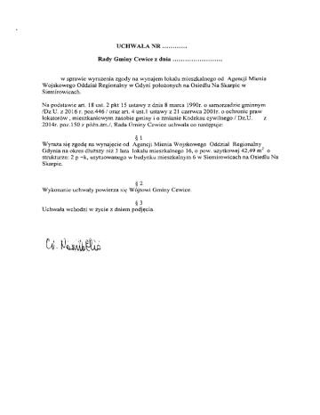 U C H W A Ł A NR Rady Gminy Cewice z dnia w sprawie wyrażenia zgody na wynajem lokalu mieszkalnego od Agencji Mienia Wojskowego Oddział Regionalny w Gdyni położonych na Osiedlu Na Skarpie w Siemirowicach. Na podstawie art. 18 ust. 2 pkt 15 ustawy z dnia 8 marca 1990r. o samorządzie gminnym /Dz.U. z 2016 r. poz.446 / oraz art. 4 ust.l ustawy z 21 czerwca 200lr. o ochronie praw lokatorów , mieszkaniowym zasobie gminy i o zmianie Kodeksu cywilnego / Dz.U. z 2014r. poz.150 z późn.zm./, Rada Gminy Cewice uchwala co następuje: §1 Wyraża się zgodę na wynajęcie od Agencji Mienia Wojskowego Oddział Regionalny Gdynia na okres dłuższy niż 3 lata lokalu mieszkalnego 16, o pow. użytkowej 42,49 m o strukturze: 2 p +k, usytuowanego w budynku mieszkalnym 6 w Siemirowicach na Osiedlu Na Skarpie. 2 §2 Wykonanie uchwały powierza się Wójtowi Gminy Cewice. §3 Uchwała wchodzi w życie z dniem podjęcia. UZASADNIENIE do uchwały Nr Rady Gminy Cewice z dnia Uchwała dotyczy wyrażenia zgody na wynajem lokalu mieszkalnego od Agencji Mienia Wojskowego Oddział Regionalny w Gdyni położonego na Osiedlu Na Skarpie w Siemirowicach. Zgodnie z art.4 ust. 1 ustawy z 21 czerwca 200lr. o ochronie praw lokatorów, mieszkaniowym zasobie gminy i o zmianie Kodeksu cywilnego /Dz.U. z 2014r. poz. 150 z późn. zm./, tworzenie warunków do zaspokojenia potrzeb mieszkaniowych wspólnoty samorządowej należy do zadań gminy. Gmina wykonuje w/w zadania wykorzystując mieszkaniowy zasób gminy lub w inny sposób. Zasadne jest wynajęcie 1 lokalu mieszkalnego z AMW Gdynia położonego na Osiedlu Na Skarpie w Siemirowicach na okres dłuższy niż 3 lata, ze względu na trudną sytuację mieszkaniową i dużą liczbę osób oczekujących na mieszkania komunalne. Pozyskanie tego mieszkania pozwoli na zaspokojenie potrzeb mieszkaniowych dla 1 rodziny, która po upływie okresu najmu będzie zobowiązana sama rozwiązać swoją sytuację mieszkaniową.