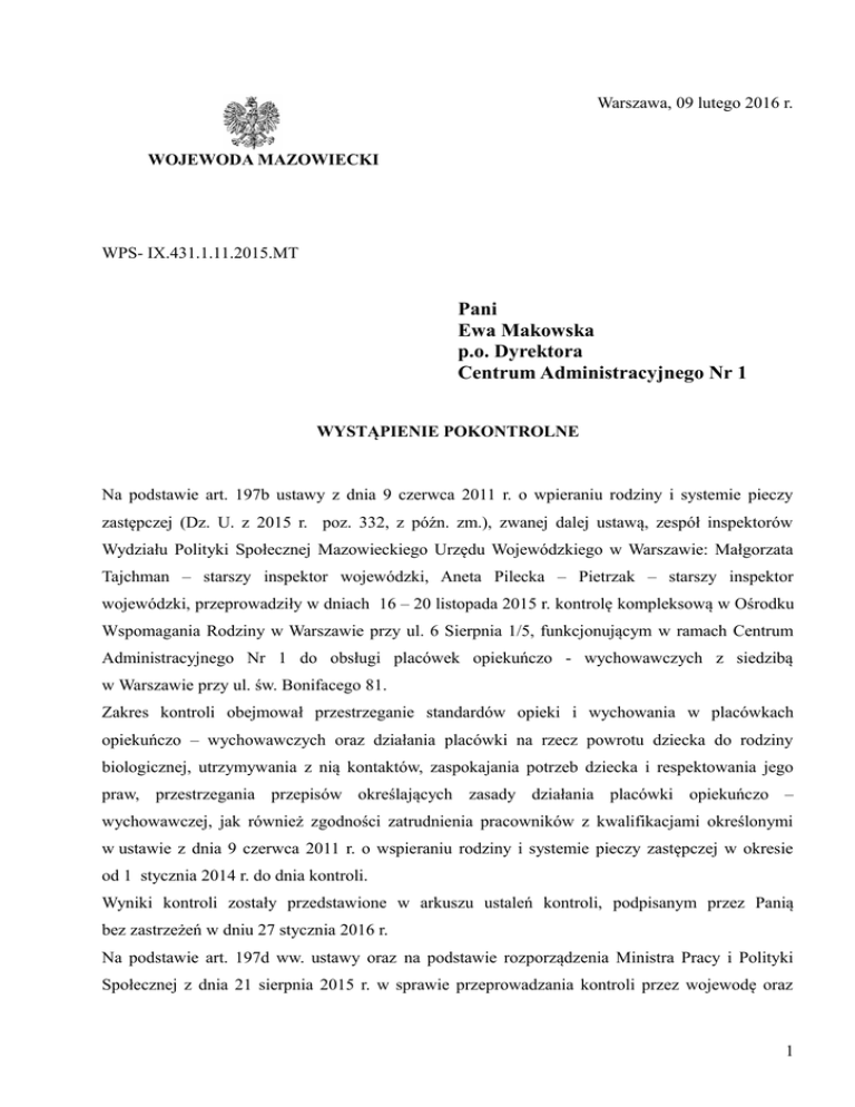 Warszawa, 09 lutego 2016 r. WOJEWODA MAZOWIECKI WPS- IX.431.1.11.2015.MT Pani Ewa Makowska p.o. Dyrektora Centrum Administracyjnego Nr 1 WYSTĄPIENIE POKONTROLNE Na podstawie art. 197b ustawy z dnia 9 czerwca 2011 r. o wpieraniu rodziny i systemie pieczy zastępczej (Dz. U. z 2015 r. poz. 332, z późn. zm.), zwanej dalej ustawą, zespół inspektorów Wydziału Polityki Społecznej Mazowieckiego Urzędu Wojewódzkiego w Warszawie: Małgorzata Tajchman – starszy inspektor wojewódzki, Aneta Pilecka – Pietrzak – starszy inspektor wojewódzki, przeprowadziły w dniach 16 – 20 listopada 2015 r. kontrolę kompleksową w Ośrodku Wspomagania Rodziny w Warszawie przy ul. 6 Sierpnia 1/5, funkcjonującym w ramach Centrum Administracyjnego Nr 1 do obsługi placówek opiekuńczo - wychowawczych z siedzibą w Warszawie przy ul. św. Bonifacego 81. Zakres kontroli obejmował przestrzeganie standardów opieki i wychowania w placówkach opiekuńczo – wychowawczych oraz działania placówki na rzecz powrotu dziecka do rodziny biologicznej, utrzymywania z nią kontaktów, zaspokajania potrzeb dziecka i respektowania jego praw, przestrzegania przepisów określających zasady działania placówki opiekuńczo – wychowawczej, jak również zgodności zatrudnienia pracowników z kwalifikacjami określonymi w ustawie z dnia 9 czerwca 2011 r. o wspieraniu rodziny i systemie pieczy zastępczej w okresie od 1 stycznia 2014 r. do dnia kontroli. Wyniki kontroli zostały przedstawione w arkuszu ustaleń kontroli, podpisanym przez Panią bez zastrzeżeń w dniu 27 stycznia 2016 r. Na podstawie art. 197d ww. ustawy oraz na podstawie rozporządzenia Ministra Pracy i Polityki Społecznej z dnia 21 sierpnia 2015 r. w sprawie przeprowadzania kontroli przez wojewodę oraz 1 wzoru legitymacji uprawniającej do przeprowadzania kontroli (Dz. U. z 2015 r. poz. 1477) przekazuję niniejsze wystąpienie pokontrolne. W ramach Ośrodka Wspomagania Rodziny działają: I i II grupa wychowawcza OWR z siedzibą w Warszawie przy ul. 6 Sierpnia 1/5, mieszkania: przy ul. Tynieckiej 18, Al. Niepodległości 132/136, ul. Gagarina31, ul. Koszykowej 20, budynku przy ul. św. Bonifacego 81A. Ośrodek Wspomagania Rodziny jest placówką typu socjalizacyjnego przewidzianą na 86 miejsc, z czego: 28 miejsc znajduje się w budynku głównym placówki przy ul. 6 Sierpnia 1/5 oraz 58 miejsc w mieszkaniach. W czasie kontroli w placówce umieszczonych było 86 wychowanków, w tym 29 w budynku przy ul. 6 Sierpnia 1/5 i 57 w mieszkaniach. Placówka działa w oparciu o statut i regulamin organizacyjny, których zapisy są zgodne z obowiązującymi przepisami oraz uwzględniają zapisy dotyczące praw dziecka. Regulamin Ośrodka Wspomagania Rodziny na dzień kontroli nie obejmował mieszkań przy ul. Koszykowej 20/ 7 i przy ul. Bonifacego 81A. Standardy świadczonych usług Ustaleń dokonano na podstawie przeprowadzonych rozmów z p.o. dyrektora Centrum Administracyjnego psychologiem, Nr 1, pedagogami, wychowawcami analizy – koordynatorami prowadzonej dokumentacji poszczególnych oraz oględzin mieszkań, Ośrodka Wspomagania Rodziny i mieszkań. W dniu kontroli limit miejsc, o którym mowa w art. 230 ustawy był przekroczony w grupie II OWR (jedno dziecko), mieszkaniu Al. Niepodległości (2 dzieci), mieszkaniu ul. Tynieckiej (1 dziecko). Do dnia kontroli wystąpiono z wnioskiem o przyjęcie ponad limit dotyczącym 2 wychowanków umieszczonych w budynku OWR przy ul. 6 Sierpnia 1/5. Ponadto w placówce przebywało 21 wychowanków w wieku poniżej lat 7, co jest niezgodne z art. 231 ustawy. Budynek główny OWR mieści się na I i II piętrze w jednym skrzydle budynku przy ul. 6 Sierpnia 1/5. W sąsiednim skrzydle mieści się Ośrodek Interwencji Kryzysowej. Zdaniem wychowawców – koordynatorów oraz p.o. dyrektora Centrum oraz kontrolujących, sąsiedztwo OIK znacznie utrudnia proces wychowawczy dzieci (wychowankowie są mimowolnymi świadkami awantur, interwencji policyjnych, palenia papierosów na balkonach, sytuacji przemocowych, itp.). Zgodnie z art. 93 ust. 4 pkt 1 ustawy z dnia 9 czerwca 2011 r. o wspieraniu rodziny i systemie pieczy zastępczej (Dz. U. z 2015 r. poz. 332, z późn. zm.) placówka opiekuńczo – wychowawcza zaspokaja niezbędne potrzeby dziecka, w szczególności emocjonalne (…). W związku z powyższym należy podjąć starania zmierzające do przeniesienia grup do innej lokalizacji, zapewniającej bardziej bezpieczne środowisko wychowawcze. 2 Z przeprowadzonego oglądu wynika, że pomieszczenia obydwu grup wymagają remontu: podłoga wymaga cyklinowania lub wymiany, zniszczona jest stolarka drzwiowa, meble, w szczególności tapczany wymagają wymiany, poprawy wymaga stan techniczny pomieszczeń, w szczególności łazienek (w łazienkach na II piętrze kabiny prysznicowe bez zasłon lub innego zabezpieczenia zapewniającego intymność), kuchenki są niewielkie: podgrzewanie i wydawanie posiłków a także mycie naczyń jest utrudnione (brak zmywarek). Placówka opiekuńczo – wychowawcza powinna zaspokajać potrzeby bytowe wychowanków zapewniając dzieciom m.in. łazienki z miejscem do prania i suszenia rzeczy osobistych i toalety, w ilości umożliwiającej korzystanie z nich w sposób zapewniający intymność i zgodność z zasadami higieny (§ 18 ust. 3 rozporządzenia Ministra Pracy i Polityki Społecznej z dnia 22 grudnia 2011 r. w sprawie instytucjonalnej pieczy zastępczej – Dz. U. Nr 292, poz. 1720). Liczba miejsc przewidzianych dla grupy II jest większa niż faktyczna liczba miejsc do spania: zgodnie z ustalonym limitem grupa dysponuje 14 miejscami, natomiast w czasie kontroli w pokojach tej grupy znajdowało się 13 miejsc do spania. Z udzielonych wyjaśnień wynikało, że taka liczba miejsc do spania wynika z faktu, że dzieci przebywają poza placówką: w młodzieżowych ośrodkach wychowawczych i młodzieżowych ośrodkach socjoterapii. Jednak zdaniem kontrolujących wychowanek, tymcza