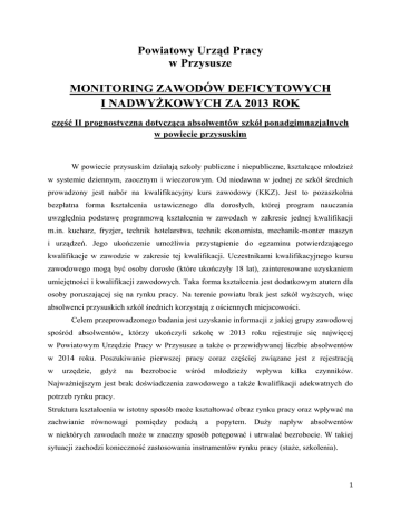 Powiatowy Urząd Pracy w Przysusze MONITORING ZAWODÓW DEFICYTOWYCH I NADWYŻKOWYCH ZA 2013 ROK część II prognostyczna dotycząca absolwentów szkół ponadgimnazjalnych w powiecie przysuskim W powiecie przysuskim działają szkoły publiczne i niepubliczne, kształcące młodzież w systemie dziennym, zaocznym i wieczorowym. Od niedawna w jednej ze szkół średnich prowadzony jest nabór na kwalifikacyjny kurs zawodowy (KKZ). Jest to pozaszkolna bezpłatna forma kształcenia ustawicznego dla dorosłych, której program nauczania uwzględnia podstawę programową kształcenia w zawodach w zakresie jednej kwalifikacji m.in. kucharz, fryzjer, technik hotelarstwa, technik ekonomista, mechanik-monter maszyn i urządzeń. Jego ukończenie umożliwia przystąpienie do egzaminu potwierdzającego kwalifikacje w zawodzie w zakresie tej kwalifikacji. Uczestnikami kwalifikacyjnego kursu zawodowego mogą być osoby dorosłe (które ukończyły 18 lat), zainteresowane uzyskaniem umiejętności i kwalifikacji zawodowych. Taka forma kształcenia jest dodatkowym atutem dla osoby poruszającej się na rynku pracy. Na terenie powiatu brak jest szkół wyższych, więc absolwenci przysuskich szkół średnich korzystają z ościennych miejscowości. Celem przeprowadzonego badania jest uzyskanie informacji z jakiej grupy zawodowej spośród absolwentów, którzy ukończyli szkołę w 2013 roku rejestruje się najwięcej w Powiatowym Urzędzie Pracy w Przysusze a także o przewidywanej liczbie absolwentów w 2014 roku. Poszukiwanie pierwszej pracy coraz częściej związane jest z rejestracją w urzędzie, gdyż na bezrobocie wśród młodzieży wpływa kilka czynników. Najważniejszym jest brak doświadczenia zawodowego a także kwalifikacji adekwatnych do potrzeb rynku pracy. Struktura kształcenia w istotny sposób może kształtować obraz rynku pracy oraz wpływać na zachwianie równowagi pomiędzy podażą a popytem. Duży napływ absolwentów w niektórych zawodach może w znaczny sposób potęgować i utrwalać bezrobocie. W takiej sytuacji zachodzi konieczność zastosowania instrumentów rynku pracy (staże, szkolenia). 1 ABSOLWENCI ZAREJESTROWANI W PUP W POWIECIE PRZYSUSKIM WEDŁUG SZKÓŁ I ZAWODÓW W ROKU 2013 ORAZ PRZEWIDYWANI ABSOLWENCI W ROKU 2014 T-1 Lp Nazwa szkoły 1 1 2 3 4 Absolwenci, którzy ukończyli Kod szkołę w zawodu Nazwa zawodu roku 2013 2 3 4 5 Szkoły policealne Prywatna Szkoła Policealna dla Dorosłych w Skrzyńsku Szkoła Policealna dla Dorosłych w Borkowicach Zaoczna Policealna Szkoła Zawodowa dla Dorosłych w Przysusze Zaoczna Policealna Szkoła Zawodowa dla Dorosłych w Przysusze Technikum w 5 Przysusze Technikum Uzupełniające dla Dorosłych Towarzystwa Wiedzy Powszechnej 6 w Przysusze Technikum w 7 Lipinach Technikum w 8 Lipinach Technikum Uzupełniające dla Dorosłych Towarzystwa Wiedzy Powszechnej 9 w Przysusze Technikum w 10 Borkowicach Technikum w 11 Borkowicach Szkoła Muzyczna I stopnia im. Oskara Kolberga w 12 Ruszkowicach Technikum w 13 Przysusze Technik "334306" administracji* Bezrobotni absolwenci zarejestrowani w PUP w Przewidywani końcu roku absolwenci w (6):(5) 2013 roku 2014 w% 6 7 8 4 0 18 0 "314207" Technik rolnik* 14 0 0 0 Technik bezpieczeństwa i "325509" higieny pracy* 0 0 29 0 27 0 16 0 Technik "334306" administracji* 30 0 Szkoły średnie techniczne (technika, licea zawodowe) Technik "351203" informatyk* 20 0 Technik żywienia i gospodarstwa "322002" domowego* Technik "331403" ekonomista* Technik obsługi 422103 turystycznej Technik "311504" mechanik* Technik "331402" agrobiznesu* Technik "422402" hotelarstwa* 343602 000000 Muzyk Inny zawód lub brak zawodu 12 0 0 0 20 4 12 20 0 0 0 0 11 0 0 0 9 2 9 22,2 10 0 16 0 0 0 12 0 0 0 0 0 2 Technikum w 14 Przysusze Technikum w 15 Przysusze Technikum w 16 Przysusze Technikum w 17 Przysusze Technikum w 18 Przysusze Technikum Uzupełniające dla Dorosłych w 19 Przysusze Technikum Uzupełniające dla Dorosłych w 20 Przysusze 21 22 23 24 25 26 27 28 29 30 31 Liceum Profilowane w Przysusze Liceum Ogólnokształcące w Borkowicach Liceum Ogólnokształcące w Lipinach Liceum Ogólnokształcące w Przysusze Liceum Ogólnokształcące Dla Dorosłych Prywatne Liceum Ogólnokształcące w Mariówce Zaoczne Prywatne Liceum Ogólnokształcące Dla Dorosłych w Skrzyńsku Liceum Ogólnokształcące w Przysusze Zaoczne Liceum Ogólnokształcące Dla Dorosłych w Przysusze Zaoczne Uzupełniające Liceum Ogólnokształcące Dla Dorosłych W Przysusze Uzupełniające Zaoczne Prywatne Liceum Technik "311504" mechanik* Technik żywienia i gospodarstwa "322002" domowego* Technik 331403 ekonomista Technik "422402" hotelarstwa* Technik usług 514105 fryzjerskich 36 6 18 16,7 32 8 20 25 0 0 0 0 41 3 34 7,3 0 0 0 0 311504 Technik mechanik 0 0 6 0 322002 Technik żywienia i gospodarstwa domowego 0 0 14 0 6 0 31,6 0 0 0 5 48 14,3 26 191 14,7 0 39 0 0 16 0 17 2 27 11,8 21 0 26 0 0 0 39 0 17 0 0 0 20 0 0 0 000000 "000000" "000000" "000000" "000000" "000000" Licea ogólnokształcące Inny zawód lub brak zawodu 19 Inny zawód lub brak zawodu 0 Inny zawód lub brak zawodu 35 Inny zawód lub brak zawodu 177 Inny zawód lub brak zawodu 0 Inny zawód lub brak zawodu 12 Inny zawód lub brak zawodu "000000" Inny zawód lub brak zawodu "000000" Inny zawód lub brak zawodu "000000" Inny zawód lub brak zawodu "000000" Inny zawód lub "000000" 3 Ogólnokształcące Dla Dorosłych W Skrzyńsku brak zawodu Zasadnicze szkoły zawodowe 32 33 34 35 36 37 38 39 40 41 42 43 44 45 46 47 48 Szkoła Zawodowa Specjalna w Kolonii Szczerbackiej Zasadnicza Szkoła Specjalna w Kolonii Ossa Zasadnicza Szkoła Zawodowa w Lipinach Zasadnicza Szkoła Zawodowa w Lipinach Zasadnicza Szkoła Zawodowa w Lipinach Zasadnicza Szkoła Zawodowa w Przysusze Zasadnicza Szkoła Zawodowa w Przysusze Zasadnicza Szkoła Zawodowa w Przysusze Zasadnicza Szkoła Zawodowa w Przysusze Zasadnicza Szkoła Zawodowa w Przysusze Zasadnicza Szkoła Zawodowa w Przysusze Zasa