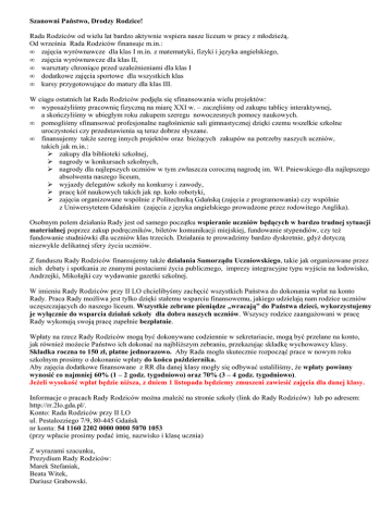 Szanowni Państwo, Drodzy Rodzice! Rada Rodziców od wielu lat bardzo aktywnie wspiera nasze liceum w pracy z młodzieŜą. Od września Rada Rodziców finansuje m.in.: • zajęcia wyrównawcze dla klas I m.in. z matematyki, fizyki i języka angielskiego, • zajęcia wyrównawcze dla klas II, • warsztaty chroniące przed uzaleŜnieniami dla klas I • dodatkowe zajęcia sportowe dla wszystkich klas • kursy przygotowujące do matury dla klas III. W ciągu ostatnich lat Rada Rodziców podjęła się sfinansowania wielu projektów: • wyposaŜyliśmy pracownię fizyczną na miarę XXI w. – zaczęliśmy od zakupu tablicy interaktywnej, a skończyliśmy w ubiegłym roku zakupem szeregu nowoczesnych pomocy naukowych. • pomogliśmy sfinansować profesjonalne nagłośnienie sali gimnastycznej dzięki czemu wszelkie szkolne uroczystości czy przedstawienia są teraz dobrze słyszane. • finansujemy takŜe szereg innych projektów oraz bieŜących zakupów na potrzeby naszych uczniów, takich jak m.in.: zakupy dla biblioteki szkolnej, nagrody w konkursach szkolnych, nagrody dla najlepszych uczniów w tym zwłaszcza coroczną nagrodę im. Wł. Pniewskiego dla najlepszego absolwenta naszego liceum, wyjazdy delegatów szkoły na konkursy i zawody, pracę kół naukowych takich jak np. koło robotyki, zajęcia organizowane wspólnie z Politechniką Gdańską (zajęcia z programowania) czy wspólnie z Uniwersytetem Gdańskim (zajęcia z języka angielskiego prowadzone przez rodowitego Anglika). Osobnym polem działania Rady jest od samego początku wspieranie uczniów będących w bardzo trudnej sytuacji materialnej poprzez zakup podręczników, biletów komunikacji miejskiej, fundowanie stypendiów, czy teŜ fundowanie studniówki dla uczniów klas trzecich. Działania te prowadzimy bardzo dyskretnie, gdyŜ dotyczą niezwykle delikatnej sfery Ŝycia uczniów. Z funduszu Rady Rodziców finansujemy takŜe działania Samorządu Uczniowskiego, takie jak organizowane przez nich debaty i spotkania ze znanymi postaciami Ŝycia publicznego, imprezy integracyjne typu wyjścia na lodowisko, Andrzejki, Mikołajki czy wydawanie gazetki szkolnej. W imieniu Rady Rodziców przy II LO chcielibyśmy zachęcić wszystkich Państwa do dokonania wpłat na konto Rady. Praca Rady moŜliwa jest tylko dzięki stałemu wsparciu finansowemu, jakiego udzielają nam rodzice uczniów uczęszczających do naszego liceum. Wszystkie zebrane pieniądze „wracają” do Państwa dzieci, wykorzystujemy je wyłącznie do wsparcia działań szkoły dla dobra naszych uczniów. Wszyscy rodzice zaangaŜowani w pracę Rady wykonują swoją pracę zupełnie bezpłatnie. Wpłaty na rzecz Rady Rodziców mogą być dokonywane codziennie w sekretariacie, mogą być przelane na konto, jak równieŜ moŜecie Państwo ich dokonać na najbliŜszym zebraniu, przekazując składkę wychowawcy klasy. Składka roczna to 150 zł, płatne jednorazowo. Aby Rada mogła skutecznie rozpocząć prace w nowym roku szkolnym prosimy o dokonanie wpłaty do końca października. Aby zajęcia dodatkowe finansowane z RR dla danej klasy mogły się odbywać ustaliliśmy, Ŝe wpłaty powinny wynosić co najmniej 60% (1 – 2 godz. tygodniowo) oraz 70% (3 – 4 godz. tygodniowo). JeŜeli wysokość wpłat będzie niŜsza, z dniem 1 listopada będziemy zmuszeni zawiesić zajęcia dla danej klasy. Informacje o pracach Rady Rodziców moŜna znaleźć na stronie szkoły (link do Rady Rodziców) lub po adresem: http://rr.2lo.gda.pl/. Konto: Rada Rodziców przy II LO ul. Pestalozziego 7/9, 80-445 Gdańsk nr konta: 54 1160 2202 0000 0000 5070 1053 (przy wpłacie prosimy podać imię, nazwisko i klasę ucznia) Z wyrazami szacunku, Prezydium Rady Rodziców: Marek Stefaniak, Beata Witek, Dariusz Grabowski.