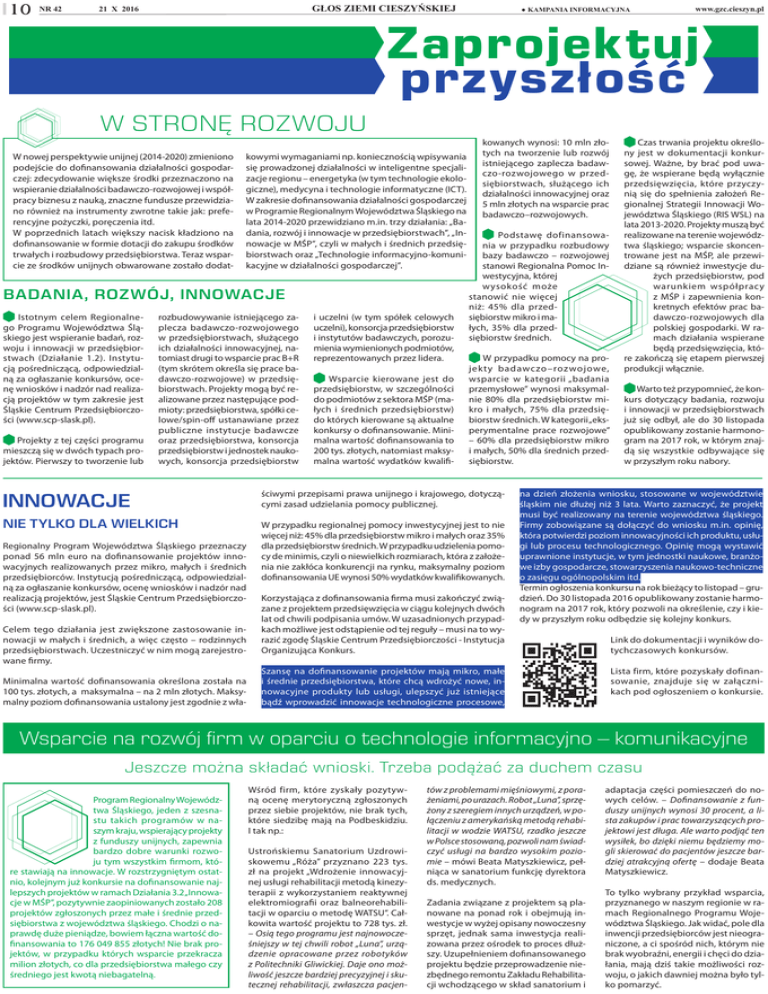 10 NR 42 GŁOS ZIEMI CIESZYŃSKIEJ 21 X 2016 ● KAMPANIA INFORMACYJNA www.gzc.cieszyn.pl Zaprojektuj przyszłość W STRONĘ ROZWOJU W nowej perspektywie unijnej (2014-2020) zmieniono podejście do dofinansowania działalności gospodarczej: zdecydowanie większe środki przeznaczono na wspieranie działalności badawczo-rozwojowej i współpracy biznesu z nauką, znaczne fundusze przewidziano również na instrumenty zwrotne takie jak: preferencyjne pożyczki, poręczenia itd. W poprzednich latach większy nacisk kładziono na dofinansowanie w formie dotacji do zakupu środków trwałych i rozbudowy przedsiębiorstwa. Teraz wsparcie ze środków unijnych obwarowane zostało dodat- kowymi wymaganiami np. koniecznością wpisywania się prowadzonej działalności w inteligentne specjalizacje regionu – energetyka (w tym technologie ekologiczne), medycyna i technologie informatyczne (ICT). W zakresie dofinansowania działalności gospodarczej w Programie Regionalnym Województwa Śląskiego na lata 2014-2020 przewidziano m.in. trzy działania: „Badania, rozwój i innowacje w przedsiębiorstwach”, „Innowacje w MŚP”, czyli w małych i średnich przedsiębiorstwach oraz „Technologie informacyjno-komunikacyjne w działalności gospodarczej”. BADANIA, ROZWÓJ, INNOWACJE Istotnym celem Regionalnego Programu Województwa Śląskiego jest wspieranie badań, rozwoju i innowacji w przedsiębiorstwach (Działanie 1.2). Instytucją pośredniczącą, odpowiedzialną za ogłaszanie konkursów, ocenę wniosków i nadzór nad realizacją projektów w tym zakresie jest Śląskie Centrum Przedsiębiorczości (www.scp-slask.pl). Projekty z tej części programu mieszczą się w dwóch typach projektów. Pierwszy to tworzenie lub rozbudowywanie istniejącego zaplecza badawczo-rozwojowego w przedsiębiorstwach, służącego ich działalności innowacyjnej, natomiast drugi to wsparcie prac B+R (tym skrótem określa się prace badawczo-rozwojowe) w przedsiębiorstwach. Projekty mogą być realizowane przez następujące podmioty: przedsiębiorstwa, spółki celowe/spin-off ustanawiane przez publiczne instytucje badawcze oraz przedsiębiorstwa, konsorcja przedsiębiorstw i jednostek naukowych, konsorcja przedsiębiorstw i uczelni (w tym spółek celowych uczelni), konsorcja przedsiębiorstw i instytutów badawczych, porozumienia wymienionych podmiotów, reprezentowanych przez lidera. Wsparcie kierowane jest do przedsiębiorstw, w szczególności do podmiotów z sektora MŚP (małych i średnich przedsiębiorstw) do których kierowane są aktualne konkursy o dofinansowanie. Minimalna wartość dofinansowania to 200 tys. złotych, natomiast maksymalna wartość wydatków kwalifi- kowanych wynosi: 10 mln złotych na tworzenie lub rozwój istniejącego zaplecza badawczo-rozwojowego w przedsiębiorstwach, służącego ich działalności innowacyjnej oraz 5 mln złotych na wsparcie prac badawczo–rozwojowych. Podstawę dofinansowania w przypadku rozbudowy bazy badawczo – rozwojowej stanowi Regionalna Pomoc Inwestycyjna, której wysokość może stanowić nie więcej niż: 45% dla przedsiębiorstw mikro i małych, 35% dla przedsiębiorstw średnich. W przypadku pomocy na projekty badawczo –roz wojowe, wsparcie w kategorii „badania przemysłowe” wynosi maksymalnie 80% dla przedsiębiorstw mikro i małych, 75% dla przedsiębiorstw średnich. W kategorii „eksperymentalne prace rozwojowe” – 60% dla przedsiębiorstw mikro i małych, 50% dla średnich przedsiębiorstw. INNOWACJE ściwymi przepisami prawa unijnego i krajowego, dotyczącymi zasad udzielania pomocy publicznej. NIE TYLKO DLA WIELKICH W przypadku regionalnej pomocy inwestycyjnej jest to nie więcej niż: 45% dla przedsiębiorstw mikro i małych oraz 35% dla przedsiębiorstw średnich. W przypadku udzielenia pomocy de minimis, czyli o niewielkich rozmiarach, która z założenia nie zakłóca konkurencji na rynku, maksymalny poziom dofinansowania UE wynosi 50% wydatków kwalifikowanych. Regionalny Program Województwa Śląskiego przeznaczy ponad 56 mln euro na dofinansowanie projektów innowacyjnych realizowanych przez mikro, małych i średnich przedsiębiorców. Instytucją pośredniczącą, odpowiedzialną za ogłaszanie konkursów, ocenę wniosków i nadzór nad realizacją projektów, jest Śląskie Centrum Przedsiębiorczości (www.scp-slask.pl). Celem tego działania jest zwiększone zastosowanie innowacji w małych i średnich, a więc często – rodzinnych przedsiębiorstwach. Uczestniczyć w nim mogą zarejestrowane firmy. Minimalna wartość dofinansowania określona została na 100 tys. złotych, a maksymalna – na 2 mln złotych. Maksymalny poziom dofinansowania ustalony jest zgodnie z wła- Korzystająca z dofinansowania firma musi zakończyć związane z projektem przedsięwzięcia w ciągu kolejnych dwóch lat od chwili podpisania umów. W uzasadnionych przypadkach możliwe jest odstąpienie od tej reguły – musi na to wyrazić zgodę Śląskie Centrum Przedsiębiorczości - Instytucja Organizująca Konkurs. Czas trwania projektu określony jest w dokumentacji konkursowej. Ważne, by brać pod uwagę, że wspierane będą wyłącznie przedsięwzięcia, które przyczynią się do spełnienia założeń Regionalnej Strategii Innowacji Województwa Śląskiego (RIS WSL) na lata 2013-2020. Projekty muszą być realizowane na terenie województwa śląskiego; wsparcie skoncentrowane jest na MŚP, ale przewidziane są również inwestycje dużych przedsiębiorstw, pod warunkiem współpracy z MŚP i zapewnienia konkretnych efektów prac badawczo-rozwojowych dla polskiej gospodarki. W ramach działania wspierane będą przedsięwzięcia, które zakończą się etapem pierwszej produkcji włącznie. Warto też przypomnieć, że konkurs dotyczący badania, rozwoju i innowacji w przedsiębiorstwach już się odbył, ale do 30 listopada opublikowany zostanie harmonogram na 2017 rok, w którym znajdą się wszystkie odbywają