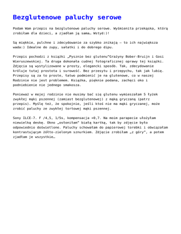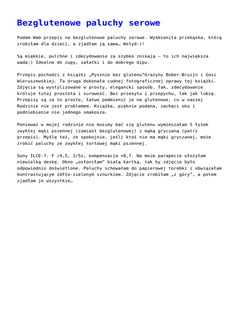 Bezglutenowe paluchy serowe Podam Wam przepis na bezglutenowe paluchy serowe. Wyśmienita przekąska, którą zrobiłam dla dzieci, a zjadłam ją sama… Wstyd:)! Są miękkie, pulchne i zdecydowanie za szybko znikają – to ich największa wada:) Idealne do zupy, sałatki i do dobrego dipu. Przepis pochodzi z książki „Pysznie bez glutenu”Grażyny Bober-Bruijn i Gosi Wieruszewskiej. Ta druga dokonała cudnej fotograficznej oprawy tej książki. Zdjęcia są wystylizowane w prosty, elegancki sposób. Tak, zdecydowanie króluje tutaj prostota i surowość. Bez przesytu i przepychu, tak jak lubię. Przepisy są za to proste, łatwo podmienić je na glutenowe, co w naszej Rodzinie nie jest problemem. Książka, pięknie podana, zachęci oko i podniebienie nie jednego smakosza. Ponieważ w mojej rodzinie nie musimy bać się glutenu wymieszałam 5 łyżek zwykłej mąki pszennej (zamiast bezglutenowej) z mąką gryczaną (patrz przepis). Myślę też, że spokojnie, jeśli ktoś nie ma mąki gryczanej, może zrobić paluchy ze zwykłej tortowej mąki pszennej. Sony ILCE-7. F /4,5, 1/5s, kompensacja +0,7. Na moim parapecie ułożyłam niewielką deskę. Okno „osłoniłam” białą kartką, tak by zdjęcie było odpowiednio doświetlone. Paluchy schowałam do papierowej torebki i obwiązałam kontrastującym żółto-zielonym sznurkiem. Zdjęcie zrobiłam „z góry”, a potem zjadłam je wszystkie… Składniki na około 15 sztuk paluchów: 5 łyżek mąki bezglutenowej, 3 łyżki bezglutenowej mąki gryczanej, 4 łyżki masła, 4 łyżki białego sera, 1/2 łyżeczki bezglutenowego proszku do pieczenia sezam lub sól do oprószenia paluchów Przygotowanie paluchów 1. W misie robota kuchennego zagnieć ciasto z wszystkich składników. Ciasto może być luźne. 2. Blat kuchenny podsyp mąką. 3. Urwij kawałek ciasta wielkości orzecha włoskiego i rozwałkuj go między palcami na blacie podsypanym mąką, tak by wyszedł z tego wałeczek. Powtarzaj do zakończenia ciasta. 4. Na blaszce wyłożonej papierem do pieczenia wysyp sezam lub sól i obtocz w nich paluszki. 5. Piecz w temperaturze 180 stopni przez około 15 minut. 6. Smacznego!
