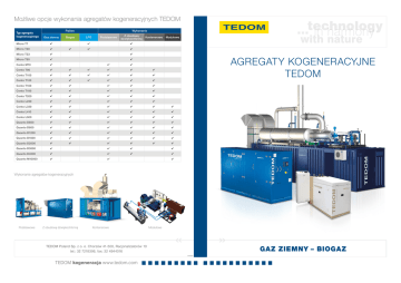 Możliwe opcje wykonania agregatów kogeneracyjnych TEDOM Typ agregatu kogeneracyjnego Micro T7 Paliwo Gaz ziemny Biogaz Wykonanie LPG Podstawowe Z obudową dźwiękochłonną Micro T30 Micro T33 Micro T50 Cento M70 Cento T80 Cento T100 Cento T120 Kontenerowe Modułowe AGREGATY KOGENERACYJNE TEDOM Cento T160 Cento T180 Cento T200 Cento L230 Cento L330 Cento L410 Cento L500 Quanto D600 Quanto D800 Quanto D1200 Quanto D1600 Quanto D2000 Quanto D3000 Quanto D4000 Quanto M10000 Wykonanie agregatów kogeneracyjnych Podstawowe Z obudową dźwiękochłonną Kontenerowe Modułowe TEDOM Poland Sp. z o. o. Chorzów 41-500, Racjonalizatorów 10 tel.: 32 7218396, fax: 32 4944016 GAZ ZIEMNY – BIOGAZ 911701031 TEDOM kogeneracja www.tedom.com Podstawowe dane techniczne – GAZ ZIEMNY Produkcja Typ agregatu energii kogeneracyjnego elektrycznej Micro T7 2 Produkcja ciepła (kW) Efektywnośc elektryczna (%) Efektywność cieplna (%) Całkowita efektywność (%) standardní zwiększona 1 standardní zwiększona 1 Podstawowe dane techniczne – BIOGAZ Wartość opałowa (kW) Typ agregatu kogeneracyjnego Produkcja energii elektrycznej (kW) Produkcja ciepła (kW) Efektywnośc elektryczna (%) Efektywność cieplna (%) Całkowita efektywność (%) Wartość opałowa (kW) (kW) standardní zwiększona 1 6,5 16,0 18,4 27,0 66,3 76,4 93,3 103,4 24,1 Micro T30 2 25 47,5 31,6 60 91,6 79,1 2,4 30 61 30,7 62,4 93,1 97,7 Micro T30 2 30 59,4 69 32,0 63,3 73,6 95,3 105,6 93,8 Micro T30 Micro T33 2,3 33 63,7 74,2 32,5 62,8 73,1 95,3 105,6 101,5 Cento T80 83 121 35,0 50,9 85,9 237 Micro T50 2 48 91,0 106,8 32,5 61,6 72,2 94,1 104,7 148 Cento T100 106 143 36,4 49,2 85,6 291 Cento M70 70 109 – 34,3 53,4 – 87,7 – 204 Cento T120 124 165 36,9 49,2 86,1 336 Cento T80 81 120 126 35,1 52,2 54,5 87,3 89,6 231 Cento T160 166 217 37,8 49,5 87,3 439 Cento T100 104 142 149 36,9 50,5 52,8 87,4 89,7 282 Cento T180 182 224 39,1 48,1 87,2 465 Cento T120 125 177 185 36,4 51,7 54,0 88,1 90,4 343 Cento T200 200 245 39,2 48,1 87,3 510 Cento T160 164 221 232 37,8 50,9 53,4 88,7 91,2 434 Cento L230 235 269 40,5 46,4 86,9 580 Cento T180 184 232 244 39,2 49,5 52,0 88,7 91,2 469 Cento L330 331 375 40,9 46,3 87,2 810 Cento T200 200 253 266 39,2 49,5 52,1 88,7 91,3 510 Cento L410 410 487 40,8 48,6 89,4 1004 Cento L230 235 282 301 41,5 49,7 53,0 91,2 94,5 567 Cento L500 500 566 41,9 47,4 89,3 1193 Cento L330 326 406 429 39,7 49,5 52,2 89,2 91,9 820 Quanto D600 600 645 42,7 45,9 88,6 1405 Cento L410 410 511 540 40,8 50,9 53,8 91,7 94,6 1004 Quanto D800 800 858 42,8 45,9 88,7 1868 Cento L500 500 592 626 42,0 49,6 52,5 91,6 94,5 1191 Quanto D1200 1200 1344 42,1 47,1 89,2 2852 Quanto D500 515 556 595 43,2 46,6 49,9 89,8 89,5 1192 Quanto D1600 1560 1771 41,8 47,4 89,2 3734 Quanto D600 600 699 743 41,9 48,7 51,8 90,6 93,7 1433 Quanto D2000 2000 2157 42,9 46,2 89,1 4667 Quanto D800 800 917 976 42,3 48,5 51,6 90,8 93,9 1891 Quanto D1200 1200 1295 1381 43,7 47,1 50,2 90,8 93,9 2748 Quanto D1600 1560 1709 1818 43,3 47,5 50,5 90,8 93,8 3600 Quanto D2000 2000 2154 2291 43,7 47,1 50,0 90,8 93,7 4577 Zużycie gazu jest podane z tolerancją zgodną z ISO 3046-1. Podany typ biogazu zawiera także inne paliwa wyprodukowane metodą biologicznej fermentacji – np. gaz z nawozu lub gaz wysypiskowy. Quanto D3000 3333 3577 3740 43,6 46,8 48,9 90,3 92,5 7650 Quanto D4000 4500 4679 4904 44,3 46,0 48,3 90,3 92,6 10160 Przedstawione dane są tylko informacjami ogólnymi. Skonsultuj się z firmą TEDOM w Czechach lub z autoryzowanym reprezentantem TEDOM w innych krajach (w polsce TEDOM Poland) aby uzyskać dokładniejsze dane. Wszelkie prawa do zmiany specyfikacji zastrzeżone. Tedom jest zarejestrowany pod nazwą TEDOM a.s. Quanto M10000 10426 9825 – 47,0 44,3 – 91,3 – 22176 Mozliwe jest umieszczenie większej ilości agregatów w jednym kontenerze. Dane techniczne oraz konfiguracja agregatów sa dostępne na życzenie. Uwagi do danych we wszystkich tabelach: Do wybranych jednostek oferujemy wersję o emisji NOx poniżej 100 mg/m 3. 1. 2. 3. 4. Przy użyciu dodatkowego wymiennika spalin Jednostka jest sklasyfikowana do sezonowej klasy energooszczędności A++ W programie Start Mieszanka stechiometryczna Issued 01/2017