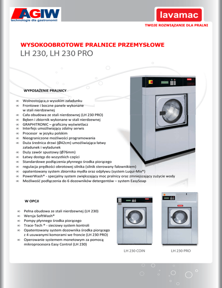 TWOJE ROZWIĄZANIE DLA PRALNI WYSOKOOBROTOWE PRALNICE PRZEMYSŁOWE LH 230, LH 230 PRO WYPOSAŻENIE PRALNICY • • • • • • • • • • • • • • • • Wolnostojąca,o wysokim załadunku Frontowe i boczne panele wykonane w stali nierdzewnej Cała obudowa ze stali nierdzewnej (LH 230 PRO) Bęben i zbiornik wykonane w stali nierdzewnej GRAPHITRONIC – graficzny wyświetlacz Interfejs umożliwiający zdalny serwis Procesor w jezyku polskim Nieograniczone możliwości programowania Duża średnica drzwi (Ø42cm) umożliwiająca łatwy załadunek i wyładunek Duży zawór spustowy (Ø76mm) Łatwy dostęp do wszystkich części Standardowe podłączenia płynnego środka piorącego regulacja prędkości obrotowej silnika (silnik sterowany falownikiem) opatentowany system zbiornika mydła oraz odpływu (system Luqui-Mix®) PowerWash® - specjalny system zwiększający moc pralnicy oraz zmniejszający zużycie wody Możliwość podłączenia do 6 dozowników detergentów – system EasySoap W OPCJI • • • • • • Pełna obudowa ze stali nierdzewnej (LH 230) Wersja SoftWash® Pompy płynnego środka piorącego Trace-Tech ® - sieciowy system kontroli Opatentowany system dozownika środka piorącego z 4 usuwanymi komorami we froncie (LH 230 PRO) Operowanie systemem monetowym za pomocą mikroprocesora Easy Control (LH 230) LH 230 COIN LH 230 PRO Typ Pojemność: Pojemność bębna Pojemność Średnica bębna L Kg mm Silnik: Kontrola falownikiem Prędkość bębna: Prędkość prania Prędkość wirowania G-factor Rpm Rpm LH 230 PRO 220 22 Ø750 220 22 Ø750 w standardzie w standardzie 42 860 310 42 860 310 Programator: Graphitronic – w pełni kontrolowany mikroprocesor Mikroprocesor Easy Control w standardzie w standardzie standard w wersji na monety - Obudowa: Kolorowe boczne panele Stal nierdzewna AISI 304 w standardzie + w standardzie Bezpieczne zamocowanie śruba 4 x M10 śruba 4 x M10 90 18 3-8 90 18 3-8 1x220-240V 50/60Hz 3x380-415V+N 50/60 Hz ¾” ½” 1x220-240V 50/60Hz 3x380-415V+N 50/60 Hz ¾” ½” 1435x900x1115 1625x900x1150 Grzanie: 100% gorąca woda 100% elektrycznie Wysokie ciśnienie parowe ˚C kW bar Podłączenie: Elektryczne Cale Cale Wodne Parowe Wymiary: HxWxD Transport: Waga brutto Waga netto Wymiary paczki Kg Kg mm FRONT LH 230 4 LH 230 3 SIDE LH 230 2 690 650 1620x975x1200 750 670 1920x1030x1280 BACK LH 230 1 1 5 6 1 9 10 8 7 11 4 3 2 SIDE LH 230 PRO BACK LH 230 PRO 5 6 1 9 10 8 7 11 cation in this leaflet at any time, d 06-2009/532444 FRONT LH 230 PRO 1. Zbiornik środka piorącego 2. Klawiatura 3. Wyłącznik awaryjny 4. Wyłącznik serwisowy 5. Podłączenie elektryczne 6. Wyłącznik główny 7. Elektryczne podłączenie środka piorącego 8. Podłączenie pompy płynnego środka piorącego 9. Wentylacja 10. Podłączenie wodne 11. Zawór spustowy