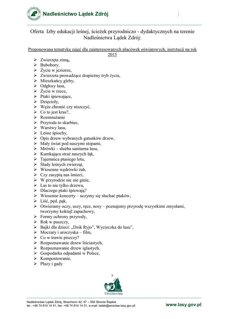 Nadleśnictwo Lądek Zdrój Oferta Izby edukacji leśnej, ścieżek przyrodniczo - dydaktycznych na terenie Nadleśnictwa Lądek Zdrój: Proponowana tematyka zajęć dla zainteresowanych placówek oświatowych, instytucji na rok 2015 Zwierzęta zimą, Bubobory, Życie w jeziorze, Zwierzeta prowadzące drapieżny tryb życia, Mieszkańcy gleby, Odgłosy lasu, Życie w rzece, Ptaki śpiewające, Dzięcioły, Węże chronić czy niszczyć, Co to jest kras?, Rozmnażanie Przyroda to skarbiec, Warstwy lasu, Leśne śpiochy, Opis drzew wybranych gatunków drzew, Mały świat pod naszymi stopami, Mrówki – służba sanitarna lasu, Kumkająca straż naszych łąk, Tajemnica ptasiego lotu, Ślady leśnych zwierząt, Wiosenne wędrówki żab, Czy zasypią nas śmieci, W przyrodzie nic nie ginie, Las to nie tylko drzewa, Dlaczego ptaki śpiewają? Wiosenne koncerty – uczymy się słuchać ptaków, Liść, pęd, pąk, Otwieramy oczy, uszy, ręce, nosy – poznajemy przyrodę wszystkimi zmysłami, tworzymy koktajl zapachowy, Formy ochrony przyrody, Rok w puszczy, Bajki dla dzieci: „Dzik Ryjo”, Wycieczka do lasu”, Moczary i uroczyska – film, Co w trawie piszczy? Rozpoznawanie drzew liściastych, Rozpoznawanie drzew iglastych, Gospodarka odpadami w Polsce, Kompostowanie, Płazy i gady 1 Nadleśnictwo Lądek Zdrój, Strachocin 42, 57 – 550 Stronie Śląskie tel.: +48 74 814 14 41, fax: +48 74 814 14 51, e-mail: [email protected] www.lasy.gov.pl Nadleśnictwo Lądek Zdrój Zajęcia terenowe: Ścieżka przyrodniczo – dydaktyczna w Starym Gierałtowie, Ścieżka przyrodniczo – dydaktyczna Kletno – Śnieżnik, Ścieżka przyrodniczo – dydaktyczna Przełęcz Puchaczówka – Hala pod Śnieżnikiem, Ścieżka krasowa w Kletnie, Ścieżka przyrodnicza przez Ułęże na Górę Borówkową Szkółka leśna w Strachocinie. 2 Nadleśnictwo Lądek Zdrój, Strachocin 42, 57 – 550 Stronie Śląskie tel.: +48 74 814 14 41, fax: +48 74 814 14 51, e-mail: [email protected] www.lasy.gov.pl
