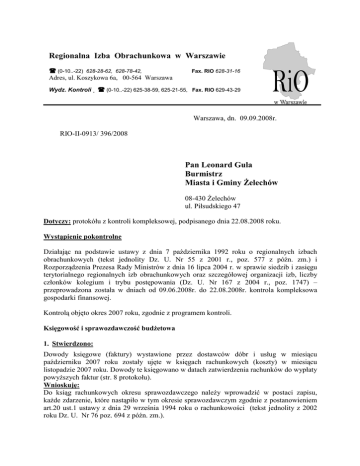 Regionalna Izba Obrachunkowa w Warszawie (0-10..-22) 628-28-62, 628-78-42, Adres, ul. Koszykowa 6a, 00-564 Warszawa Fax. RIO 628-31-16 Wydz. Kontroli (0-10..-22) 625-38-59, 625-21-55, Fax. RIO 629-43-29 Warszawa, dn. 09.09.2008r. RIO-II-0913/ 396/2008 Pan Leonard Gula Burmistrz Miasta i Gminy śelechów 08-430 śelechów ul. Piłsudskiego 47 Dotyczy: protokółu z kontroli kompleksowej, podpisanego dnia 22.08.2008 roku. Wystąpienie pokontrolne Działając na podstawie ustawy z dnia 7 października 1992 roku o regionalnych izbach obrachunkowych (tekst jednolity Dz. U. Nr 55 z 2001 r., poz. 577 z późn. zm.) i Rozporządzenia Prezesa Rady Ministrów z dnia 16 lipca 2004 r. w sprawie siedzib i zasięgu terytorialnego regionalnych izb obrachunkowych oraz szczegółowej organizacji izb, liczby członków kolegium i trybu postępowania (Dz. U. Nr 167 z 2004 r., poz. 1747) – przeprowadzona została w dniach od 09.06.2008r. do 22.08.2008r. kontrola kompleksowa gospodarki finansowej. Kontrolą objęto okres 2007 roku, zgodnie z programem kontroli. Księgowość i sprawozdawczość budŜetowa 1. Stwierdzono: Dowody księgowe (faktury) wystawione przez dostawców dóbr i usług w miesiącu październiku 2007 roku zostały ujęte w księgach rachunkowych (koszty) w miesiącu listopadzie 2007 roku. Dowody te księgowano w datach zatwierdzenia rachunków do wypłaty powyŜszych faktur (str. 8 protokołu). Wnioskuję: Do ksiąg rachunkowych okresu sprawozdawczego naleŜy wprowadzić w postaci zapisu, kaŜde zdarzenie, które nastąpiło w tym okresie sprawozdawczym zgodnie z postanowieniem art.20 ust.1 ustawy z dnia 29 września 1994 roku o rachunkowości (tekst jednolity z 2002 roku Dz. U. Nr 76 poz. 694 z późn. zm.). 2. Stwierdzono: Nieprawidłowości przy sporządzaniu sprawozdań budŜetowych, polegające na: • w sprawozdaniu Rb-PDP z wykonania dochodów podatkowych gminy za okres od początku roku do dnia 31.12.2007 roku, skutki decyzji wydanych przez organ podatkowy na podstawie ustawy Ordynacja podatkowa, dotyczące umorzenia zaległości w podatku rolnym nie są zgodne z kwotą wynikającą z rejestru podań o umorzenie łącznego zobowiązania pienięŜnego i rejestru przypisów i odpisów za okres od początku roku do dnia 31.12.2007 roku. Skutki zostały zaniŜone o kwotę 4 056,00 zł (str. 12 protokołu). • w sprawozdaniu Rb-27 S z wykonania planu dochodów budŜetowych jednostki samorządu terytorialnego za okres od początku roku do dnia 31.12.2007 roku w kolumnie 12 dotyczącej obniŜenia górnych stawek podatków za okres sprawozdawczy w podatku od nieruchomości od osób prawnych, zaniŜono skutki z w/w tytułu na kwotę 584,61 zł ( str. 12 protokołu). W trakcie kontroli dokonano korekty w/w sprawozdań, doprowadzając do zgodności z ewidencją księgową. Wnioskuję: Sprawozdania budŜetowe sporządzać w oparciu o ewidencją księgową zgodnie z § 9 ust 1 i 2 rozporządzenia Ministra Finansów z dnia 27 czerwca 2006 roku w sprawie sprawozdawczości budŜetowej (Dz. U. Nr 115, poz. 781). • Umorzenie zaległości podatkowych ustalać i wykazywać zgodnie z § 3 ust 1 pkt 11a załącznika nr 34 w/w rozporządzenia. Wykazane w tej kolumnie skutki powinny wynikać z decyzji właściwych organów gminy, w zakresie zarówno bieŜących, jak i zaległych naleŜności. Wykazane kwoty powinny być zgodne z rejestrem przypisów i odpisów. • Skutki z tytułu obniŜenia górnych stawek podatków za okres sprawozdawczy ustalać i wykazywać zgodnie z § 3 ust 1 pkt 9 załącznika nr 34 w/w rozporządzenia. Wykazane w tej kolumnie skutki powinny stanowić róŜnicę pomiędzy dochodami jakie gmina mogłaby uzyskać, stosując górne stawki podatkowe , a dochodami jakie powinna uzyskać stosując niŜsze stawki uchwalone przez Radę Miejską. 3.Stwierdzono: W rejestrze wymiarowym podatku od nieruchomości, stwierdzono nieprawidłowości polegające na : • Dokonywaniu zapisów w urządzeniach księgowych w sposób nietrwały(ołówkiem) • Błędne zapisy zamazywano z pomocą korektora • Wystąpieniu błędów rachunkowych w wyniku czego nieprawidłowo ustalono i wykazano kwotę skutków z tytułu obniŜenia górnych stawek podatku od nieruchomości od osób prawnych w sprawozdaniu Rb-27 S z wykonania planu dochodów budŜetowych jednostki samorządu terytorialnego za okres od początku roku do dnia 31.12.2007 roku (str. 12 protokołu). Wnioskuję: Zapisów w księgach rachunkowych dokonywać w sposób trwały, bez pozostawiania miejsc pozwalających na późniejsze zapiski i zmiany, zgodnie z art. 23 ust.1 ustawy z dnia 29 września 1994 roku o rachunkowości.(Dz.U. z 2002 roku Nr 76 poz 694 z późn. zm.). Stwierdzone w zapisach błędy poprawiać przez skreślenie dotychczasowej treści i wpisanie nowej, z zachowaniem czytelności zapisów oraz podpisanie poprawki i umieszczenie daty poprawki w myśl postanowień art.25 ust.1 pkt 1 w/w ustawy. 2 Księgi rachunkowe prowadzić rzetelnie i bezbłędnie do czego zobowiązuje art.24 ustawy o rachunkowości. 4.Stwierdzono: Stwierdzono nieprawidłowość w bilansie z wykonania budŜetu polegającą na błędnym ustaleniu pozycji II.1.3-niewykonane wydatki. Nie wykazano kwoty 1 396 727,00 zł wynikającej z konta 903- niewykonane wydatki, oraz błędnie ustalono pozycje II.1.1nadwyŜka budŜetu i II.1.2-niedobór budŜetu (str. 13 protokołu). Wnioskuję: Bilans z wykonania budŜetu naleŜy sporządzać według wzoru określonego w załączniku nr 4 do rozporządzenia Ministra Finansów z dnia 28 lipca 2006 roku w sprawie szczególnych zasad rachunkowości oraz planów kont dla budŜetu państwa, budŜetów jednostek samorządu terytorialnego oraz niektórych jednostek sektora finansów publicznych, w bilansach wykazywać dane w kwotach wynikających z zapisów księgowych stosownie do opisu tych kont wynikających z cyt. rozporządzenia ( Dz. U. z 2006 roku Nr 142 poz. 1020, późn. zm.). GOSPODARKA PIENIĘśNA I ROZRACHUNKI 5. S