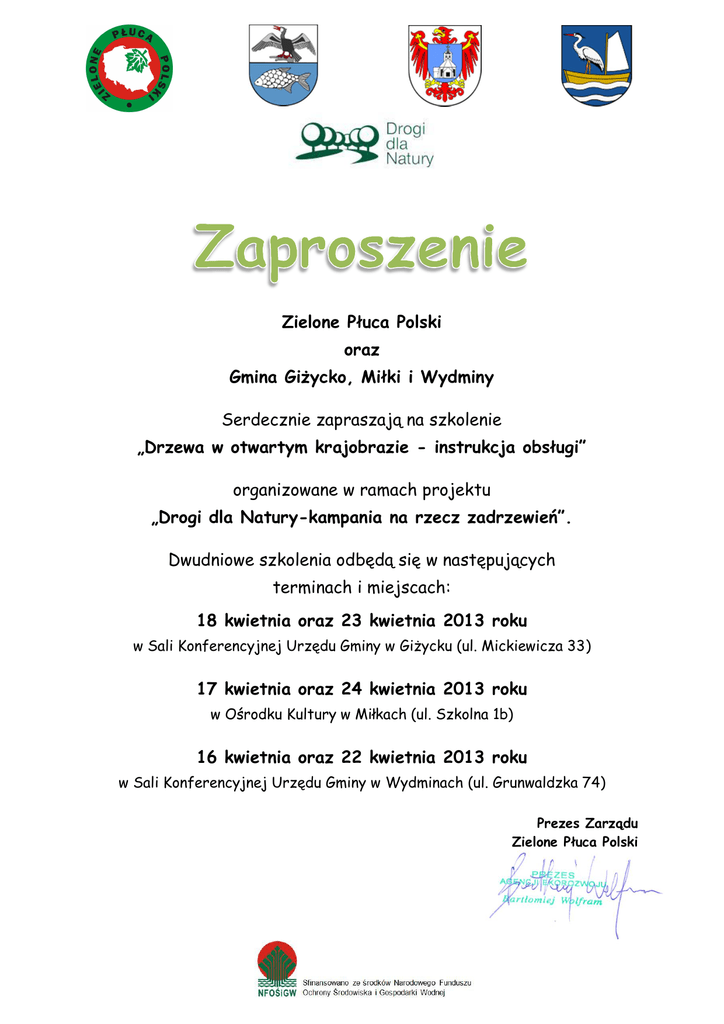 Zielone Płuca Polski oraz Gmina Giżycko, Miłki i Wydminy Serdecznie zapraszają na szkolenie „Drzewa w otwartym krajobrazie - instrukcja obsługi” organizowane w ramach projektu „Drogi dla Natury-kampania na rzecz zadrzewień”. Dwudniowe szkolenia odbędą się w następujących terminach i miejscach: 18 kwietnia oraz 23 kwietnia 2013 roku w Sali Konferencyjnej Urzędu Gminy w Giżycku (ul. Mickiewicza 33) 17 kwietnia oraz 24 kwietnia 2013 roku w Ośrodku Kultury w Miłkach (ul. Szkolna 1b) 16 kwietnia oraz 22 kwietnia 2013 roku w Sali Konferencyjnej Urzędu Gminy w Wydminach (ul. Grunwaldzka 74) Prezes Zarządu Zielone Płuca Polski Program szkolenia Dzień I (16.04 Wydminy, 17.04 Miłki, 18.04 Giżycko) 8:00 – 8.30 – Rejestracja uczestników 8.30 – 9.15 - Drzewa przydrożne, ich rola i funkcje życiowe drzewa – Ewa Stajuda, Fundacja Ochrony Wielkich Jezior Mazurskich 9.15 – 10.00 - Komunikowanie kwestii związanych z drzewami społecznościom lokalnym – Anna Kasjaniuk, Koordynator lokalny, Zielone Płuca Polski 10.00 – 11.30 - Przyrodnicza waloryzacja drzew – jak dokonać oględzin drzewa pod kątem gatunków chronionych – Marek Kowalski 11.30 – 12.30 – Lunch 12.30 – 14:00 - Decyzje o wycince - wydać czy nie i na jakiej podstawie – Rafał Młodowski 14.00 – 14.30 - Wnioski i dyskusja Dzień II (22.04 Wydminy, 23.04 Giżycko, 24.04 Miłki) 8:00 – 8:15 - Rozpoczęcie drugiego dnia szkolenia, rejestracja uczestników – Zielone Płuca Polski 8:15 – 10:45 - Zasady prawidłowej pielęgnacji drzew, w tym jak napisać specyfikacje zlecenia oraz jak nadzorować i odbierać prace – wykład – Jerzy Stolarczyk 10.45 – 12.15 - Ochrona drzew w procesie inwestycyjnym. Projektowanie alei. Wybór, sadzenie i jakość materiału szkółkarskiego – Marzena Suchocka 12.15 – 13.00 – Lunch 13.00 – 14.30 Diagnostyka stanu drzewa – wykład+ ćwiczenia – Jerzy Stolarczyk 14.30 – 15.00 Podsumowanie spotkania, wnioski i dyskusja W trakcie szkolenia przewidziane są także przerwy kawowe. Szkolenie jest bezpłatne, organizator zapewnia materiały szkoleniowe i wyżywienie. Wszystkich zainteresowanych udziałem w szkoleniu, prosimy o przesłanie zgłoszenia do dnia 12.04.2013 na adres [email protected] lub telefonicznie: 857412113. Osoba do kontaktu Anna Kasjaniuk W 1 i 2 dniu szkolenia w każdej gminie dopuszcza się udział po 1-3 osób z jednej instytucji. Szkolenie organizowane przy współpracy z Fundacją Ochrony Wielkich Jezior Mazurskich
