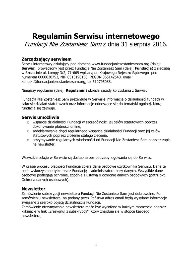 Regulamin Serwisu internetowego Fundacji Nie Zostaniesz Sam z dnia 31 sierpnia 2016. Zarządzający serwisem Serwis internetowy działający pod domeną www.fundacjaniezostanieszsam.org (dalej: Serwis), prowadzony jest przez Fundację Nie Zostaniesz Sam (dalej: Fundacja) z siedzibą w Szczecinie ul. Lompy 3/2, 71-669 wpisaną do Krajowego Rejestru Sądowego pod numerem 0000630753, NIP 8513198158, REGON 365142540, email: [email protected], tel.512795088. Niniejszy regulamin (dalej: Regulamin) określa zasady korzystania z Serwisu. Fundacja Nie Zostaniesz Sam prezentuje w Serwisie informacje o działalności fundacji w zakresie działań statutowych oraz informacje odnoszące się do tematyki ogólnej, którą fundacja się zajmuje. Serwis umożliwia wsparcie działalności Fundacji w szczególności jej celów statutowych poprzez dokonywanie płatności online, zadeklarowanie chęci regularnego wsparcia działalności Fundacji oraz jej celów statutowych poprzez złożenie stałego zlecenia. otrzymywanie regularnych wiadomości od Fundacji Nie Zostaniesz Sam poprzez zapis na newsletter. Wszystkie sekcje w Serwisie są dostępne bez potrzeby logowania się do Serwisu. W czasie procesu płatności Fundacja zbiera dane osobowe użytkownika Serwisu. Dane te będą wykorzystane tylko przez Fundację – administratora bazy danych. Wszystkie dane osobowe podlegają ochronie, zgodnie z ustawą o ochronie danych osobowych (patrz pkt. Ochrona danych osobowych). Newsletter Zamówienie subskrypcji newslettera Fundacji Nie Zostaniesz Sam jest dobrowolne. Po zamówieniu newslettera, na podany przez Państwa adres email będą wysyłane informacje związane z szeroko pojętą działalnością Fundacji. Zamówienie otrzymywania newslettera może być wycofane w każdym momencie poprzez kliknięcie w link „Zrezygnuj z subskrypcji”, który znajduje się w stopce każdego newslettera; 1 Informacje o możliwości udzielania comiesięcznej, regularnej stałej pomocy finansowej Wybranie opcji "Pomagam regularnie" umożliwia pomaganie osobom potrzebującym każdego dnia na podstawie polecenia zapłaty. Można to uczynić 2 metodami: 1. Wchodząc do serwisu internetowego swojego banku i według procedur wskazanych przez Państwa bank złożyć zlecenie stałe, to znaczy płatne tego samego dnia każdego miesiąca w tej samej dowolnie zadeklarowanej kwocie. Beneficjentem płatności będzie Fundacja Nie Zostaniesz Sam ul. Józefa Lompy 3/2, 71-669 Szczecin, numer rachunku bankowego: Serwis daje możliwość wypełnienia formularza z danymi niezbędnymi do ustanowienia polecenia zapłaty. Polecenie zapłaty to prosta, bezpieczna i szybka forma dokonywania regularnych płatności. Dzięki temu mechanizmowi Darczyńca może w wygodny sposób przekazywać comiesięczne wsparcie. Na podstawie polecenia zapłaty Fundacja Nie Zostaniesz Sam regularnie co miesiąc inicjuje pobranie darowizny z konta Darczyńcy. Regularne wsparcie Darczyńców to dla Fundacji Nie Zostaniesz Sam mniejsze koszty, a jednocześnie stały przewidywalny dochód pozwalający na konsekwentną realizację długofalowych projektów na rzecz osób potrzebujących i szybką profesjonalną pomoc w nagłych sytuacjach kryzysowych. Wypełnienie formularza w serwisie jest równoznaczne z chęcią złożenia polecenia zapłaty, ale nie oznacza ustanowienia polecenia zapłaty. Aby uruchomić polecenie zapłaty na rzecz Fundacja Nie Zostaniesz Sam, należy wypełnić zamieszczony w serwisie formularz. Fundacja Nie Zostaniesz Sam wydrukuje go i prześle do Darczyńcy pocztą lub kurierem wraz z dodatkowymi materiałami. Darczyńca powinien podpisać obydwie części otrzymanego formularza – dla Fundacji Nie Zostaniesz Sam oraz dla banku. Bardzo istotne jest, aby podpis na formularzach zgodny był ze wzorem podpisu w banku. Obie części formularza należy oddać kurierowi lub odesłać w dołączonej do przesyłki kopercie zwrotnej na adres: Fundacja Nie Zostaniesz Sam ul. Józefa Lompy 3/2, 71-669 Szczecin. Następnie Fundacja przekaże do banku jeden egzemplarz formularza, aby dopełnić formalności niezbędnych do uruchomienia polecenia zapłaty. Anulowanie polecenia zapłaty wymaga podpisania i odesłania na adres Fundacji formularza, który dostępny jest w serwisie. W celu dopełnienia wszystkich formalności dotyczących ustanowienia polecenia zapłaty Fundacja Nie Zostaniesz Sam może kontaktować się z potencjalnymi Darczyńcami. Darowizna przekazana na rzecz Fundacja Nie Zostaniesz Sam, może zostać rozliczona przy rozliczaniu podatku od osób fizycznych (PIT) i prawnych w danym roku podatkowym. Wszelkie należności pieniężne muszą być wyrażone w polskich złotych (PLN). Wszystkie dane osobowe zbierane przez Fundację Nie Zostaniesz Sam podlegają ochronie, zgodnie z ustawą o ochronie danych osobowych (patrz pkt. Ochrona danych osobowych). Płatności online Serwis umożliwia dokonanie płatności na rzecz Fundacja Nie Zostaniesz Sam celem wsparcia działań statutowych. Wszelkie należności pieniężne muszą być wyrażone w polskich złotych (PLN). Płatności online są obsługiwane przez: 1- PayU SA, ul. Grunwaldzka 182, 60-166 Poznań NIP 779-23-08-495, REGON 300523444, Sąd Rejonowy Poznań - Nowe Miasto i Wilda w Poznaniu, Wydział VIII Gospodarczy Krajowego Rejestru Sądowego, KRS 0000274399. 2 2 - Dotpay S.A., ul. Wielicka 72, 30-552 Kraków, tel.: +48 12 688 26 00, fax: +48 12 688 26 99, NIP 634-26-61-860. Sąd Rejonowy Kraków-Śródmieście Wydział XI Gospodarczy KRS nr 296790 Użytkownik aby przejść do okna płatności jest zobowiązany do podania danych kontaktowych takich jak imię, nazwisko i e-mail. Wszystkie dane osobowe zbierane przez Fundację Nie Zostaniesz Sam podlegają ochronie, zgodnie z ustawą o ochronie danych osobowych (patrz pkt. Ochrona danych osobowych). Chcąc dokonać płatności przez internet po wybraniu operatora płatności online zostaną Państwo odpowiednio przekierowani do serwisu www.