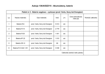 Aukcja 136/A/DZZ/15 - Akumulatory, baterie Pakiet nr 2 - Baterie węglowo - cynkowe (prod: Varta, Sony lub Energizer) Lp. Nazwa materiału Opis materiału ilość j.m. 1 Bateria R-6 prod. Varta, Sony lub Energizer 5 513 szt. 2 Bateria R-14 prod. Varta, Sony lub Energizer 2 779 szt. 3 Bateria R-20 prod. Varta, Sony lub Energizer 1 441 szt. 4 Bateria 6F 22 prod. Varta, Sony lub Energizer 1 010 szt. 5 Bateria 3R-12 prod. Varta, Sony lub Energizer 66 szt. 6 Bateria R-3 AAA 1,5V prod. Varta, Sony lub Energizer 3 038 szt. Cena jednostkowa netto [zł] Całkowita wartość netto pakietu: Wartość całkowita