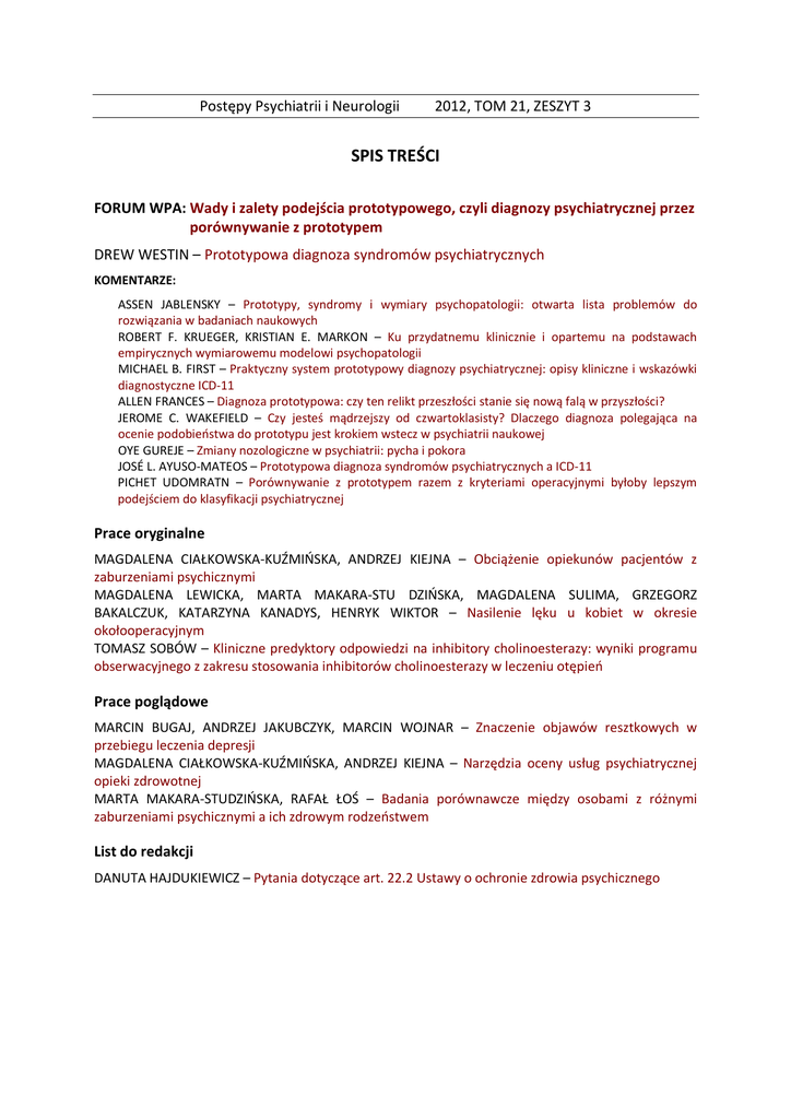 Postępy Psychiatrii i Neurologii 2012, TOM 21, ZESZYT 3 SPIS TREŚCI FORUM WPA: Wady i zalety podejścia prototypowego, czyli diagnozy psychiatrycznej przez porównywanie z prototypem DREW WESTIN – Prototypowa diagnoza syndromów psychiatrycznych KOMENTARZE: ASSEN JABLENSKY – Prototypy, syndromy i wymiary psychopatologii: otwarta lista problemów do rozwiązania w badaniach naukowych ROBERT F. KRUEGER, KRISTIAN E. MARKON – Ku przydatnemu klinicznie i opartemu na podstawach empirycznych wymiarowemu modelowi psychopatologii MICHAEL B. FIRST – Praktyczny system prototypowy diagnozy psychiatrycznej: opisy kliniczne i wskazówki diagnostyczne ICD-11 ALLEN FRANCES – Diagnoza prototypowa: czy ten relikt przeszłości stanie się nową falą w przyszłości? JEROME C. WAKEFIELD – Czy jesteś mądrzejszy od czwartoklasisty? Dlaczego diagnoza polegająca na ocenie podobieństwa do prototypu jest krokiem wstecz w psychiatrii naukowej OYE GUREJE – Zmiany nozologiczne w psychiatrii: pycha i pokora JOSÉ L. AYUSO-MATEOS – Prototypowa diagnoza syndromów psychiatrycznych a ICD-11 PICHET UDOMRATN – Porównywanie z prototypem razem z kryteriami operacyjnymi byłoby lepszym podejściem do klasyfikacji psychiatrycznej Prace oryginalne MAGDALENA CIAŁKOWSKA-KUŹMIŃSKA, ANDRZEJ KIEJNA – Obciążenie opiekunów pacjentów z zaburzeniami psychicznymi MAGDALENA LEWICKA, MARTA MAKARA-STU DZIŃSKA, MAGDALENA SULIMA, GRZEGORZ BAKALCZUK, KATARZYNA KANADYS, HENRYK WIKTOR – Nasilenie lęku u kobiet w okresie okołooperacyjnym TOMASZ SOBÓW – Kliniczne predyktory odpowiedzi na inhibitory cholinoesterazy: wyniki programu obserwacyjnego z zakresu stosowania inhibitorów cholinoesterazy w leczeniu otępień Prace poglądowe MARCIN BUGAJ, ANDRZEJ JAKUBCZYK, MARCIN WOJNAR – Znaczenie objawów resztkowych w przebiegu leczenia depresji MAGDALENA CIAŁKOWSKA-KUŹMIŃSKA, ANDRZEJ KIEJNA – Narzędzia oceny usług psychiatrycznej opieki zdrowotnej MARTA MAKARA-STUDZIŃSKA, RAFAŁ ŁOŚ – Badania porównawcze między osobami z różnymi zaburzeniami psychicznymi a ich zdrowym rodzeństwem List do redakcji DANUTA HAJDUKIEWICZ – Pytania dotyczące art. 22.2 Ustawy o ochronie zdrowia psychicznego Advances in Psychiatry and Neurology 2012, VOLUME 21, ISSUE 3 CONTENTS WPA FORUM: Advantages and disadvantages of a prototype-matching approach to psychiatric diagnosis DREW WESTIN – Prototype diagnosis of psychiatric syndromes COMMENTARIES: ASSEN JABLENSKY – Prototypes, syndromes and dimensions of psychopathology: an open agenda for research ROBERT F. KRUEGER, KRISTIAN E. MARKON – Toward a clinically useful and empirically based dimensional model of psychopathology MICHAEL B. FIRST – A practical prototypic system for psychiatric diagnosis: the ICD-11 Clinical Descriptions and Diagnostic Guidelines ALLEN FRANCES – Prototypal diagnosis: will this relic from the past become the wave of the future? JEROME C. WAKEFIELD – Are you as smart as a 4th grader? Why the prototype similarity approach to diagnosis is a step backward for a scientific psychiatry OYE GUREJE – Nosological changes in psychiatry: hubris and humility JOSÉ L. AYUSO-MATEOS – Prototype diagnosis of psychiatric syndromes and the ICD-11 PICHET UDOMRATN – Prototype matching together with operational criteria would make a better approach to psychiatric classification Original papers MAGDALENA CIAŁKOWSKA-KUŹMIŃSKA, ANDRZEJ KIEJNA – Caregiver burden in mental illness MAGDALENA LEWICKA, MARTA MAKARA-STUDZIŃSKA, MAGDALENA SULIMA, GRZEGORZ BAKALCZUK, KATARZYNA KANADYS, HENRYK WIKTOR – Anxiety levels in women in the perioperative period TOMASZ SOBÓW – Clinical predictors of response to cholinesterase inhibitors: results of an observational program concerning the use of cholinesterase inhibitors in the treatment of dementias Reviews MARCIN BUGAJ, ANDRZEJ JAKUBCZYK, MARCIN WOJNAR – The significance of residual symptoms in the course of treatment for depression MAGDALENA CIAŁKOWSKA-KUŹMIŃSKA, ANDRZEJ KIEJNA – Tools for evaluation of mental health services MARTA MAKARA-STUDZIŃSKA, RAFAŁ ŁOŚ – Comparative studies of persons with various mental disorders and their healthy siblings Letter to the Editor DANUTA HAJDUKIEWICZ – Questions concerning Article 22.2 of the Mental Health Act