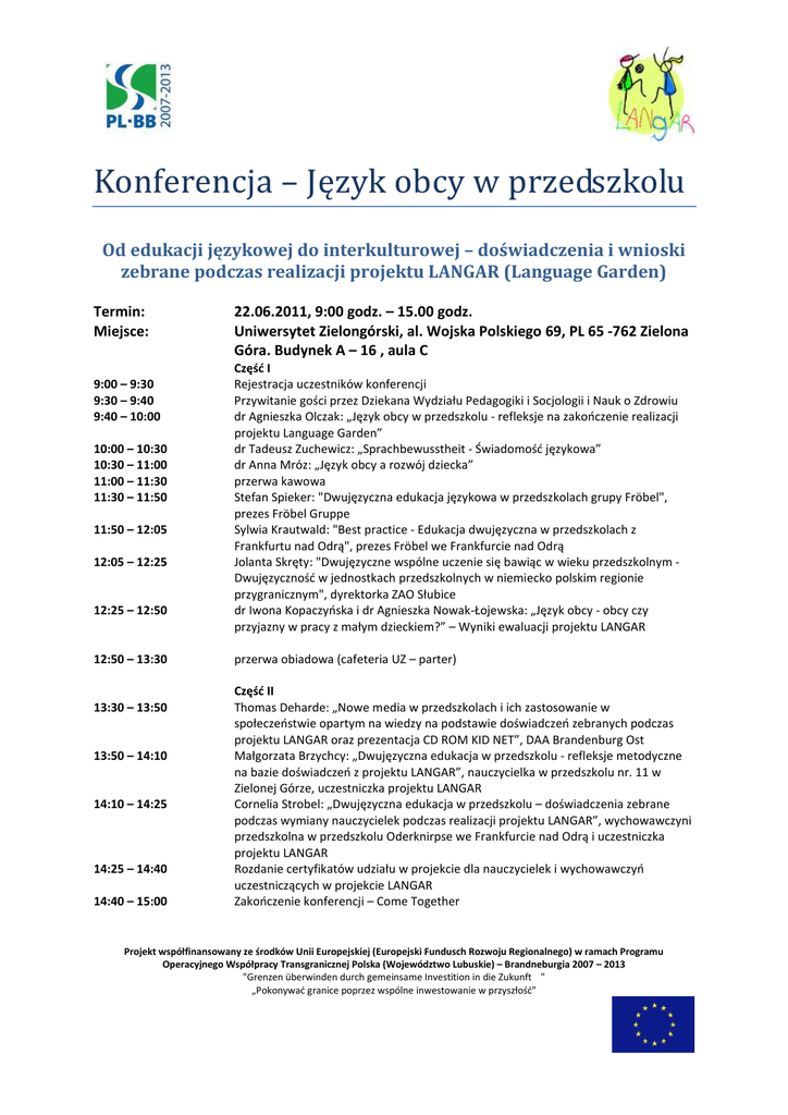 Konferencja – Język obcy w przedszkolu Od edukacji językowej do interkulturowej – doświadczenia i wnioski zebrane podczas realizacji projektu LANGAR (Language Garden) Termin: Miejsce: 9:00 – 9:30 9:30 – 9:40 9:40 – 10:00 10:00 – 10:30 10:30 – 11:00 11:00 – 11:30 11:30 – 11:50 11:50 – 12:05 12:05 – 12:25 12:25 – 12:50 12:50 – 13:30 13:30 – 13:50 13:50 – 14:10 14:10 – 14:25 14:25 – 14:40 14:40 – 15:00 22.06.2011, 9:00 godz. – 15.00 godz. Uniwersytet Zielongórski, al. Wojska Polskiego 69, PL 65 -762 Zielona Góra. Budynek A – 16 , aula C Część I Rejestracja uczestników konferencji Przywitanie gości przez Dziekana Wydziału Pedagogiki i Socjologii i Nauk o Zdrowiu dr Agnieszka Olczak: „Język obcy w przedszkolu - refleksje na zakończenie realizacji projektu Language Garden” dr Tadeusz Zuchewicz: „Sprachbewusstheit - Świadomość językowa” dr Anna Mróz: „Język obcy a rozwój dziecka” przerwa kawowa Stefan Spieker: "Dwujęzyczna edukacja językowa w przedszkolach grupy Fröbel", prezes Fröbel Gruppe Sylwia Krautwald: "Best practice - Edukacja dwujęzyczna w przedszkolach z Frankfurtu nad Odrą", prezes Fröbel we Frankfurcie nad Odrą Jolanta Skręty: "Dwujęzyczne wspólne uczenie się bawiąc w wieku przedszkolnym Dwujęzyczność w jednostkach przedszkolnych w niemiecko polskim regionie przygranicznym", dyrektorka ZAO Słubice dr Iwona Kopaczyńska i dr Agnieszka Nowak-Łojewska: „Język obcy - obcy czy przyjazny w pracy z małym dzieckiem?” – Wyniki ewaluacji projektu LANGAR przerwa obiadowa (cafeteria UZ – parter) Część II Thomas Deharde: „Nowe media w przedszkolach i ich zastosowanie w społeczeństwie opartym na wiedzy na podstawie doświadczeń zebranych podczas projektu LANGAR oraz prezentacja CD ROM KID NET”, DAA Brandenburg Ost Małgorzata Brzychcy: „Dwujęzyczna edukacja w przedszkolu - refleksje metodyczne na bazie doświadczeń z projektu LANGAR”, nauczycielka w przedszkolu nr. 11 w Zielonej Górze, uczestniczka projektu LANGAR Cornelia Strobel: „Dwujęzyczna edukacja w przedszkolu – doświadczenia zebrane podczas wymiany nauczycielek podczas realizacji projektu LANGAR”, wychowawczyni przedszkolna w przedszkolu Oderknirpse we Frankfurcie nad Odrą i uczestniczka projektu LANGAR Rozdanie certyfikatów udziału w projekcie dla nauczycielek i wychowawczyń uczestniczących w projekcie LANGAR Zakończenie konferencji – Come Together Projekt współfinansowany ze środków Unii Europejskiej (Europejski Fundusch Rozwoju Regionalnego) w ramach Programu Operacyjnego Współpracy Transgranicznej Polska (Województwo Lubuskie) – Brandneburgia 2007 – 2013 "Grenzen überwinden durch gemeinsame Investition in die Zukunft " „Pokonywać granice poprzez wspólne inwestowanie w przyszłość”