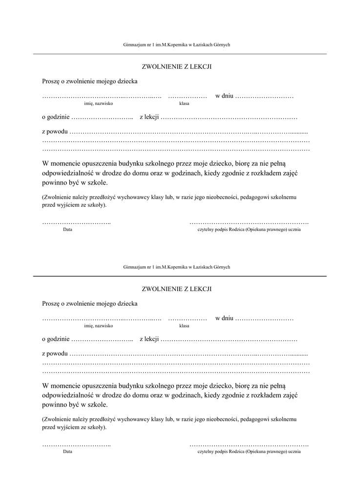 Gimnazjum nr 1 im.M.Kopernika w Łaziskach Górnych ZWOLNIENIE Z LEKCJI Proszę o zwolnienie mojego dziecka ………………………………..…………..…. ……………… imię, nazwisko w dniu ……………………… klasa o godzinie ……………………….. z lekcji ……………………………………………………… z powodu ……………………………………………………………………….…..……………........... …………………………………………………………………………………………………………… …………………………………………………………………………………………………………… W momencie opuszczenia budynku szkolnego przez moje dziecko, biorę za nie pełną odpowiedzialność w drodze do domu oraz w godzinach, kiedy zgodnie z rozkładem zajęć powinno być w szkole. (Zwolnienie należy przedłożyć wychowawcy klasy lub, w razie jego nieobecności, pedagogowi szkolnemu przed wyjściem ze szkoły). ………………………….. ………………………………………………. Data czytelny podpis Rodzica (Opiekuna prawnego) ucznia Gimnazjum nr 1 im.M.Kopernika w Łaziskach Górnych ZWOLNIENIE Z LEKCJI Proszę o zwolnienie mojego dziecka ………………………………..…………..…. ……………… imię, nazwisko w dniu ……………………… klasa o godzinie ……………………….. z lekcji ……………………………………………………… z powodu ……………………………………………………………………….…..……………........... …………………………………………………………………………………………………………… …………………………………………………………………………………………………………… W momencie opuszczenia budynku szkolnego przez moje dziecko, biorę za nie pełną odpowiedzialność w drodze do domu oraz w godzinach, kiedy zgodnie z rozkładem zajęć powinno być w szkole. (Zwolnienie należy przedłożyć wychowawcy klasy lub, w razie jego nieobecności, pedagogowi szkolnemu przed wyjściem ze szkoły). ………………………….. Data ………………………………………………. czytelny podpis Rodzica (Opiekuna prawnego) ucznia