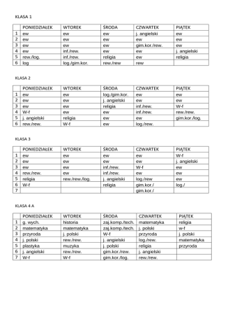 KLASA 1 1 2 3 4 5 6 PONIEDZIAŁEK WTOREK ŚRODA CZWARTEK PIĄTEK ew ew ew ew rew./log. log ew ew ew inf./rew. inf./rew. log./gim.kor. ew ew ew ew religia rew./rew j. angielski ew gim.kor./rew. ew ew rew ew ew ew j. angielski religia PONIEDZIAŁEK WTOREK ŚRODA CZWARTEK PIĄTEK ew ew ew W-f j. angielski rew./rew. ew ew ew ew religia W-f log./gim.kor. j. angielski religia ew ew ew ew ew inf./rew. inf./rew. ew log./rew. ew ew W-f rew./rew. gim.kor./log. PONIEDZIAŁEK WTOREK ŚRODA CZWARTEK PIĄTEK ew ew ew rew./rew. religia W-f ew ew ew ew rew./rew./log. ew ew inf./rew. inf./rew. j. angielski religia ew ew W-f ew log./rew gim.kor./ gim.kor./ W-f j. angielski ew ew ew log./ PONIEDZIAŁEK WTOREK ŚRODA CZWARTEK PIĄTEK g. wych. matematyka przyroda j. polski plastyka j. angielski W-f historia matematyka j. polski rew./rew. muzyka rew./rew. W-f zaj.komp./tech. zaj.komp./tech. W-f j. angielski j. polski gim.kor./rew. gim.kor./log. matematyka j. polski przyroda log./rew. religia j. angielski rew./rew. religia w-f j. polski matematyka przyroda KLASA 2 1 2 3 4 5 6 KLASA 3 1 2 3 4 5 6 7 KLASA 4 A 1 2 3 4 5 6 7 KLASA 4B 1 2 3 4 5 6 7 8 PONIEDZIAŁEK WTOREK ŚRODA CZWARTEK PIĄTEK g. wych. j. polski matematyka j. angielski informatyka/gim.kor. informatyka/gim.kor. w-f matematyka przyroda historia j. polski rew./rew. religia w-f log./ j. angielski matematyka plastyka przyroda j. polski muzyka rew./rew. w-f j. polski matematyka przyroda j. angielski religia technika/rew. technika/rew. rew./rew. w-f j. polski log./ KLASA 5A 1 2 3 4 5 6 7 8 PONIEDZIAŁEK WTOREK ŚRODA CZWARTEK PIĄTEK g. wych. j. angielski matematyka j. polski rew./rew. muzyka gim.kor./WDŻ WDŻ matematyka j. polski W-f/basen rew./rew./basen j. angielski log./rew. religia gim.kor./rew. matematyka j. polski j. polski przyroda W-f/basen j. angielski zaj.komp./rew. zaj.komp./rew. matematyka j. polski przyroda historia w-f plastyka przyroda w-f j. polski matematyka religia rew./ PONIEDZIAŁEK WTOREK ŚRODA CZWARTEK PIĄTEK g. wych. przyroda j. polski matematyka muzyka religia rew./rew. log./ przyroda j. polski rew./basen W-f/basen matematyka j. angielski log./ matematyka gim.kor./rew. j. polski j. polski gim.kor./rew. przyroda W-f j. polski matematyka historia j. angielski plastyka w-f rew./WDŻ WDŻ w-f j. polski zaj.komp./rew. zaj.komp./rew. j. angielski matematyka religia KLASA 5B 1 2 3 4 5 6 7 8 KLASA 6A 1 2 3 4 5 6 7 8 PONIEDZIAŁEK WTOREK ŚRODA CZWARTEK PIĄTEK g.wych. matematyka W-f rew./rew. j. polski przyroda muzyka religia j. polski matematyka log./rew. gim.kor./rew. historia zaj.komp./technika zaj.komp./technika matematyka przyroda j. angielski gim.kor./rew. W-f j. polski religia plastyka historia j. polski matematyka w-f j. angielski technika/rew. technika/ j. angielski matematyka j. polski W-f rew./rew. przyroda log./WDŻ WDŻ KLASA 6B 1 2 3 4 5 6 7 8 PONIEDZIAŁEK WTOREK ŚRODA CZWARTEK PIĄTEK g. wych. W-f matematyka technika/g.kor technika/log. j. polski plastyka j. polski matematyka g.kor./rew. log./rew. j. angielski historia rew./rew. religia przyroda j. polski matematyka W-f zaj.komp./technika zaj.komp./technika muzyka rew./rew. historia j. angielski j. polski W-f matematyka przyroda religia j. polski W-f j. angielski przyroda matematyka rew./rew. WDŻ WDŻ PONIEDZIAŁEK WTOREK ŚRODA CZWARTEK PIĄTEK ew ew ew gim.kor/log. religia religia ew ew ew ew gim.kor/ ew rew./gim.kor. ew ew ew ew log./rew. log./rew. ew ew ew ew ew ew rew./ PONIEDZIAŁEK WTOREK ŚRODA CZWARTEK PIĄTEK ew ew ew ew gim.kor./log. gim.kor./log. gim.kor./rew. ew ew ew ew ew ew ew religia rew./rew. ew ew ew ew ew rew./ ew ew ew religia rew./ PONIEDZIAŁEK WTOREK ŚRODA CZWARTEK PIĄTEK ew ew ew ew gim.kor/log. gim.kor./ ew ew ew ew gim.kor./log. ew ew log./rew. ew ew ew ew ew religia rew./rew. ew religia ew ew ew rew./rew. KLASA 1 Z 1 2 3 4 5 6 KLASA 2ZA 1 2 3 4 5 6 KLASA 2ZB 1 2 3 4 5 6 KLASA 4Z 1 2 3 4 5 6 7 PONIEDZIAŁEK WTOREK ŚRODA CZWARTEK PIĄTEK religia technika technika fwś fwś muzyka plastyka fwś plastyka muzyka rew./gim.kor. log./gim.kor. fwś W-f muzyka rew.rew. rew./rew. technika gim.kor. fwś muzyka plastyka W-f W-f log. technika technika fwś W-f religia plastyka plastyka PONIEDZIAŁEK WTOREK ŚRODA CZWARTEK PIĄTEK fwś plastyka muzyka technika technika religia log./rew. fwś fwś muzyka technika technika W-f religia W-f W-f fwś plastyka rew./rew. plastyka muzyka gim.kor./ W-f fwś fwś plastyka rew./log. muzyka plastyka fwś technika gim.kor./rew. gim.kor./ PONIEDZIAŁEK WTOREK ŚRODA CZWARTEK PIĄTEK fwś fwś technika rew./rew. plastyka plastyka muzyka fwś gim.kor/rew. muzyka plastyka plastyka rew./log. W-f fwś fwś technika technika muzyka W-f W-f gim.kor./log fwś gim.kor./rew. technika technika religia fwś fwś muzyka religia W-f PONIEDZIAŁEK WTOREK ŚRODA CZWARTEK PIĄTEK fwś fwś log./gim.kor. plastyka plastyka log./rew. religia fwś fwś gim.kor./rew. muzyka W-f plastyka muzyka technika technika technika W-f W-f religia rew./ rew./ fwś gim.kor./rew. fwś muzyka technika technika fwś fwś plastyka plastyka muzyka W-f KLASA 5ZA 1 2 3 4 5 6 7 8 KLASA 5ZB 1 2 3 4 5 6 7 KLASA 6Z 1 2 3 4 5 6 7 8