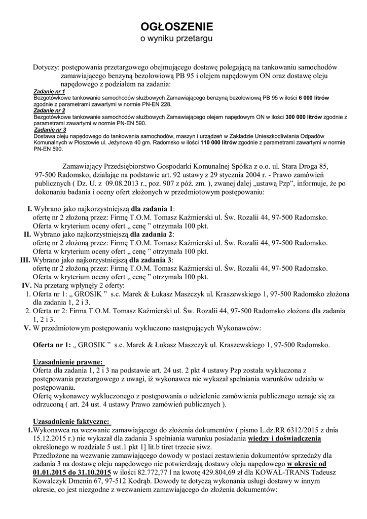 OGŁOSZENIE o wyniku przetargu Dotyczy: postępowania przetargowego obejmującego dostawę polegającą na tankowaniu samochodów zamawiającego benzyną bezołowiową PB 95 i olejem napędowym ON oraz dostawę oleju napędowego z podziałem na zadania: Zadanie nr 1 Bezgotówkowe tankowanie samochodów służbowych Zamawiającego benzyną bezołowiową PB 95 w ilości 6 000 litrów zgodnie z parametrami zawartymi w normie PN-EN 228. Zadanie nr 2 Bezgotówkowe tankowanie samochodów służbowych Zamawiającego olejem napędowym ON w ilości 300 000 litrów zgodnie z parametrami zawartymi w normie PN-EN 590. Zadanie nr 3 Dostawa oleju napędowego do tankowania samochodów, maszyn i urządzeń w Zakładzie Unieszkodliwiania Odpadów Komunalnych w Płoszowie ul. Jeżynowa 40 gm. Radomsko w ilości 110 000 litrów zgodnie z parametrami zawartymi w normie PN-EN 590. Zamawiający Przedsiębiorstwo Gospodarki Komunalnej Spółka z o.o. ul. Stara Droga 85, 97-500 Radomsko, działając na podstawie art. 92 ustawy z 29 stycznia 2004 r. - Prawo zamówień publicznych ( Dz. U. z 09.08.2013 r., poz. 907 z póź. zm. ), zwanej dalej „ustawą Pzp”, informuje, że po dokonaniu badania i oceny ofert złożonych w przedmiotowym postępowaniu: I. Wybrano jako najkorzystniejszą dla zadania 1: ofertę nr 2 złożoną przez: Firmę T.O.M. Tomasz Kaźmierski ul. Św. Rozalii 44, 97-500 Radomsko. Oferta w kryterium oceny ofert „ cenę ” otrzymała 100 pkt. II. Wybrano jako najkorzystniejszą dla zadania 2: ofertę nr 2 złożoną przez: Firmę T.O.M. Tomasz Kaźmierski ul. Św. Rozalii 44, 97-500 Radomsko. Oferta w kryterium oceny ofert „ cenę ” otrzymała 100 pkt. III. Wybrano jako najkorzystniejszą dla zadania 3: ofertę nr 2 złożoną przez: Firmę T.O.M. Tomasz Kaźmierski ul. Św. Rozalii 44, 97-500 Radomsko. Oferta w kryterium oceny ofert „ cenę ” otrzymała 100 pkt. IV. Na przetarg wpłynęły 2 oferty: 1. Oferta nr 1: „ GROSIK ” s.c. Marek & Łukasz Maszczyk ul. Kraszewskiego 1, 97-500 Radomsko złożona dla zadania 1, 2 i 3. 2. Oferta nr 2: Firma T.O.M. Tomasz Kaźmierski ul. Św. Rozalii 44, 97-500 Radomsko złożona dla zadania 1, 2 i 3. V. W przedmiotowym postępowaniu wykluczono następujących Wykonawców: Oferta nr 1: „ GROSIK ” s.c. Marek & Łukasz Maszczyk ul. Kraszewskiego 1, 97-500 Radomsko. Uzasadnienie prawne: Oferta dla zadania 1, 2 i 3 na podstawie art. 24 ust. 2 pkt 4 ustawy Pzp została wykluczona z postępowania przetargowego z uwagi, iż wykonawca nie wykazał spełniania warunków udziału w postępowaniu. Ofertę wykonawcy wykluczonego z postępowania o udzielenie zamówienia publicznego uznaje się za odrzuconą ( art. 24 ust. 4 ustawy Prawo zamówień publicznych ). Uzasadnienie faktyczne: 1.Wykonawca na wezwanie zamawiającego do złożenia dokumentów ( pismo L.dz.RR 6312/2015 z dnia 15.12.2015 r.) nie wykazał dla zadania 3 spełniania warunku posiadania wiedzy i doświadczenia określonego w rozdziale 5 ust.1 pkt 1] lit.b tiret trzecie siwz. Przedłożone na wezwanie zamawiającego dowody w postaci zestawienia dokumentów sprzedaży dla zadania 3 na dostawę oleju napędowego nie potwierdzają dostawy oleju napędowego w okresie od 01.01.2015 do 31.10.2015 w ilości 82.772,77 l na kwotę 429.804,69 zł dla KOWAL-TRANS Tadeusz Kowalczyk Dmenin 67, 97-512 Kodrąb. Dowody te dotyczą wykonania usługi dostawy w innym okresie, co jest niezgodne z wezwaniem zamawiającego do złożenia dokumentów: - w okresie od 01.01.2015 do 31.10.2015 w ilości 82.772,77 l na kwotę 429.804,69 zł dla KOWALTRANS Tadeusz Kowalczyk Dmenin 67, 97-512 Kodrąb, - złożonym do oferty załącznikiem nr 6 do siwz „ Doświadczenie zawodowe ( dla zadania nr 3 ) - dostawa oleju napędowego ” - strona 55 oferty, - zestawieniem sprzedaży - strona 58 oferty, - potwierdzeniem należytego wykonania usługi złożonym w formie oświadczenia podpisanym przez KOWAL-TRANS Tadeusz Kowalczyk - strona 59 oferty. 2.Wykonawca „ GROSIK ” s.c. Marek & Łukasz Maszczyk ul. Kraszewskiego 1, 97-500 Radomsko nie wykazał spełniania dla zadania 1, 2 i 3 warunku posiadania ubezpieczenia od odpowiedzialności cywilnej w zakresie prowadzonej działalności związanej z przedmiotem zamówienia na kwotę 500.000,00 PLN ( słownie: pięćset tysięcy złotych ). Jednym z warunków udziału w tym postępowaniu opisanym w ogłoszeniu o zamówieniu i siwz było posiadanie przez wykonawcę ubezpieczenia odpowiedzialności cywilnej w zakresie prowadzonej działalności związanej z przedmiotem zamówienia na kwotę 500.000,00 PLN, jako potwierdzenie spełniania warunku dotyczącego sytuacji ekonomicznej i finansowej wykonawcy. W celu wykazania spełniania przez wykonawców warunków, o których mowa w art. 22 ust.1 ustawy Pzp, zamawiający żądał m.in. opłaconej polisy, a w przypadku jej braku innego dokumentu potwierdzającego, że wykonawca jest ubezpieczony od odpowiedzialności cywilnej w zakresie prowadzonej działalności związanej z przedmiotem zamówienia na kwotę 500.000,00 PLN ( warunek określony w rozdziale 5 ust. 1 pkt 1] lit. d tiret pierwsze siwz ). Podstawą do żądania takiego dokumentu w postępowaniu o udzielenie zamówienia publicznego jest § 1 ust.1 pkt 11 Rozporządzenia Prezesa Rady Ministrów z dnia 19 lutego 2013 r. w sprawie rodzajów dokumentów, jakich może żądać zamawiający od wykonawcy oraz form, w jakich te dokumenty mogą być składane ( Dz. U. poz. 231 ). Zgodnie z tymi postanowieniami wykonawca zobowiązany był dołączyć do oferty albo opłaconą polisę, albo inny dokument potwierdzający, że wykonawca jest ubezpieczony od odpowiedzialności cywilnej. Objęcie ochroną ubezpieczeniową może wykonawca uzyskać zarówno przez podpisanie polisy ( umowy ubezpieczeniowej ), jak i poprzez uzyskanie innego dokumentu. Istotne jest, aby ochrona ubezpieczeniowa istniała na dzień upływu terminu składania ofert, który to termin przypadał na dzień 03.12