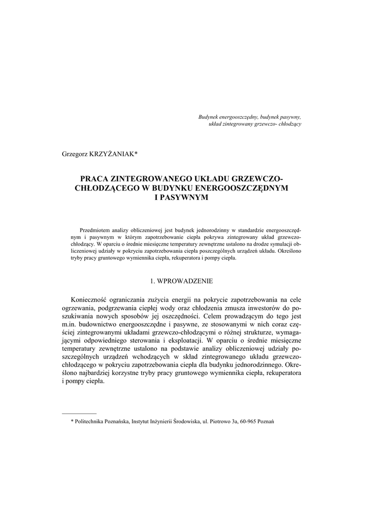 Budynek energooszczędny, budynek pasywny, układ zintegrowany grzewczo- chłodzący Grzegorz KRZYŻANIAK* PRACA ZINTEGROWANEGO UKŁADU GRZEWCZOCHŁODZĄCEGO W BUDYNKU ENERGOOSZCZĘDNYM I PASYWNYM Przedmiotem analizy obliczeniowej jest budynek jednorodzinny w standardzie energooszczędnym i pasywnym w którym zapotrzebowanie ciepła pokrywa zintegrowany układ grzewczochłodzący. W oparciu o średnie miesięczne temperatury zewnętrzne ustalono na drodze symulacji obliczeniowej udziały w pokryciu zapotrzebowania ciepła poszczególnych urządzeń układu. Określono tryby pracy gruntowego wymiennika ciepła, rekuperatora i pompy ciepła. 1. WPROWADZENIE Konieczność ograniczania zużycia energii na pokrycie zapotrzebowania na cele ogrzewania, podgrzewania ciepłej wody oraz chłodzenia zmusza inwestorów do poszukiwania nowych sposobów jej oszczędności. Celem prowadzącym do tego jest m.in. budownictwo energooszczędne i pasywne, ze stosowanymi w nich coraz częściej zintegrowanymi układami grzewczo-chłodzącymi o różnej strukturze, wymagającymi odpowiedniego sterowania i eksploatacji. W oparciu o średnie miesięczne temperatury zewnętrzne ustalono na podstawie analizy obliczeniowej udziały poszczególnych urządzeń wchodzących w skład zintegrowanego układu grzewczochłodzącego w pokryciu zapotrzebowania ciepła dla budynku jednorodzinnego. Określono najbardziej korzystne tryby pracy gruntowego wymiennika ciepła, rekuperatora i pompy ciepła. __________ * Politechnika Poznańska, Instytut Inżynierii Środowiska, ul. Piotrowo 3a, 60-965 Poznań 2. CHARAKTERYSTYKA INSTALACJI W ANALIZOWANYM BUDYNKU Przedmiotem analizy była praca zintegrowanego układu grzewczo-chłodzącego w tym samym budynku, najpierw o standardzie energooszczędnym, a później o standardzie pasywnym. Budynek dwukondygnacyjny (rys. 1) z użytkowym poddaszem jest zlokalizowany w II strefie klimatycznej i zamieszkuje w nim 4-osobowa rodzina. Powierzchnia ogrzewana netto wynosi 211,6 m2, a kubatura 418,5 m3. W przypadku zmiany standardu budynku z energooszczędnego na pasywny powierzchnia użytkowa oraz kubatura nie ulegną zmianie, gdyż zakładana termomodernizacja obejmowała tylko zwiększenie grubości warstwy styropianu po zewnętrznej stronie przegrody oraz wymianę stolarki okiennej i drzwiowej. W budynku o standardzie energooszczędnym zastosowano instalację grzewczo – chłodzącą (rys. 2) składającą się z gruntowego wymiennika ciepła (GWC) [4], krzyżowego wymiennika ciepła [3] oraz rewersyjnej pompy ciepła [2]. Pompa ciepła jest połączona z zasobnikiem buforowym i pełni funkcję ogrzewania, chłodzenia oraz podgrzewania c.w.u. Po zmianie standardu budynku z energooszczędnego na pasywny w obliczeniach zmniejszono średnicę zewnętrzną rur wymiennika i zastosowano mniejszy wymiennik krzyżowy. 3. MIESIĘCZNE ZAPOTRZEBOWANIE NA ENERGIĘ UŻYTKOWĄ DO OGRZEWANIA I WENTYLACJI Miesięczne zapotrzebowanie na energię użytkową do ogrzewania i wentylacji QH,nd dla budynku energooszczędnego i pasywnego obliczono wg metodologii w Rozporządzeniu [1], a wyniki obliczeń przedstawiono na rys. 3 dla standardu energooszczędnego i rys. 4. dla standardu pasywnego. 4. TRYBY PRACY INSTALACJI GRZEWCZO – CHŁODZĄCEJ Analizę pracy instalacji grzewczo – chłodzącej w odniesieniu do zapotrzebowania wykonano dla okresu całego roku, w okresie od stycznia do grudnia. W instalacji w zależności od miesiąca powietrze zewnętrzne przepływa albo przez wszystkie elementy układu instalacji, albo z pominięciem gruntowego wymiennika ciepła, jak również z wyłączeniem przepływu powietrza przez krzyżowy wymiennik ciepła przy zastosowaniu letniego obejścia. Rys.1. Aksonometryczny rzut budynku od strony południowo – wschodniej Fig. 1. South-east axonometric view of building Rys. 2. Schemat instalacji w budynku energooszczędnym i pasywnym Fig. 2. Low energy and passive house systems Oznaczenia do rys.2: CT – czerpnia terenowa, CŚ – czerpnia ścienna, F – filtr powietrza zewnętrznego, N – nagrzewnica, OC – odzysk ciepła, P1 – pompa obiegowa kolektora gruntowego, P2 – pompa obiegowa układu grzewczego, PR – parownik, SK – skraplacz, SP – sprężarka, ZR – zawory rozprężne, ZCWU – zasobnik c.w.u., T1 – temperatura za gruntowym wymiennikiem ciepła, T2 – temperatura za krzyżowym wymiennikiem ciepła, TP – temperatura w pomieszczeniu, TN – temperatura nawiewu, TZ – temperatura zewnętrzna, WN – wentylator nawiewny, WW – wentylator wywiewny. Rys. 3. Zestawienie zapotrzebowania na energię użytkową na ogrzewanie, strat i zysków ciepła w poszczególnych miesiącach w budynku energooszczędnym Fig. 3. Monthly energy demand for heating, heat losses and heat gains in low energy building Rys. 4. Zestawienie zapotrzebowania na energię użytkową na ogrzewanie, strat i zysków ciepła w poszczególnych miesiącach w budynku pasywnym. Fig. 4. Monthly energy demand for heating, heat losses and heat gains in passive house Budynek energooszczędny Okres, w którym pracują wszystkie urządzenia, tj. GWC, rekuperator oraz pompa ciepła obejmuje miesiące od października do marca. W kwietniu, maju oraz we wrześniu powietrze nawiewane przepływa przez rekuperator, pompę ciepła, natomiast nie przepływa przez wymiennik gruntowy. Wpływ na to ma temperatura gruntu, która jest niższa od temperatury powietrza zewnętrznego, a co za tym idzie powoduje jego wychłodzenie, podczas gdy wymagane jest jego podgrzanie. Czerwiec, lipiec oraz sierpień są miesiącami, w których instalacja pracuje w trybie chłodzenia, zatem powietrze zewnętrzne przepływa przez gruntowy wymiennik ciepła oraz pompę ciepła, natomiast omija rekuperator poprzez obejście letnie, tzw. bypass. Moce cieplne uzyskiwane w wyniku symulacji pracy poszczególnych elementów zintegrowanego układu grzewczo-chłodzącego przedstawiono na rys. 5, a temperatury zewnętrzne, nawiewu oraz w