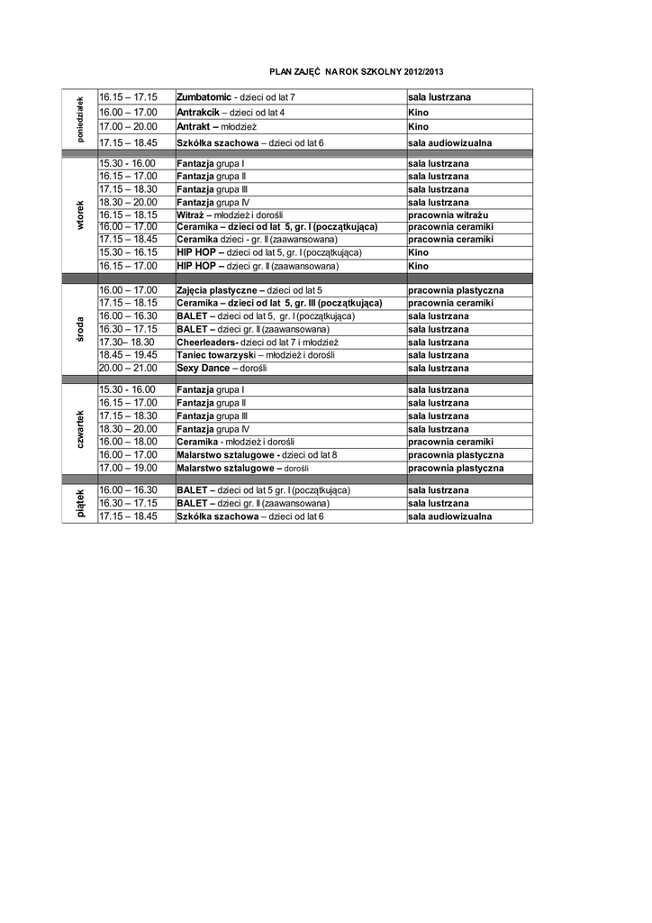 Zumbatomic - dzieci od lat 7 Antrakcik – dzieci od lat 4 Antrakt – młodzież sala lustrzana 17.15 – 18.45 Szkółka szachowa – dzieci od lat 6 sala audiowizualna wtorek 15.30 - 16.00 16.15 – 17.00 17.15 – 18.30 18.30 – 20.00 16.15 – 18.15 16.00 – 17.00 17.15 – 18.45 15.30 – 16.15 16.15 – 17.00 Fantazja grupa I Fantazja grupa II Fantazja grupa III Fantazja grupa IV Witraż – młodzież i dorośli Ceramika – dzieci od lat 5, gr. I (początkująca) Ceramika dzieci - gr. II (zaawansowana) HIP HOP – dzieci od lat 5, gr. I (początkująca) HIP HOP – dzieci gr. II (zaawansowana) sala lustrzana sala lustrzana sala lustrzana sala lustrzana pracownia witrażu pracownia ceramiki pracownia ceramiki Kino Kino środa 16.00 – 17.00 17.15 – 18.15 16.00 – 16.30 16.30 – 17.15 17.30– 18.30 18.45 – 19.45 20.00 – 21.00 Zajęcia plastyczne – dzieci od lat 5 Ceramika – dzieci od lat 5, gr. III (początkująca) BALET – dzieci od lat 5, gr. I (początkująca) BALET – dzieci gr. II (zaawansowana) Cheerleaders- dzieci od lat 7 i młodzież Taniec towarzyski – młodzież i dorośli Sexy Dance – dorośli pracownia plastyczna pracownia ceramiki sala lustrzana sala lustrzana sala lustrzana sala lustrzana sala lustrzana czwartek 15.30 - 16.00 16.15 – 17.00 17.15 – 18.30 18.30 – 20.00 16.00 – 18.00 16.00 – 17.00 17.00 – 19.00 Fantazja grupa I Fantazja grupa II Fantazja grupa III Fantazja grupa IV Ceramika - młodzież i dorośli Malarstwo sztalugowe - dzieci od lat 8 Malarstwo sztalugowe – dorośli sala lustrzana sala lustrzana sala lustrzana sala lustrzana pracownia ceramiki pracownia plastyczna pracownia plastyczna 16.00 – 16.30 16.30 – 17.15 17.15 – 18.45 BALET – dzieci od lat 5 gr. I (początkująca) BALET – dzieci gr. II (zaawansowana) Szkółka szachowa – dzieci od lat 6 sala lustrzana sala lustrzana sala audiowizualna poniedziałek 16.15 – 17.15 16.00 – 17.00 17.00 – 20.00 piątek PLAN ZAJĘĆ NA ROK SZKOLNY 2012/2013 Kino Kino