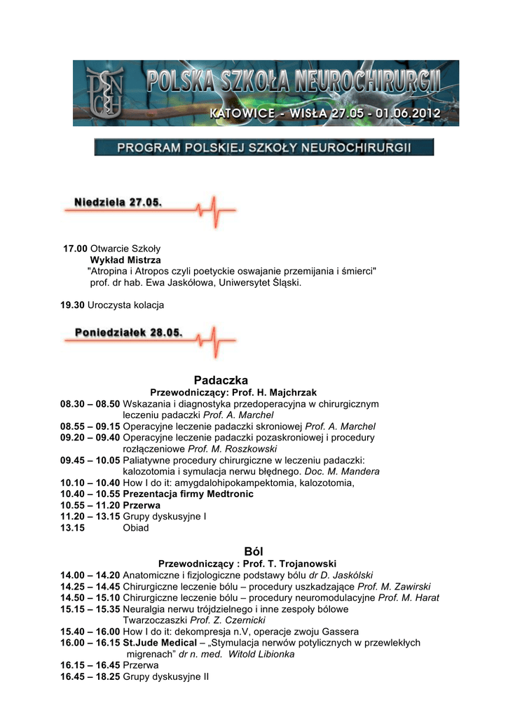 17.00 Otwarcie Szkoły Wykład Mistrza "Atropina i Atropos czyli poetyckie oswajanie przemijania i śmierci" prof. dr hab. Ewa Jaskółowa, Uniwersytet Śląski. 19.30 Uroczysta kolacja Padaczka Przewodniczący: Prof. H. Majchrzak 08.30 – 08.50 Wskazania i diagnostyka przedoperacyjna w chirurgicznym leczeniu padaczki Prof. A. Marchel 08.55 – 09.15 Operacyjne leczenie padaczki skroniowej Prof. A. Marchel 09.20 – 09.40 Operacyjne leczenie padaczki pozaskroniowej i procedury rozłączeniowe Prof. M. Roszkowski 09.45 – 10.05 Paliatywne procedury chirurgiczne w leczeniu padaczki: kalozotomia i symulacja nerwu błędnego. Doc. M. Mandera 10.10 – 10.40 How I do it: amygdalohipokampektomia, kalozotomia, 10.40 – 10.55 Prezentacja firmy Medtronic 10.55 – 11.20 Przerwa 11.20 – 13.15 Grupy dyskusyjne I 13.15 Obiad Ból Przewodniczący : Prof. T. Trojanowski 14.00 – 14.20 Anatomiczne i fizjologiczne podstawy bólu dr D. Jaskólski 14.25 – 14.45 Chirurgiczne leczenie bólu – procedury uszkadzające Prof. M. Zawirski 14.50 – 15.10 Chirurgiczne leczenie bólu – procedury neuromodulacyjne Prof. M. Harat 15.15 – 15.35 Neuralgia nerwu trójdzielnego i inne zespoły bólowe Twarzoczaszki Prof. Z. Czernicki 15.40 – 16.00 How I do it: dekompresja n.V, operacje zwoju Gassera 16.00 – 16.15 St.Jude Medical – „Stymulacja nerwów potylicznych w przewlekłych migrenach” dr n. med. Witold Libionka 16.15 – 16.45 Przerwa 16.45 – 18.25 Grupy dyskusyjne II Neuromodulacja / Zaburzenia ruchowe Przewodniczący : Prof. Z. Czernicki 08.30 – 08.50 Teoretyczne podstawy neuromodulacji Prof. M. Harat 08.55 – 09.15 Klasyfikacja i patofizjologia zaburzeń ruchowych Prof. M. Ząbek 09.20 – 09.40 Miejsce neurochirurgii w leczeniu choroby Parkinsona Prof. M. Harat 09.45 – 10.05 Miejsce neurochirurgii w leczeniu dystonii Prof. M. Ząbek 10.10 – 10.30 Połowiczy kurcz twarzy i inne zespoły konfliktu naczyniowo-nerwowego Prof. M. Zawirski 10.35 – 10.50 How I do it: DBS w chorobie Parkinsona 10.50 – 11.05 Prezentacja firmy Aesculap Chifa 11.05 – 11.30 Przerwa 11.30 – 13.15 Grupy dyskusyjne III 13.15 Obiad Neuromodulacja Przewodniczący: Prof. P. Bażowski 14.10 – 14.30 Neuromodulacja w bólach niedokrwiennych Prof. M. Harat 14.35 – 14.55 Neuromodulacja w przewlekłych bólach pleców (włączając niepowodzenia w operacjach dyskopatii lędźwiowej) Prof. M. Ząbek 15.00 – 15.20 Stymulacja kory mózgowej Prof. M. Harat 15.25 – 15.45 Neuromodulacja w zespołach psychiatrycznych Prof. M. Harat 15.50 – 16.00 How I do it: implantacja elektrod 16.00 – 16.30 Przerwa 16.30 – 18.10 Grupy dyskusyjne IV Przewodniczący: Prof. A. Marchel 08.30 – 09.00 Wykład specjalny: Kształcenie w neurochirurgii. Prof. T. Trojanowski 09.00 – 09.20 Anatomia płata skroniowego Prof. B. Ciszek 09.25 – 09.45 Anatomia układu pozapiramidowego Prof. B. Ciszek Urazy czaszkowo-mózgowe Przewodniczący: Prof. A. Marchel 09.50 – 10.10 Współczesne neuroobrazowanie w przypadkach urazów czaszkowo-mózgowych Doc. E. Kluczewska 10.15 – 10.35 Patofizjologia urazu mózgu i protekcja mózgu po urazie Prof. M. Moskała 10.40 – 11.00 Ocena kliniczna po urazie i rokowanie Prof. R. Czepko 11.00 – 11.15 Novartis - Rola inhibitorów szlaku mTOR w patogenezie guzów typu SEGA. dr n. med. W. Grajkowska 11.15 – 11.30 Przerwa 11.30 – 13.10 Grupy dyskusyjne V 13.10 Obiad Urazy C.D. Przewodniczący: Doc. M. Mandera 14.15 – 14.35 Wytyczne postępowania w urazach czaszkowo-mózgowych u dzieci i dorosłych Prof. M. Roszkowski 14.40 – 15.00 Pourazowy krwiak śródmózgowy – wskazania do leczenia operacyjnego Prof. I. Kojder 15.05 – 15.25 Postepowanie chirurgiczne w urazach czaszkowo-twarzowych i płynotoku pourazowym Doc. P. Ładziński 15.30 – 15.50 Przeszywające urazy czaszki Prof. P. Bażowski 15.55 – 16.10 How I do it: Kraniotomia urazowa, plastyka podstawy 16.10 – 16.40 Przerwa 16.40 – 18.25 Grupy dyskusyjne VI Urazy czaszki Przewodniczący : Prof.M.Roszkowski 09.00 – 09.20 Odległe następstwa urazów czaszkowo-mózgowych Prof. I. Kojder 09.25 – 09.45 Intensywna terapia po ciężkich urazach mózgu: postępowanie i monitorowanie Doc. L. Krawczyk 09.50 – 10.10 Urazowe uszkodzenia mózgu u dzieci prof. L. Polis 10.15 – 10.35 Niewielkie i powtarzające się urazy mózgu Prof.M.Moskała 10.40 – 11.40 Przerwa 11.10 – 12.50 Grupy dyskusyjne VII 13.00 Obiad Przewodniczący: Prof. M. Zawirski 14.15 – 14.35 Badania naukowe w neurotraumatologii Prof. T. Trojanowski 14.40 – 15.00 Nieprzypadkowe urazy mózgu u noworodków, niemowląt i dzieci. Doc. M. Mandera 15.00 – 15.30 Przerwa 15.30 – 17.10 Grupy dyskusyjne VIII 17.15 – 18.15 Zebranie Sekcji Neurotraumatologii PTNCh 18.15 – 18.30 Prezentacja firmy Polimed 9.00 – 10.30 Egzamin sprawdzający 11.30 Zakończenie kursu i wykwaterowanie Grupy dyskusyjne 1. Chirurgiczne leczenie padaczki lekoopornej – wyzwania Prof. A. Marchel, dr D. Jaskólski 2. Neuromodulacja w leczeniu bólu – wskazania i technika Prof. M. Harat, Prof. M. Zawirski 3. Neuromodulacja w leczeniu zaburzeń ruchowych; wskazania, wybór leczenia, technika Prof. M. Ząbek, Prof. R. Czepko 4. Lezjonektomia czy klasyczna operacja padaczki Prof. A. Marchel, prof. M. Roszkowski 5. Możliwości leczenia chirurgicznego neuralgii n.trójdzielnego Prof. Z. Czernicki, dr D. Jaskólski 6. Postepowanie w ciężkich urazach czaszkowo-mózgowych Doc. L. Krawczyk, doc. P. Ładziński 7. Konflikt naczyniowo-nerwowy: wskazania do leczenia i technika Prof. M. Zawirski, prof. Z. Czernicki 8. Pourazowe uszkodzenia naczyń zewnątrzczaszkowych Prof. P. Bażowski, prof. M. Moskała 9. Złamania podstawy czaszki Prof. M. Moskała, doc. P. Ładziński 10. Przewlekły krwiak podtwardówkowy Prof. T. Trojanowski, prof. R. Czepko 11. Ubytki kości sklepienia czaszki u dzieci – postępowanie Prof. L. Polis, doc. M. Mandera 12. Monitorowanie ICP i inne techniki monitoringu 
