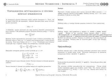 Metody Numeryczne : Instrukcja 7 Ł. Łaniewski-Wołłk Creative Commons License: Attribution Share Alike Zadanie Topologiczna optymalizacja z użyciem równań sprzeżonych Na dzisiejszych zajęciach dobierzemy wektor grubości elementów θ = ‘thick‘, tak by ugięcie belki było jak najmniejsze. Jedynym elementem który zależy od θ jest macierz sztywności: S(θ)x = F A dokładniej: macierz sztywności jest sumą macierzy elementów przemnożonych przez elementy θ. Dla późniejszej poprawy zbieżności dołożymy potęgę γ = 3 do tej zależności: X γ S(θ) = θk K k i Będziemy chcieli zoptymalizować przesunięcie węzła w którym przyłożyliśmy siłę. Stwórzmy wektor g, który ma −1 w miejscu tego przemieszczenia, a resztę wartości ma zerową. Teraz nasza funkcja celu to J = −hx, gi. Potraktujmy nasze równanie statyki jako więz i rozpiszmy funkcję celu powiększoną o mnożniki Lagrange: X X X − xi gi + λj ( Sji (θ)xi − Fj ) i j Zadanie Zdefiniuj wektor g i rozwiąż równanie sprzężone (zauważ że S jest symetryczna). Zadanie Zdefiniuj funkcję calc\_grad(int n, double * x, double * lambda, double * grad). Skopiuj do niej zawartość funkcji mnożącej SMult i zmień:\ r[$\diamondsuit$] += x[$\spadesuit$]*pow(thick[$\clubsuit$],gamma)*$\heartsuit na:\ grad[$\clubsuit$] += gamma*pow(thick[$\clubsuit$],gamma-1)*lambda[$\diamon Wyświetl tak policzony gradient. Pamiętaj, że gradient ma taką samą długość jak thick, czyli mx*my. Pamiętaj także by wyzerować grad i wyciąć część murującą stopnie swobody. Optymalizacja i Optymalne rozwiązanie powinno zerować pochodne po x, λ i θ: P i+ −g j λj Sji (θ) = 0 P =0 i Sji (θ)xi − Fj P ∂ λ S (θ)x =0 i ij j ∂θk ji Drugie równanie to nasze równanie statyki. Pierwsze równanie to równanie sprzężone (adjoint): S T (θ)λ = g Trzecie równanie to równanie ma gradient funkcji celu względem parametrów: X X d ∂ k J= λj Sji (θ)xi = γθkγ−1 Kji (θ)λj xi dθk ∂θ k ij ij 1 Wprowadź w funkcji mnożącej przez macierz sztywności SMult parametr γ = 3 (gamma) podnosząc thick do potęgi gamma. Zdefiniuj zmienną ‘f rac‘ = 0.5 i ustaw początkowe θ (thick) na równe frac. Gradient wskazuje nam w jakim kierunku powinniśmy przesuwać nasze wartości parametrów by uzyskać lepszy wynik. Pierwszym nasuwającym się schematem postępowania byłoby:\ thick[i] += grad[i]; Zadanie Dodaj gradient do parametrów thick[i] += grad[i];. Iteruj taką procedurę, oglądając wyniki. Tak ustawiony problem optymalizacyjny jest nieograniczony. Chcemy jednak uzyskać najmniejsze ugięcie przy ustalonej „masie” belki. Tzn: chcemy zachować P sumę parametrów θ: ‘thick[i]‘ = ‘f rac ∗ mx ∗ my‘. Możemy łatwo nałożyć ten i więz na grad: Wydział Mechaniczny Energetyki i Lotnictwa, Politechnika Warszawska 2 Ł. Łaniewski-Wołłk Metody Numeryczne : Instrukcja 7 Zadanie Odejmij od wektora grad jego sumę. W kolejnych iteracjach grad ma różną skalę. Na początku jest duży, a później mały. Typową techniką w takich wypadkach jest normalizacja: Zadanie Zdefiniuj zmienną move = 0.05. Podziel grad przez jego największy element i pomnóż przez move*5. Na nasz projekt musimy jednak narzucić bardziej istotne warunki. Po pierwsze nigdzie grubość nie może przekroczyć 1, i musi być powyżej 0. Ponadto zazwyczaj chcemy, by zmiana w pojedynczej iteracji nie przekroczyła move. Te warunki dość trudno pogodzić z warunkiem stałej sumy elementów. Zadanie Wynik dodania gradientu do parametrów wstaw do nowego wektora nt[i] = thick[i] + grad[i];. Dla danego parametru scale oblicz thick[i] = scale * nt[i];. Na tak obliczone thick narzuć powyżej opisane 4 warunki, obcinając za duże, bądź za małe wartości. Zadanie ZsumujP wartości thick po poprzedniej procedurze. Dobierz scale metodą bisekcji tak by i ‘thick[i]‘ = ‘f rac ∗ mx ∗ my‘. Zadanie Przetestuj program dla różnych obciążeń, ustawień parametru move i ustawień maksymalnej liczby iteracji w metodze gradientów sprzężonych. 3 Wydział Mechaniczny Energetyki i Lotnictwa, Politechnika Warszawska Creative Commons License: Attribution Share Alike