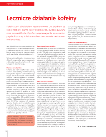 Farmakoterapia Lecznicze działanie kofeiny Kofeina jest alkaloidem ksantynowym. Jej źródłem są liście herbaty, ziarna kawy i kakaowca, owoce guarany oraz orzeszki kola. Oprócz wspomagania sprawności psychofizycznej kofeina ma bardzo szerokie zastosowanie lecznicze. Jest składnikiem wielu preparatów przeciwbólowych i przeciwmigrenowych, a także stosowanych w trakcie przeziębienia oraz w leczeniu niepowściągliwych wymiotów u kobiet ciężarnych. W kosmetologii kofeinę stosuje się jako składnik preparatów wspomagających odchudzanie, antycellulitowych i ułatwiających detoksykację. Metabolizm kofeiny Kofeina jest niemal całkowicie wchłaniana w przewodzie pokarmowym i jej maksymalne stężenie we krwi obserwuje się po 30–60 minutach od momentu zażycia. Z łatwością przenika przez barierę krew–mózg, łożysko, dociera do płynu owodniowego, mleka i nasienia. Nie kumuluje się w organizmie, a jej biologiczny okres półtrwania wynosi 3–4 godziny, chociaż znacząco się wydłuża u kobiet stosujących doustne środki antykoncepcyjne (5–10 godzin), w ciąży (9–11 godzin), u pacjentów z rozpoznanymi chorobami wątroby, u donoszonych noworodków (80 godzin) i wcześniaków (100 godzin), natomiast skraca się o 30–50% u nałogowych palaczy tytoniu. Kofeina jest metabolizowana w wątrobie do aktywnych metabolitów: paraksantyny, teobrominy i teofiliny o działaniu lipolitycznym, rozszerzającym naczynia krwionośne i rozkurczającym mięśniówkę gładką oskrzeli. Nowe badania sugerują, że kofeina zmniejsza stężenie histaminy, co może być przydatne w leczeniu reakcji alergicznych w drogach oddechowych. 18 Bezpieczeństwo kofeiny Wpływ kofeiny na organizm ludzki zależy od zastosowanej dawki. Kofeina przyjęta w ilości 100–600 mg przyspiesza tok myśli i poprawia funkcjonowanie organizmu, ale jej dawki powyżej 2000 mg powodują bezsenność, drżenia mięśniowe, zaburzenia układu sercowo-naczyniowego, upośledzenie koordynacji ruchowej i przyspieszenie oddechu. Kofeina wywiera działanie przeciwnowotworowe w przypadku raka jelita grubego i wątroby. Z kolei moczopędne działanie kofeiny wypłukuje toksyny, co może mieć istotne znaczenie w przypadku ograniczania rozrostu nowotworów pęcherza moczowego. Mechanizm działania Kofeina działa pobudzająco, wyłączając mechanizmy hamujące neurony, głównie w wyniku blokowania w mózgu receptorów adenozyny. Jest ona również inhibitorem kompetencyjnym enzymu cAMP-fosfodiesterazy, który bierze udział w wielu reakcjach biochemicznych. Wynikiem hamowania tego enzymu jest zwiększenie aktywności i wydłużenie czasu działania licznych hormonów, np. glukagonu, wazopresyny, kortyzolu. Kofeina poprzez hamowanie receptorów adenozynowych ogranicza wychwyt glukozy przez mięśnie, co powoduje wzrost poziomu cukru we krwi i jest potencjalnym mechanizmem upośledzającym tolerancję glukozy. Ponadto, poprzez zwiększenie stężenia adrenaliny, zmniejsza wrażliwość i nasila oporność na insulinę. Niekorzystny wpływ kofeiny jest stanem przejściowym, ze względu na rozwój tolerancji. Istnieją doniesienia epidemiologiczne wskazujące, że picie kawy, która jest podstawowym naturalnym źródłem kofeiny, może zmniejszyć ryzyko rozwoju cukrzycy typu 2. Niektóre publikacje sugerują, że kofeina ma działanie antyoksydacyjne, ale mechanizm tego zjawiska nie jest obecnie dokładnie poznany. Kofeina a układ nerwowy Kofeina wywiera umiarkowane działanie pobudzające na ośrodkowy układ nerwowy, przez co poprawia samopoczucie i znosi uczucie zmęczenia. Ma ona wpływ na zwiększenie motywacji, spostrzegawczości i koncentracji przy wykonywaniu zadań monotonnych, wymagających długotrwałej uwagi, poprawia pamięć krótkotrwałą. Pobudza ośrodki wegetatywne: oddechowy, naczynioruchowy i nerwu błędnego. Kofeina zwiększa wydzielanie neuroprzekaźników: dopaminy, noradrenaliny, adrenaliny, acetylocholiny, serotoniny. W dawkach większych zwiększa odczucia negatywne, m.in. lęk, niepokój, powoduje zdenerwowanie, ogólne pogorszenie nastroju i ma negatywny wpływ na pamięć długotrwałą, co jest głównie rezultatem hamującego wpływu na neurogenezę w hipokampie. Z drugiej strony niektóre badania wskazują na korzystny efekt kofeiny ograniczający ryzyko procesów neurodegeneracji, np. choroby Parkinsona czy Alzheimera. Po dłuższym okresie regularnego przyjmowania kofeiny występuje zjawisko tolerancji, prowadzącej do stopniowego osłabienia odpowiedzi biologicznej ustroju. Ponadto kofeina zwiększa efektywność działania przeciwbólowego paracetamolu ze względu na wywieranie efektu stymulującego centralny układ nerwowy i ograniczanie złego samopoczucia, zawsze towarzyszącego bólowi. Taki synergizm jest dobrze udowodniony w odniesieniu do bólów głowy, co sugeruje dużą przydatność złożonych preparatów. Kofeina podawana łącznie z paracetamolem daje efekt o 170% większy niż paracetamol stosowany w monoterapii. dr n. farm. Anna Gajos
