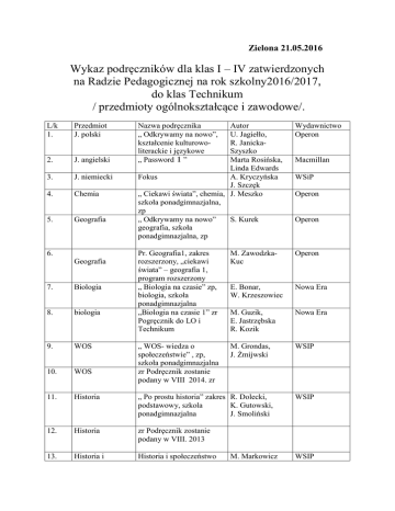 Zielona 21.05.2016 Wykaz podręczników dla klas I – IV zatwierdzonych na Radzie Pedagogicznej na rok szkolny2016/2017, do klas Technikum / przedmioty ogólnokształcące i zawodowe/. L/k 1. Przedmiot J. polski 2. J. angielski 3. J. niemiecki 4. Chemia 5. Geografia 6. Geografia Nazwa podręcznika „ Odkrywamy na nowo”, kształcenie kulturowoliterackie i językowe 1 „ Password @” Autor U. Jagiełło, R. JanickaSzyszko Marta Rosińska, Linda Edwards Fokus A. Kryczyńska J. Szczęk „ Ciekawi świata”, chemia, J. Meszko szkoła ponadgimnazjalna, zp „ Odkrywamy na nowo” S. Kurek geografia, szkoła ponadgimnazjalna, zp Wydawnictwo Operon Pr. Geografia1, zakres rozszerzony, „ciekawi świata” – geografia 1, program rozszerzony „ Biologia na czasie” zp, biologia, szkoła ponadgimnazjalna „Biologia na czasie 1” zr Pogręcznik do LO i Technikum M. ZawodzkaKuc Operon E. Bonar, W. Krzeszowiec Nowa Era M. Guzik, E. Jastrzębska R. Kozik Nowa Era „ WOS- wiedza o społeczeństwie” , zp, szkoła ponadgimnazjalna zr Podręcznik zostanie podany w VIII 2014. zr M. Grondas, J. Żmijwski WSIP 7. Biologia 8. biologia 9. WOS 10. WOS 11. Historia „ Po prostu historia” zakres R. Dolecki, podstawowy, szkola K. Gutowski, ponadgimnazjalna J. Smoliński 12. Historia zr Podręcznik zostanie podany w VIII. 2013 13. Historia i Historia i społeczeństwo M. Markowicz Macmillan WSiP Operon Operon WSIP WSIP 14. 15. społeczeństwoprzed. uzupełń. Matematyka „Ojczysty Panteon i ojczyste spory” Matematyka, „Poznać zrozumieć”, zakres podstawowy „ Poznać zrozumieć” matematyka, zakres rozszerzony „ Odkryć fizykę” zakres podstawowy, szkoła ponadgimnazjalna „Zrozumieć fizykę” szkoła ponadgimnazjalna – zr. 16. Matematyka zakres rozszerzony Fizyka 17. Fizyka 18. Wiedza o kulturze „ Ciekawi świata” wiedza o kulturze, zakres podstawowy, szkoła ponadgimnazjalna Informatyka Informatyka dla szkół Ponadgimnazjalnych, zakres podstawowy Podstawy „ Odkrywamy na nowo” – przedsiębiorczości podstawy przedsiębiorczości, zakres podstawowy Religia „ Moja miejsce w Kościele 19. 20. 21. 22. Edukacja dla bezpieczeństwa 23.TR Produkcja zwierzęca 24.TR Technika w rolnictwie 25.TR Produkcja roślinna 27.TR Prowadzenie produkcji rolniczej 28.TI Systemy operacyjne 29.TI Urządzenia O. Pytlińska A.Wyroda A. Przychoda WSIP M. Mularska Operon M. Braun, W. Śliwa Nowa Era M. Braun A.SewerynByczuk K. Byczuk E. Wójtowicz A. Kisielewska, A. Kisielewska A. Prochyra Operon G. Koba Migra J. Korba, Z. Smutek Operon Ks. J. Szepta D. Jackowiak „ Odkrywamy na nowo” edukacja dla bezpieczeństwa Produkcja zwierzęca cz.I m. Goniewicz, Operon A. Nowak- Kowal Anna Rekiel Hortpress „ Mechanizacja w rolnictwie” cz. I, II „ Produkcji roślinne”, cz.I, II, III Produkcja rolnicza cz. 1,2,3 Produkcja zwierzęca cz. 1,2,3 „Kwalifikacja E.12.Montaż i eksploatacja komputerów i urządzeń peryferyjnych” A. Lisowski Hortpress W. Grzebisz Hortpress Praca zbiorowa W. Grzebisz A. Rekiel Hortpress T. Kowalski Helion „Kwalifikacja T. Kowalski Helion techniki komputerowej E.12.Montaż i eksploatacja komputerów i urządzeń peryferyjnych” 30.TI Sieci komputerowe „Kwalifikacja E.13 : projektowanie lokalnych sieci komputerowych i administrowanie sieciami” P. Bensen B. Halska Helion 31.TI Witryny i aplikacje komputerowe Diagnostyka i naprawa sieci komputerowych „ witryny internetowe „Aplikacje internetowe” Małgorzata Łokińska WSIP „Kwalifikacja T. Kowalski E.12.Montaż i eksploatacja komputerów i urządzeń peryferyjnych” Helion Administracja sieciowymi systemami operacyjnymi 34.TE Przedsiębiorca w gospodarce rynkowej 35.TE Analiza ekonomiczna i sprawozdawczość 36.TE Działalność przedsiębiorstwa „Administracja sieciowymi Krzysztof Pytel, systemami operacyjnymi” Sylwia Osetek WSIP „Podstawy ekonomii mikro Janina i makro” MierzejewskaMajcherek. „Ekonomika i organizacja Damian Dębski przedsiębiorstw” Difin „Organizacja pracy biurowej” Mitura Elżbieta Difin 37.TA Działalność gospodarcza w agrobiznesie „Agrobiznes, Podstawy ekonomiki” Benedykt Pepliński WSIP 38.TA Produkcja roślinna „Produkcja roślinna cz. 1,2,3” Praca zbiorowa W. Grzebisz Hortpress 39.TA Produkcja zwierzęca „Produkcja zwierzęca cz. 1,2,3” A. Rekiel Hortpress 40.TA Technika w rolnictwie „Mechanizacja w rolnictwie cz. 1” A.Lisowski Hortpress 41.TA Produkcja rolnicza Produkcja rolnicza cz. 1,2,3 Produkcja zwierzęca cz. 1,2,3 W. Grzebisz A. Rekiel Hortpress 42. „Podstawy architektury E. Gadomska, Hortpress 32.TI 33.TI Podstawy WSIP T.arch architektury krajobrazu 43. Rośliny ozdobne T.arch. w architekturze krajobrazu krajobrazu cz. I”, „Urządzenie i pielęgnacja terenów zieleni cz. I” „Rośliny ozdobne w architekturze krajobrazu cz. I” K. Gańko, M. Garczarczyk, K. Zinowiec Cieplik, E. Gadomska, K. Gadomska Hortpress E. Gadomska, Hortpress P. Sikorski, W.Smogorzewska, M. Wierzba, Cz. Wysocki 44. Pracownia T.arch. projektów architektury krajobrazu „ Urządzanie i pielęgnacja terenów zieleni cz. II, tom I” E. Gadomska Hortpress 45. Pracownia T.arch. obiektów architektury krajobrazu „Urządzanie i pielęgnacja terenów zieleni cz. II, tom II i tom III” „Urządzanie i pielęgnacja terenów zieleni cz. III” K. Gadomska Hortpress Hortpress 46. Ochrona i T.arch. kształtowanie krajobrazu „ Podstawy architektury krajobrazu cz. II” B. FortunaAntoszkiewicz, E. Gadomska, K.Gadomski E. Gadomska, A. Różańska, D. Sikora Hortpress Podręczniki zawodowe do Technikum Weterynarii. Nr 47. 48. Przedmioty zawodowe klasa Anatomia I i fizjologia zwierząt II Diagnostyka Podręczniki Anatomia i fizjologia zwierząt domowych, Klaus Loeffler ZWL Anatomia zwierząt tom 1,2,3 K. Krysiak, H. Kobry, F. Kobryńczuk, WN PWN Atlas anatomii topograficznej zwierząt domowych, Peter Popesko PWRiL Atlas małych zwierząt laboratoryjnych, Peter Pope