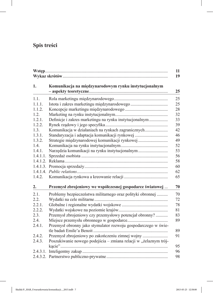 Spis treści Wstęp................................................................................................................. 11 Wykaz skrótów................................................................................................. 19 1. Komunikacja na międzynarodowym rynku instytucjonalnym – aspekty teoretyczne........................................................................ 25 1.1. 1.1.1. 1.1.2. 1.2. 1.2.1. 1.2.2. 1.3. 1.3.1. 1.3.2. 1.4. 1.4.1. 1.4.1.1. 1.4.1.2. 1.4.1.3. 1.4.1.4. 1.4.2. Rola marketingu międzynarodowego.................................................. 25 Istota i zakres marketingu międzynarodowego................................... 25 Koncepcje marketingu międzynarodowego........................................ 28 Marketing na rynku instytucjonalnym................................................. 32 Definicje i zakres marketingu na rynku instytucjonalnym.................. 33 Rynek rządowy i jego specyfika.......................................................... 39 Komunikacja w działaniach na rynkach zagranicznych...................... 42 Standaryzacja i adaptacja komunikacji rynkowej............................... 46 Strategie międzynarodowej komunikacji rynkowej............................ 49 Komunikacja na rynku instytucjonalnym............................................ 52 Narzędzia komunikacji na rynku instytucjonalnym............................ 53 Sprzedaż osobista................................................................................ 56 Reklama............................................................................................... 58 Promocja sprzedaży............................................................................. 60 Public relations.................................................................................... 62 Komunikacja rynkowa a kreowanie relacji......................................... 65 2. Przemysł zbrojeniowy we współczesnej gospodarce światowej.... 70 2.1. 2.2. 2.2.1. 2.2.2. 2.3. 2.4. 2.4.1. Problemy bezpieczeństwa militarnego oraz polityki obronnej........... Wydatki na cele militarne.................................................................... Globalne i regionalne wydatki wojskowe........................................... Wydatki wojskowe na poziomie krajów.............................................. Przemysł zbrojeniowy czy przemysłowy potencjał obronny?............ Miejsce przemysłu obronnego w gospodarce...................................... Przemysł obronny jako stymulator rozwoju gospodarczego w świetle badań Emile’a Benoit..................................................................... 2.4.2. Przemysł zbrojeniowy po zakończeniu zimnej wojny........................ 2.4.3. Poszukiwanie nowego podejścia – zmiana relacji w „żelaznym trójkącie”................................................................................................... 2.4.3.1. Inteligentny zakup............................................................................... 2.4.3.2. Partnerstwo publiczno-prywatne......................................................... Skulski P._HAB_Uwarunkowania komunikacji..._2013.indb 7 70 72 78 81 83 89 89 91 95 96 98 2013-05-23 12:58:00 8 Spis treści 2.4.3.3. Partnerstwo technologiczne................................................................. 2.5. Internacjonalizacja i globalizacja przemysłu zbrojeniowego na przełomie XX i XXI wieku........................................................................ 2.5.1. Proces umiędzynarodowienia przemysłu zbrojeniowego................... 2.5.2. Prywatyzacja przemysłu zbrojeniowego............................................. 2.5.3. Konsolidacja przemysłu zbrojeniowego.............................................. 2.5.4. Globalizacja przemysłu zbrojeniowego na początku XXI wieku....... 101 104 105 108 110 114 3. Międzynarodowy rynek uzbrojenia................................................. 120 3.1. 3.2. 3.2.1. 3.2.2. 3.2.3. 3.2.4. 3.2.5. 3.3. 3.3.1. 3.3.2. 3.4. 3.4.1. 3.4.2. 3.4.3. 3.4.4. 3.4.4.1. 3.4.4.2. 3.4.4.3. 3.4.4.4. 3.4.4.5. 3.4.4.6. 3.5. 3.5.1. Charakterystyka rynku uzbrojenia i sprzętu wojskowego................... Uczestnicy rynku uzbrojenia............................................................... Producenci........................................................................................... Pośrednicy........................................................................................... Odbiorcy.............................................................................................. Kontrolerzy.......................................................................................... Podmioty wspierające.......................................................................... Segmentacja międzynarodowego rynku uzbrojenia............................ Produkty oferowane na rynku uzbrojenia i sprzętu wojskowego........ Usługi i oprogramowanie.................................................................... Rodzaje dostaw na międzynarodowym rynku broni........................... Sprzedaż.............................................................................................. Darowizna............................................................................................ Leasing i dzierżawa............................................................................. Kooperacja przemysłowa.................................................................... Alianse strategiczne............................................................................. Joint venture........................................................................................ Porozumienia zespołowe .................................................................... Licencjonowanie.................................................................................. Kontrakty na poddostawy . ................................................