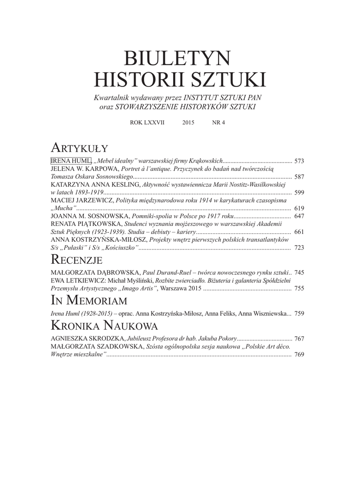 BIULETYN HISTORII SZTUKI Kwartalnik wydawany przez INSTYTUT SZTUKI PAN oraz STOWARZYSZENIE HISTORYKÓW SZTUKI ROK LXXVII ARTYKU£Y 2015 NR 4 IRENA HUML, Mebel idealny warszawskiej firmy Kr¹kowskich............................................ JELENA W. KARPOWA, Portret à l’antique. Przyczynek do badañ nad twórczoci¹ Tomasza Oskara Sosnowskiego................................................................................................. KATARZYNA ANNA KESLING, Aktywnoæ wystawiennicza Marii Nostitz-Wasilkowskiej w latach 1893-1919................................................................................................................... MACIEJ JARZEWICZ, Polityka miêdzynarodowa roku 1914 w karykaturach czasopisma Mucha................................................................................................................................... JOANNA M. SOSNOWSKA, Pomniki-spolia w Polsce po 1917 roku................................... RENATA PI¥TKOWSKA, Studenci wyznania moj¿eszowego w warszawskiej Akademii Sztuk Piêknych (1923-1939). Studia debiuty kariery.......................................................... ANNA KOSTRZYÑSKA-MI£OSZ, Projekty wnêtrz pierwszych polskich transatlantyków S/s Pu³aski i S/s Kociuszko............................................................................................. RECENZJE 573 587 599 619 647 661 723 MA£GORZATA D¥BROWSKA, Paul Durand-Ruel twórca nowoczesnego rynku sztuki.. 745 EWA LETKIEWICZ: Micha³ Myliñski, Rozbite zwierciad³o. Bi¿uteria i galanteria Spó³dzielni Przemys³u Artystycznego Imago Artis, Warszawa 2015 ...................................................... 755 IN MEMORIAM Irena Huml (1928-2015) oprac. Anna Kostrzyñska-Mi³osz, Anna Feliks, Anna Wiszniewska... 759 KRONIKA NAUKOWA AGNIESZKA SKRODZKA, Jubileusz Profesora dr hab. Jakuba Pokory................................... 767 MA£GORZATA SZADKOWSKA, Szósta ogólnopolska sesja naukowa Polskie Art déco. Wnêtrze mieszkalne................................................................................................................. 769 BULLETIN OF ART HISTORY A quarterly published by the INSTITUTE OF ART HISTORY OF THE POLISH ACADEMY OF SCIENCES (IS-PAN) in conjunction with the ART HISTORIANS SOCIETY YEAR LXXVII ARTICLES 2015 No. 4 IRENA HUML, An Ideal Piece of Furniture from Warsaws T&W Kr¹kowscy Company..... JELENA W. KARPOWA, Alantique Portrait. Contribution to the Research into Tomasz Oskar Sosnowskis Oeuvre......................................................................................................... KATARZYNA ANNA KESLING, Exhibition activity of Maria Nostitz-Wasilkowska in the years 1893-1919....................................................................................................................... MACIEJ JARZEWICZ, International Politics in the Mucha Magazines Caricatures in 1914........................................................................................................................................... JOANNA M. SOSNOWSKA, Monuments-Spolia in Poland after 1917................................ RENATA PI¥TKOWSKA, Jewish Students at the Warsaw Academy of Fine Arts (19231939). Study Debuts Careers............................................................................................... ANNA KOSTRZYÑSKA-MI£OSZ, Interior Design of the First Polish Transatlantic Liners SS Pu³aski and SS Kociuszko................................................................................................ 573 587 599 619 647 661 723 REVIEWS MA£GORZATA D¥BROWSKA, Paul Durand-Ruel: Creator of Modern Art Market.......... 745 EWA LETKIEWICZ: Micha³ Myliñski, Rozbite zwierciad³o. Bi¿uteria i galanteria Spó³dzielni Przemys³u Artystycznego Imago Artis [Broken Mirror. Jewellery and Accessories from Imago Artis Artistic Industry Cooperative], Warszawa 2015........................... 755 IN MEMORIAM Irena Huml (1928-2015) by Anna Kostrzyñska-Mi³osz, Anna Feliks, Anna Wiszniewska.... 759 ACADEMIC CRONICLE AGNIESZKA SKRODZKA, Prof. Jakub Pokoras Jubielee................................................... 767 MA£GORZATA SZADKOWSKA, Sixth National Symposium: Polish Art Deco Dwelling Interior.................................................................................................................................... 769
