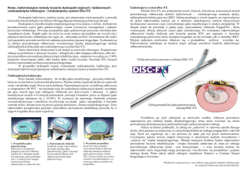 Nowe, małoinwazyjne metody leczenia dyskopatii szyjnych i lędźwiowych: nukleoplastyka koblacyjna i endoskopowy system Disc-FX Dyskopatia lędźwiowa, rzadziej szyjna, jest utrapieniem wielu pacjentów z powodu niezwykle silnych dolegliwości bólowych kręgosłupa promieniujących do nogi lub ręki. Dyskopatia to choroba krążka międzykręgowego (tzw dysku), w której dochodzi do przemieszczenia części jądra galaretowatego, czemu towarzyszy rozciągnięcie i pękanie pierścienia włóknistego. Powstaje przepuklina jądra galaretowego potocznie określana jako wypadnięcie dysku. Dopóki jądro nie wróci na swoje miejsce (przepuklina nie wycofa się) i pęknięcie pierścienia włóknistego nie zagoi się - utrzymują się bóle. Od niedawna dla części tych pacjentów powstała możliwość uniknięcia poważnej operacji kręgosłupa. Tą alternatywą są zabiegi przezskórnego odbarczenia wewnętrznego krążka międzykręgowego metodą nukleoplastyki koblacyjnej oraz endoskopowego systemu Disc-FX. Nasze obserwacje skuteczności tych metod są niezwykle obiecujące. Proponowane zabiegi są przełomem w procesie leczenia - dolegliwości albo ustępują całkowicie, albo też przy prawidłowo prowadzonej dalszej terapii rehabilitacyjnej - stopniowo wycofują się. U 80% pacjentów obserwujemy dobre, albo bardzo dobre wyniki leczenia. Pozostałe 20% chorych niestety musi poddać się klasycznej operacji kręgosłupa. W przypadku dyskopatii szyjnej wykonujemy nukleoplastykę koblacyjną, przy dyskopatii lędźwiowej proponujemy endoskopowe usunięcie dysku systemem Disc-FX. Nukleoplastyka koblacyjna Przez kaniulę wprowadzamy do środka jądra miażdżystego specjalną elektrodę , która na swoim końcu wytwarza łuk plazmowy. Plazma rozbija cząsteczki dysku na cząsteczki wody i dwutlenku węgla. Proces ten to koblacja. Najważniejsze jest to, że koblacja odbywa się w temperaturze 40-50°C - nie dochodzi więc do uszkodzenia okolicznych tkanek i powikłań, jak przy innych tego typu zabiegach. Elektroda jest aktywowana i obracana w jądrze miażdżystym zwykle w 6 różnych położeniach- powstaje 6 kanałów, przez co objętość jądra miażdżystego zmniejsza się o 10-20%. To wystarcza do znacznego obniżenia ciśnienia wewnątrzdyskowego i umożliwia wycofywanie się tkanki jądra z przepukliny w kierunku centrum dysku. Rozpoczyna się proces gojenia pierścienia i krążka międzykręgowego. Teraz odpowiednie postępowanie pacjenta i prawidłowo prowadzona rehabilitacja pozwolą, by w ciągu 4-6 tygodni chory dysk wygoił się. } pierścień jądro 1. Przepuklina jądra galaretowatego Jądro przez rozciągnięty i popękany pierścień włóknisty wpukla się w kierunku kanału korzeniowego, gdzie przebiega nerw. Uciśnięty nerw reaguje intensywnym bólem odczuwanym w nodze lub ręce. 2. Wprowadzenie elektrody Elektroda zostaje wprowadzona do środka chorego jądra galaretowatego, gdzie wykonuje się procedurę koblacji czyli odparowania tkanki jądra galaretowatego. 3. Wycofanie przepukliny Sześć lub więcej kanałów wytworzonych przez aktywną elektrodę zmniejsza objętość jądra galaretowatego o około 20%. Istotnie obniża się również ciśnienie wewnątrzdyskowe, co razem powoduje wycofanie się przepukliny. Endoskopowy system Disc-FX Metoda Disc-FX jest połączeniem trzech różnych, dotychczas stosowanych metod przezskórnego odbarczania dysków lędźwiowych : endoskopowego usunięcia dysku, nukleoplastyki koblacyjnej oraz IDET. Zabieg przebiega w trzech etapach- po wprowadzeniu do dysku odpowiedniej kaniuli, jak w metodzie endoskopowej, małymi kleszczykami mechanicznie usuwamy część zwyrodniałego jądra miażdżystego w okolicy przepukliny. W drugim etapie do powstałej w jądrze jamy wprowadzamy elektrodę TriggerFlex , którą wykonujemy ablację dalszych części jądra miażdżystego. Po wykonaniu odpowiedniego odbarczenia krążka elektroda pod kontrolą aparatu RTG jest zaginana w kierunku uszkodzonego pierścienia, który następnie koaguluje się od wewnątrz, jak w metodzie IDET. Miejsce pęknięcia pierścienia obkurcza się, a przepuklina szybciej wycofuje się. Wprowadzenie endoskopu na każdym etapie zabiegu umożliwia kontrolę adekwatnego odbarczenia dysku. Elektroda wykorzystywana w zabiegu DISC-FX Zabieg przepukliny jądra galaretowatego metodą DISC-FX Powikłania po tych zabiegach są niezwykle rzadkie. Jedynym poważnym zagrożeniem jest infekcja krążka międzykręgowego, która może rozwinąć się mimo prowadzonej okołooperacyjnej antybiotykoterapii i pełnej sterylności zabiegu. Należy na koniec podkreślić, że zabieg nie „uzdrawia” w cudowny sposób chorego dysku, choć pacjenci są zaskoczeni, że często bezpośrednio po zabiegu ustępują bóle z ręki lub nogi. Dysk nie regeneruje się i nie powraca do stanu jaki był przed zachorowaniem. Uzyskujemy jedynie pewien stopień równowagi w określonym stadium zwyrodnienia i „zużycia się” krążka międzykręgowego. Dlatego kolejnym krokiem będzie odpowiednio prowadzone leczenie rehabilitacyjne - terapia manualna adekwatna do stanu po zabiegu przezskórnego odbarczenia dysku oraz kinezyterapia – a więc leczenie ruchem, bo odpowiednie ruchy kręgosłupa mogą przyspieszyć wycofywanie się przepukliny i gojenie chorego dysku. Pełen zakres takich zabiegów znajdziecie Państwo w Centrum Terapii Kręgosłupa w Jaworznie. Wiadomości zamieszczone w tym folderze mają jedynie charakter informacyjny, nie mogą być traktowane jako porada lekarska.