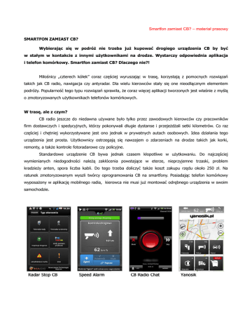 Smartfon zamiast CB? – materiał prasowy SMARTFON ZAMIAST CB? Wybierając się w podróż nie trzeba już kupować drogiego urządzenia CB by być w stałym w kontakcie z innymi użytkownikami na drodze. Wystarczy odpowiednia aplikacja i telefon komórkowy. Smartfon zamiast CB? Dlaczego nie?! Miłośnicy „czterech kółek” coraz częściej wyruszając w trasę, korzystają z pomocnych rozwiązań takich jak CB radio, nawigacja czy antyradar. Dla wielu kierowców stały się one nieodłącznym elementem podróży. Popularność tego typu rozwiązań sprawiła, że coraz więcej aplikacji tworzonych jest właśnie z myślą o zmotoryzowanych użytkownikach telefonów komórkowych. W trasę, ale z czym? CB radio jeszcze do niedawna używane było tylko przez zawodowych kierowców czy pracowników firm dostawczych i spedycyjnych, którzy pokonywali długie dystanse i przejeżdżali setki kilometrów. Co raz częściej i chętniej wykorzystywane jest ono jednak w prywatnych autach osobowych. Idea działania tego urządzenia jest prosta. Użytkownicy ostrzegają się nawzajem o zdarzeniach na drodze takich jak korki, remonty, a także kontrole fotoradarowe czy policyjne. Standardowe urządzenie CB bywa jednak czasem kłopotliwe w użytkowaniu. Do najczęściej wymienianych niedogodności należą zakłócenia powstające w eterze, nieprzyjemne trzaski, problem kradzieży anten, spora liczba kabli. Do tego trzeba doliczyć także koszt zakupu rzędu około 250 zł. Na ratunek zmotoryzowanym wyszli twórcy oprogramowania CB na smartfony. Posiadając telefon komórkowy wyposażony w aplikację mobilnego radia, kierowca nie musi już montować odrębnego urządzenia w swoim samochodzie. Smartfon zamiast CB? – materiał prasowy CB Radio w smartfonie Mobilne CB radio można mieć zawsze przy sobie. Stanowi ono bowiem integralną część telefonu i niezależnie od tego gdzie jesteśmy, zawsze mamy do niego dostęp. Na rynku dostępnych jest kilka rozwiązań. Mobilne CB dostępne jest dla większości systemów operacyjnych. Możliwości tych programów jest wiele, a przy tym są one łatwe i wygodne w obsłudze. Niektóre z nich, tak jak CB Radio Chat czy Radar STOP CB, umożliwiają swoim użytkownikom prowadzenie bezpośredniej rozmowy, jak przez tradycyjne CB. Dodatkowo SpeedAlarm czy Yanosik pozwalają na wysłanie ostrzeżenia o kontroli policyjnej czy radarowej za pomocą naciśnięcia odpowiedniego przycisku na ekranie. Ponadto są także takie, które posiadają funkcję nawigacji czy traffic online (Yanosik). Koszty miesięcznego użytkowania w zależności od dostępnych aplikacji wahają się w granicach od 0 do 30 zł. Liczba mobilnych CB spełniających funkcję podobną do standardowego CB radia rośnie. Aplikacje stworzone z myślą o smartfonach wzbogacone są o szereg możliwości, których brakuje w tradycyjnym CB. Warto zatem zastanowić się czy postawić na klasykę czy nowoczesność. Źródło: Creandi.pl ------------------------------Dystrybucja materiałów: Anna Ciesielska [email protected]