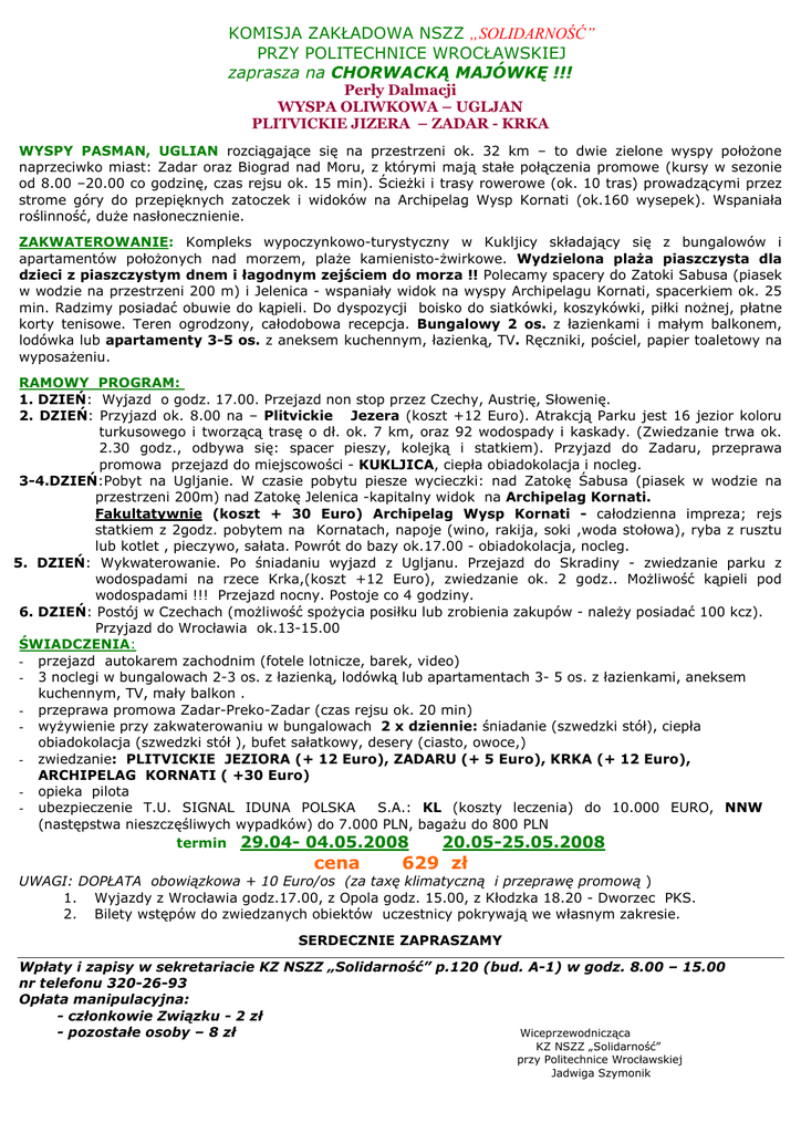 KOMISJA ZAKŁADOWA NSZZ „SOLIDARNOŚĆ” PRZY POLITECHNICE WROCŁAWSKIEJ zaprasza na CHORWACKĄ MAJÓWKĘ !!! Perły Dalmacji WYSPA OLIWKOWA – UGLJAN PLITVICKIE JIZERA – ZADAR - KRKA WYSPY PASMAN, UGLIAN rozciągające się na przestrzeni ok. 32 km – to dwie zielone wyspy połoŜone naprzeciwko miast: Zadar oraz Biograd nad Moru, z którymi mają stałe połączenia promowe (kursy w sezonie od 8.00 –20.00 co godzinę, czas rejsu ok. 15 min). ŚcieŜki i trasy rowerowe (ok. 10 tras) prowadzącymi przez strome góry do przepięknych zatoczek i widoków na Archipelag Wysp Kornati (ok.160 wysepek). Wspaniała roślinność, duŜe nasłonecznienie. ZAKWATEROWANIE: Kompleks wypoczynkowo-turystyczny w Kukljicy składający się z bungalowów i apartamentów połoŜonych nad morzem, plaŜe kamienisto-Ŝwirkowe. Wydzielona plaŜa piaszczysta dla dzieci z piaszczystym dnem i łagodnym zejściem do morza !! Polecamy spacery do Zatoki Sabusa (piasek w wodzie na przestrzeni 200 m) i Jelenica - wspaniały widok na wyspy Archipelagu Kornati, spacerkiem ok. 25 min. Radzimy posiadać obuwie do kąpieli. Do dyspozycji boisko do siatkówki, koszykówki, piłki noŜnej, płatne korty tenisowe. Teren ogrodzony, całodobowa recepcja. Bungalowy 2 os. z łazienkami i małym balkonem, lodówka lub apartamenty 3-5 os. z aneksem kuchennym, łazienką, TV. Ręczniki, pościel, papier toaletowy na wyposaŜeniu. RAMOWY PROGRAM: 1. DZIEŃ: Wyjazd o godz. 17.00. Przejazd non stop przez Czechy, Austrię, Słowenię. 2. DZIEŃ: Przyjazd ok. 8.00 na – Plitvickie Jezera (koszt +12 Euro). Atrakcją Parku jest 16 jezior koloru turkusowego i tworzącą trasę o dł. ok. 7 km, oraz 92 wodospady i kaskady. (Zwiedzanie trwa ok. 2.30 godz., odbywa się: spacer pieszy, kolejką i statkiem). Przyjazd do Zadaru, przeprawa promowa przejazd do miejscowości - KUKLJICA, ciepła obiadokolacja i nocleg. 3-4.DZIEŃ:Pobyt na Ugljanie. W czasie pobytu piesze wycieczki: nad Zatokę Śabusa (piasek w wodzie na przestrzeni 200m) nad Zatokę Jelenica -kapitalny widok na Archipelag Kornati. Fakultatywnie (koszt + 30 Euro) Archipelag Wysp Kornati - całodzienna impreza; rejs statkiem z 2godz. pobytem na Kornatach, napoje (wino, rakija, soki ,woda stołowa), ryba z rusztu lub kotlet , pieczywo, sałata. Powrót do bazy ok.17.00 - obiadokolacja, nocleg. 5. DZIEŃ: Wykwaterowanie. Po śniadaniu wyjazd z Ugljanu. Przejazd do Skradiny - zwiedzanie parku z wodospadami na rzece Krka,(koszt +12 Euro), zwiedzanie ok. 2 godz.. MoŜliwość kąpieli pod wodospadami !!! Przejazd nocny. Postoje co 4 godziny. 6. DZIEŃ: Postój w Czechach (moŜliwość spoŜycia posiłku lub zrobienia zakupów - naleŜy posiadać 100 kcz). Przyjazd do Wrocławia ok.13-15.00 ŚWIADCZENIA: - przejazd autokarem zachodnim (fotele lotnicze, barek, video) - 3 noclegi w bungalowach 2-3 os. z łazienką, lodówką lub apartamentach 3- 5 os. z łazienkami, aneksem kuchennym, TV, mały balkon . - przeprawa promowa Zadar-Preko-Zadar (czas rejsu ok. 20 min) - wyŜywienie przy zakwaterowaniu w bungalowach 2 x dziennie: śniadanie (szwedzki stół), ciepła obiadokolacja (szwedzki stół ), bufet sałatkowy, desery (ciasto, owoce,) - zwiedzanie: PLITVICKIE JEZIORA (+ 12 Euro), ZADARU (+ 5 Euro), KRKA (+ 12 Euro), ARCHIPELAG KORNATI ( +30 Euro) - opieka pilota - ubezpieczenie T.U. SIGNAL IDUNA POLSKA S.A.: KL (koszty leczenia) do 10.000 EURO, NNW (następstwa nieszczęśliwych wypadków) do 7.000 PLN, bagaŜu do 800 PLN termin 29.04- 04.05.2008 20.05-25.05.2008 cena 629 zł UWAGI: DOPŁATA obowiązkowa + 10 Euro/os (za taxę klimatyczną i przeprawę promową ) 1. Wyjazdy z Wrocławia godz.17.00, z Opola godz. 15.00, z Kłodzka 18.20 - Dworzec PKS. 2. Bilety wstępów do zwiedzanych obiektów uczestnicy pokrywają we własnym zakresie. SERDECZNIE ZAPRASZAMY Wpłaty i zapisy w sekretariacie KZ NSZZ „Solidarność” p.120 (bud. A-1) w godz. 8.00 – 15.00 nr telefonu 320-26-93 Opłata manipulacyjna: - członkowie Związku - 2 zł Wiceprzewodnicząca - pozostałe osoby – 8 zł KZ NSZZ „Solidarność” przy Politechnice Wrocławskiej Jadwiga Szymonik