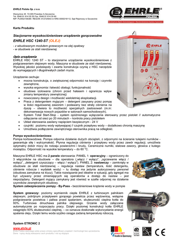 EHRLE Polska Sp. z o.o. Warzymice 45 72-005 Przecław /k.Szczecina Tel. 0048 91 814 55 55 Fax. 0048 91 814 55 60 NIP: PL9552106385 REGON: 812724643 nr KRS 0000216112, Sąd Rejonowy w Szczecinie Karta Produktu Stacjonarne wysokociśnieniowe urządzenie gorącowodne EHRLE HSC 1240-ST (OLEJ) - z wbudowanym modułem grzewczym na olej opałowy - w obudowie ze stali nierdzewnej Opis urządzenia EHRLE HSC 1240 ST – to stacjonarne urządzenie wysokociśnieniowe z podgrzewaniem olejowym wody. Maszyna w obudowie ze stali nierdzewnej. Wysokiej jakości podzespoły i zwarta konstrukcja czynią z HSC narzędzie do wymagających i długotrwałych zadań mycia. Urządzenie cechuje: mocna konstrukcja, o zwiększonej odporności na korozję i czynniki zewnętrzne, wysoka ergonomia i łatwość obsługi; funkcjonalność obudowa izolowana (chroni przed hałasem i ogranicza wpływ zmiany temperatury zewnętrznej) nowoczesny design i możliwość wieloletniej eksploatacji. Praca z detergentem myjącym – detergent zasysany przez pompę w ilości regulowanej zaworem i podawany bez straty ciśnienia na dyszę – otwiera to możliwość specjalnych zastosowań (m.in: dekonserwacja nowych pojazdów w salonach samochodowych). System Total Start-Stop - system opóźnionego wyłączania sterowany przez pistolet // automatyczne odłączenie od sieci po 20 minutach – kontrola pracy pistoletem Układ sterowania zasilany napięciem bezpiecznym - 24 V czujniki: poziomu wody wpływającej // czujnik przepływu wody – dodatkowo chronią maszynę Umożliwia podłączenie zewnętrznego sterownika pracą na odległość. Pompa wysokociśnieniowa: Pompa korbowodowa. Pompa odporna działanie dużych obciążeń, z odpornymi na ścieranie tulejami nurników gwarantuje siłę i wytrzymałość. Płynna regulacja ciśnienia i przepływu wody przez zawór regulacji, umożliwia optymalny dobór mocy do rodzaju powierzchni i brudu. Ceramiczne nurniki, stalowe zawory, głowica z kutego o mosiądzu. Odporność na wysokie temperatury – do 60 C. Maszyna EHRLE HSC ma 2 panele sterowania: PANEL 1: operacyjny – ograniczony do 3 włączników na obudowie – dla operatora („włącz / wyłącz”, „ogrzewanie włącz / wyłącz”, „detergent czyszczący – włącz / wyłącz”). PANEL 2: nastawczy – zamknięty w obudowie ze stali nierdzewnej – regulacja nastaw (temperatura, ilość detergentu, ciśnienie robocze i wydatek wody) – tu dostęp ma jedynie autoryzowany personel (obudowa zamykana na klucz). Takie rozwiązanie jest idealne w sytuacji, gdy agregat ma być używany przez zmieniających się operatorów a dostęp do nastaw – jest niepożądany. Detergent myjący zamykany jest również w szafie odpornej na działanie czynników zewnętrznych obudowy. System zabezpieczenia pompy - By-Pass - bezciśnieniowe krążenie wody w pompie System grzewczy: poziomy wymiennik ciepła EHRLE z turbinowym palnikiem olejowym; potrójnym przepływem gorącego powietrza przez wężownicę, wstępne podgrzewanie powietrza i paliwa przed spalaniem, skuteczność cieplna kotła do 93%. Turbinowa dmuchawa palnika olejowego. Grzanie wody załączane automatycznie po rozpoczęciu pracy. Dzięki poziomej konstrukcji kotła EHRLE osiągnięto 93% skuteczności cieplnej, – co oznacza doskonałe wykorzystanie energii spalania oleju. Dzięki temu woda szybko osiąga zadaną temperaturę roboczą. System ETRONIC 2 www.ehrle.pl Ehrle Polska zastrzega sobie prawo zmiany specyfikacji urządzeń i technologii bez uprzedzenia. Dane i opisy służą wskazaniu cech produktu i nie są wiążące EHRLE Polska Sp. z o.o. Warzymice 45 72-005 Przecław /k.Szczecina Tel. 0048 91 814 55 55 Fax. 0048 91 814 55 60 NIP: PL9552106385 REGON: 812724643 nr KRS 0000216112, Sąd Rejonowy w Szczecinie system Total Stop - system opóźnionego wyłączania sterowany przez pistolet automatyczne odłączenie od sieci po 20 minutach Układ sterowania zasilany napięciem bezpiecznym - 24 V czujniki: poziomu wody wpływającej // ilości wody // czujnik przepływu wody – chronią dodatkowo maszynę - FLAME CONTROL ciągła optyczna kontroli płomienia - Licznik motogodzin Silnik elektryczny 1450 obr/min chłodzony wyłącznie powietrzem. Moc przekazywana jest na pompę wysokociśnieniową za pomocą systemu sprzęgła - redukując wibracje, przenoszenie temperatury i zmniejszając zapotrzebowanie na serwis. - System bezpieczeństwa: wyłącznik niskiego stanu wody, zawór bezpieczeństwa, ochrona przed przeciążeniem Wyposażenie standardowe: pistolet wysokociśnieniowy 315 bar z Systemem Szybkozłącz Obrotowych QC 315 10 m wąż wysokociśnieniowy w oplocie stalowym 315 bar – kolor czerwony - ostrzegawczy lanca ze stali nierdzewnej 900 mm z osłona termiczną, osłoną dyszy, szybkozłączem QC 315 o dysza wysokociśnieniowa ze stali nierdzewnej 25 Dane techniczne HSC 1240 ST (Olejowy): Wydajność wody (regulowana bezstopniowo): 500-1200 l/h Ciśnienie robocze (regulowane bezstopniowo): 30-165 bar o Zakres uzyskiwanych temperatur: 30-98 C Zasilanie elektryczne [V/~/Hz]: 400 V / 3~ / 50 Hz Moc przyłączeniowa: 9 kW Wymiary wys. 1650 x szer 1150 x głębokość 750 mm Ciężar około 480 kg Kod katalogowy: 528 Zastosowanie - przykłady: Głownie myjnie samochodowe, zakłady przemysłowe; firmy transportowe. Do mycia samochodów, urządzeń, warsztaty remontowe itp.. Urządzenie do ciągłej wielogodzinnej pracy. Rekomendowane wyposażenie dodatkowe panel sterowania na odległość (1 szt) + przewód sterujący Zastosowanie umożliwia zamontowanie maszyny w pomieszczeniu technicznym a na halę mycia wyprowadzenie tylko sterowania oraz lancy myjącej. To doskonale wydłuża żywotność urządzenia Redukcja do komina (ze stali nierdzewnej) dł ok. 850 mm umożliwiające podłączenie do komina 150 mm do prostokątnego wylotu ujścia spalin myjki Komin Zastosowanie - przykłady: zakłady produkcyjne; duże firmy transportowe do mycia pojazdów wszelkiego typ