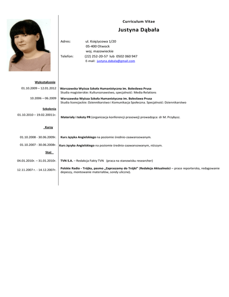 Curriculum Vitae Justyna Dąbała Adres: Telefon: ul. Księżycowa 1/20 05-400 Otwock woj. mazowieckie (22) 252-20-57 lub 0502 060 947 E-mail: [email protected] Wykształcenie 01.10.2009 – 12.01.2012 10.2006 – 06.2009 Warszawska Wyższa Szkoła Humanistyczna im. Bolesława Prusa Studia magisterskie: Kulturoznawstwo, specjalność: Media Relations Warszawska Wyższa Szkoła Humanistyczna im. Bolesława Prusa Studia licencjackie: Dziennikarstwo i Komunikacja Społeczna. Specjalność: Dziennikarstwo Szkolenia 01.10.2010 – 19.02.20011r. Materiały i teksty PR (organizacja konferencji prasowej) prowadząca: dr M. Przybysz. Kursy 01.10.2008 - 30.06.2009r. Kurs Języka Angielskiego na poziomie średnio-zaawansowanym. 01.10.2007 - 30.06.2008r. Kurs Języka Angielskiego na poziomie średnio-zaawansowanym, niższym. Staż 04.01.2010r. – 31.01.2010r. TVN S.A. – Redakcja Fakty TVN (praca na stanowisku researcher) 12.11.2007 r. - 14.12.2007r. Polskie Radio - Trójka, pasmo „Zapraszamy do Trójki” (Redakcja Aktualności – prace reporterska, redagowanie depeszy, montowanie materiałów, sondy uliczne). Praca 01.12.2014r. – 28.02.2015r. Instytut Monitorowania Mediów Al. Jerozolimskie 53, 00-697 Warszawa Dział analiz mediów, analizy ilościowe, jakościowe praca nad raportem Kompas Social Media „Polski Standard Płatności. 15.10. 2014r. – 30.11.2014r. Doradztwo Komunikacyjne Paweł Rabantek ul. Kościuszkowców 63, 04-545 Warszawa Prowadzenie projektów na rzecz klientów agencji (zakłady bukmacherskie, firma deweloperska oraz kompanie piwowarskie), wsparcie zespołu w pracy na rzecz projektów, bieżący kontakt z dziennikarzami, tworzenie bazy danych dziennikarzy, tworzenie materiałów prasowych i artykułów sponsorowanych, komunikacja wenętrzna, budowanie bazy i monitorowanie mediów. 11.04. 2014 – 31.10.2014r. Pracownia Szumu Agencja Public Relations i Reklamowa ul. Dobra 8/10 lok.37, Warszawa Prowadzenie projektów na rzecz klientów agencji, wsparcie zespołu w pracy na rzecz projektów, bieżący kontakt z dziennikarzami, tworzenie bazy danych dziennikarzy, tworzenie materiałów prasowych i artykułów sponsorowanych, organizacja konferencji prasowych, briefingów i eventów medialnych, monitoring mediów, tworzenie ofert dla nowych klientów firmy. Jestem autorką i organizatorką cyklicznego projektu „ROWERÓWKA w Bańce Mydlanej, czyli wszystko, co chcielibyście wiedzieć o rowerze a boicie się zapytać”. http://cjg.gazeta.pl/otworzmiasto/1,138247,16338614,Rowerowka.html https://www.facebook.com/events/663283883739687/ 22.10.2012 – 21.12.2012r. Kino Praha, ul. Jagiellońska 26, Warszawa Specjalista ds. promocji lokalnej (budowanie bazy danych lokalnych mediów oraz prowadzenie strony internetowej) www.kinopraha.pl 14.05.2012- 21.12.2012r. Fundacja Filmowa Warszawa, Studyjne Kino Alchemia, ul. Jeziucka 4, Warszawa Działania z zakresu PR(prowadzenie strony internetowej, strony profilowej na Facebooku, tworzenie newslettera kontakt z mediami) oraz układanie przeglądów filmowych (zorganizowałam Przegląd Kina Młodych Twórców, Kino Alchemia) https://www.facebook.com/KinoAlchemiaEtnokino?ref=hl Akademickie Radio KAMPUS 97, 1fm - Redakcja Kultury, http://radiokampus.waw.pl/ Wolontariat 31.05.2011r. – 30.06.2014r. Stanowisko: reporter. Zajmuje się publicystyką kulturalną. Do moich zadań należy m.in.: szukanie tematów (specjalizuje się w tematyce filmowej), przygotowywanie materiałów (przeprowadzanie wywiadów, sond ulicznych, montowanie, pisanie podprowadzeń oraz przygotowywanie zwiastunów i relacji z wydarzeń kulturalnych). Pracuję na programie Adobe Audition, do nagrywania używam Zoom-a. Stale przygotowuję dźwięki do programów: „Mixer Kulturalny” oraz „Jeszcze Więcej Kultury”, sporadycznie do audycji „Studenteria” i „Kronika Wypadków Filmowych” oraz „Kulturalny Kampus”. Od 31 marca 2012 roku na antenie „Akademickiego Radia Kampus 97, 1fm” pojawia się mój autorski cykl „Młodzi Filmowcy na 97, 1fm” (reżyseria, scenariusz, montaż, promocja). Więcej informacji znajduje się na stronie: https://www.facebook.com/MlodziFilmowcy Stanowisko: prowadząca - audycję Więcej Kultury. Pierwsza sobota miesiąca, program o najciekawszych premierach filmowych, profil audycji filmowo – psychologiczny. Zadania: tworzenie scenariusza audycji, układanie pytań, zapraszanie gości, przeprowadzanie wywiadów, nagrywanie i montowanie dźwięków, promowanie programu w mediach internetowych, prowadzenie fanpage’a Więcej Kultury https://www.facebook.com/WiecejKulturyKampus Języki obce Znajomość programów Zainteresowania angielski (poziom średnio-zaawansowany) i rosyjski (podstawy) Microsoft Office: Word, Power Point, Power Producer ;InDesign, Movie Marker, Dalet Plus, Firefox, Final Cut, Anamorphic, Adobe Audition, Sound Cloud. Film (interesuje mnie twórczość Woody’ego Allena, któremu poświeciłam pracę magisterską „Nowy Jork – obraz miasta w filach Woody’ego Allena” oraz polskie produkcje, młodych twórców filmowych), literatura współczesna (tzw. literatura kobieca, moje ulubione autorki to m.in. Candace Bushnell, Lauren Weisberger), literatura faktu (reportaże Ryszarda Kapuścińskiego, o którym napisałam pracę licencjacką), moda (interesuje się biografiami osób ze światy mody, zwłaszcza Anny Wintour – redaktor naczelna Vogue’a oraz Jeanne Beker – reporterka, felietonistka, dziennikarka Fashion TV), sztuka współczesna (Zuzanna Janin), public relations. „Wyrażam zgodę na przetwarzanie moich danych osobowych dla potrzeb niezbędnych do realizacji procesu rekrutacji zgodnie z Ustawą z dn. 29.08.97 r. o Ochronie Danych Osobowych Dz. Ustaw nr. 133 poz. 883.”