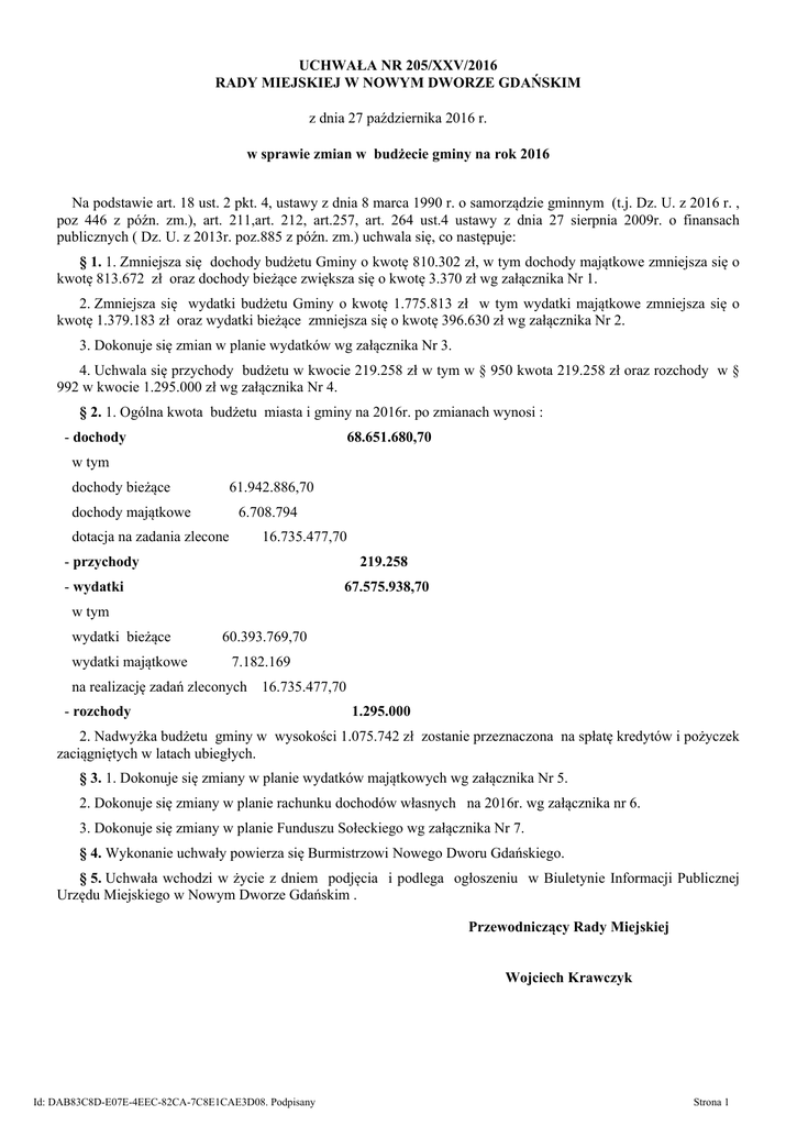 UCHWAŁA NR 205/XXV/2016 RADY MIEJSKIEJ W NOWYM DWORZE GDAŃSKIM z dnia 27 października 2016 r. w sprawie zmian w budżecie gminy na rok 2016 Na podstawie art. 18 ust. 2 pkt. 4, ustawy z dnia 8 marca 1990 r. o samorządzie gminnym (t.j. Dz. U. z 2016 r. , poz 446 z późn. zm.), art. 211,art. 212, art.257, art. 264 ust.4 ustawy z dnia 27 sierpnia 2009r. o finansach publicznych ( Dz. U. z 2013r. poz.885 z późn. zm.) uchwala się, co następuje: § 1. 1. Zmniejsza się dochody budżetu Gminy o kwotę 810.302 zł, w tym dochody majątkowe zmniejsza się o kwotę 813.672 zł oraz dochody bieżące zwiększa się o kwotę 3.370 zł wg załącznika Nr 1. 2. Zmniejsza się wydatki budżetu Gminy o kwotę 1.775.813 zł w tym wydatki majątkowe zmniejsza się o kwotę 1.379.183 zł oraz wydatki bieżące zmniejsza się o kwotę 396.630 zł wg załącznika Nr 2. 3. Dokonuje się zmian w planie wydatków wg załącznika Nr 3. 4. Uchwala się przychody budżetu w kwocie 219.258 zł w tym w § 950 kwota 219.258 zł oraz rozchody w § 992 w kwocie 1.295.000 zł wg załącznika Nr 4. § 2. 1. Ogólna kwota budżetu miasta i gminy na 2016r. po zmianach wynosi : - dochody 68.651.680,70 w tym dochody bieżące 61.942.886,70 dochody majątkowe 6.708.794 dotacja na zadania zlecone 16.735.477,70 - przychody 219.258 - wydatki 67.575.938,70 w tym wydatki bieżące wydatki majątkowe 60.393.769,70 7.182.169 na realizację zadań zleconych 16.735.477,70 - rozchody 1.295.000 2. Nadwyżka budżetu gminy w wysokości 1.075.742 zł zostanie przeznaczona na spłatę kredytów i pożyczek zaciągniętych w latach ubiegłych. § 3. 1. Dokonuje się zmiany w planie wydatków majątkowych wg załącznika Nr 5. 2. Dokonuje się zmiany w planie rachunku dochodów własnych na 2016r. wg załącznika nr 6. 3. Dokonuje się zmiany w planie Funduszu Sołeckiego wg załącznika Nr 7. § 4. Wykonanie uchwały powierza się Burmistrzowi Nowego Dworu Gdańskiego. § 5. Uchwała wchodzi w życie z dniem podjęcia i podlega ogłoszeniu w Biuletynie Informacji Publicznej Urzędu Miejskiego w Nowym Dworze Gdańskim . Przewodniczący Rady Miejskiej Wojciech Krawczyk Id: DAB83C8D-E07E-4EEC-82CA-7C8E1CAE3D08. Podpisany Strona 1 Id: DAB83C8D-E07E-4EEC-82CA-7C8E1CAE3D08. Podpisany Strona 2 Uzasadnienie 1.Dokonuje się następujących zwiększeń i zmniejszeń planu dochodów i wydatków: a)dochody -zmniejszenie z tytułu dotacji z PUW z przeznaczeniem na budowę ulic Dworcowa –Dąbrowskiego o kwotę 143.672 zł , -zmniejszenie z tytułu pomocy z Gminy Nowy Staw o kwotę 670.000 zł -zwiększenie z tytułu darowizny na działalność kulturalną w kwocie 3.370 zł b)wydatki - zmniejszenie z tytułu pomocy dla Gminy Nowy Staw o kwotę 670.000 zł - zmniejszenie z tytułu wydatków na budowę ulic Dworcowa Dąbrowskiego kwota 1.109.183 zł -zwiększenie z tytułu darowizny na działalność kulturalną w kwocie 3.370 zł 2.Dokonuje się przeniesienia następujących wydatków: a)z wydatków bieżących na majątkowe w Gimnazjum z Oddziałami Dwujęzycznymi kwota 8.000 zł na zakup pompy centralnego ogrzewania, b)z wydatków bieżących w dziale 801 (Szkoła podstawowa) do działu 854 (Edukacyjna opieka wychowawcza) dotyczy Zespołu Szkolno-Przedszkolnego w Marzęcinie kwota 14.500 zł, c)usuwa się zadanie Budowa chodnika w Rakowym Polu w dziale 600 i przesuwa się środki do działu 700 na doposażenie placu zabaw w Sołectwie Różewo -kwota 4.000 zł d)usuwa się zadanie „wykonanie projektu zbiornika bezodpływowego w Marzęcinie” kwota 5.000 zł i przesuwa się na zadanie „Budowa drogi do gruntów rolnych- droga w Solnicy wzdłuż rzeki Izbowa Łacha” e)usuwa się zadanie „Budowa chodnika Rakowe Pole” kwota 15.000 zł, f)zmniejsza się wydatki na zadaniu „ Modernizacja targowiska nowodworskiego” kwota 39.000 zł, g)zmniejsza się wydatki na zadaniu” Zagospodarowanie cmentarza Marzęcino” kwota 24.000 zł, h)usuwa się zadanie „dokumentacja na przebudowę hali sportowej na gminnych obiektach sportowych przy ul. Warszawskiej „ kwota 35.000 zł i)zwiększa się wydatki na zadaniu „utworzenie miejsc parkingowych ul.3-go Maja –Konopnickiej” kwota 113.000 zł, j)usuwa się zadanie „ zakup i montaż elementów skateparku” kwota 30.000 zł i środki przesuwa się na bieżące utrzymanie dróg lokalnych, k)ze środków na obsługę długu przenosi się kwotę 8.100 na Fundusz Wsparcia Policji. 3.W ramach środków Funduszu Sołeckiego dokonuję się następujących zmian: a)Sołectwo Kępki -nowe zadanie „zakup materiałów potrzebnych do remontu sali świetlicy wiejskiej „ na które przenosi się środki z zadania „ utrzymanie terenów zielonych i rekreacyjnych „ kwota 1.000 zł oraz z zadania „ utrzymanie i funkcjonowanie świetlicy „ kwota 1.300 zł b) Sołectwo Kępki przenosi się z zadania kultura i rekreacja mieszkańców sołectwa na zadanie wypoczynek dzieci i młodzieży kwota 250 zł c) Sołectwo Rakowiska - nowe zadanie „remont dachu oraz pomieszczeń świetlicy wiejskiej „ na które przenosi się środki z zadania „ kultura i rekreacja dla mieszkańców sołectwa Rakowiska” kwota 321 zł oraz z zadania „ utrzymanie i doposażenie świetlicy, boiska oraz palcu zabaw” kwota 3.070 zł 4.Dokonuje się zmniejszenia kwoty przychodów o 965.511zł. 5.Dokonuje się zmiany w planie rachunku dochodów własnych. Id: DAB83C8D-E07E-4EEC-82CA-7C8E1CAE3D08. Podpisany Strona 1