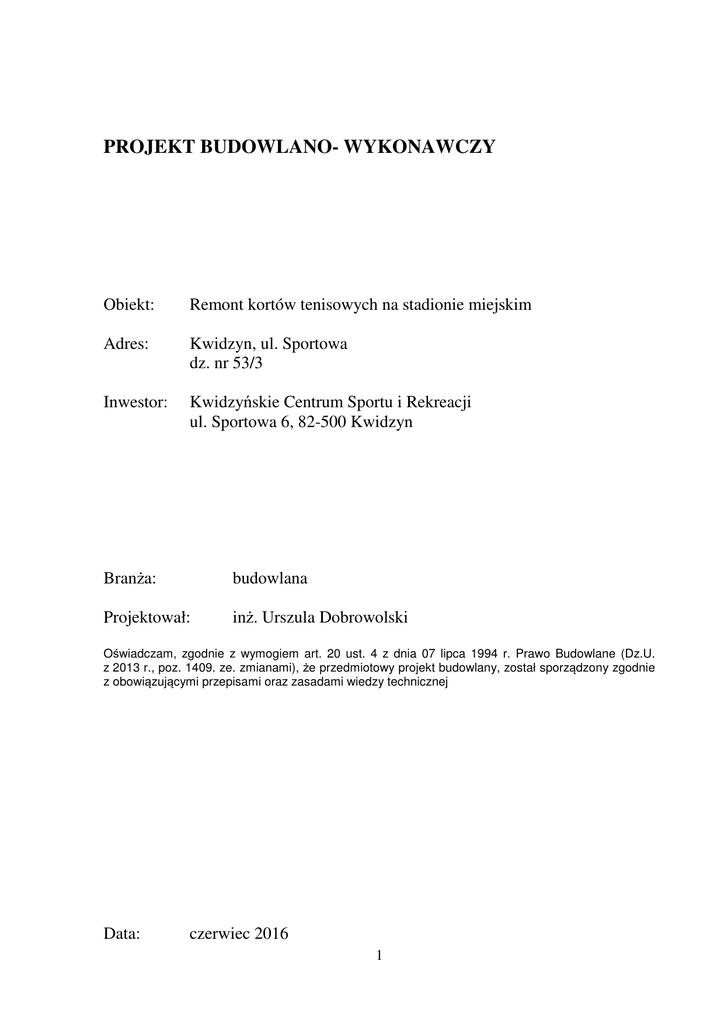 PROJEKT BUDOWLANO- WYKONAWCZY Obiekt: Remont kortów tenisowych na stadionie miejskim Adres: Kwidzyn, ul. Sportowa dz. nr 53/3 Inwestor: Kwidzyńskie Centrum Sportu i Rekreacji ul. Sportowa 6, 82-500 Kwidzyn Branża: budowlana Projektował: inż. Urszula Dobrowolski Oświadczam, zgodnie z wymogiem art. 20 ust. 4 z dnia 07 lipca 1994 r. Prawo Budowlane (Dz.U. z 2013 r., poz. 1409. ze. zmianami), że przedmiotowy projekt budowlany, został sporządzony zgodnie z obowiązującymi przepisami oraz zasadami wiedzy technicznej Data: czerwiec 2016 1 CZĘŚĆ OPISOWA Remontu kortów tenisowych na stadionie miejskim w Kwidzynie, ul. Sportowa dz. nr 53/3 1. Przedmiot inwestycji Przedmiot inwestycji obejmuje remont dwóch boisk o łącznych wymiarach 35,9 x 36,6 m polegający na wymianie nawierzchni boisk: - remont istniejącej nawierzchni podkładowej, - ułożenie sztucznej trawy jako nawierzchni docelowej na wyremontowanym podkładzie. 2. Podstawy formalnoprawne opracowania 2.1 Umowa z inwestorem 2.2 Mapa sytuacyjno-wysokościowa w skali 1:500 2.3 Ustawa Prawo budowlane 2.4 Rozporządzenie Ministra Infrastruktury w sprawie warunków technicznych jakim powinny odpowiadać bdynki i ich usytuowanie 2.5 Rozporządzenie Ministra Infrastruktury w sprawie informacji dotyczących bezpieczeństwa i ochrony zdrrowia 2.6 Ustawa Prawo ochrony środowiska 2.7 Ustawa o odpadach 3. Istniejący stan zagospodarowania terenu 3.1 Stan prawny - zgodnie z wypisem z ewidencji gruntów i budynków właścicielem działek objętych opracowaniem jest Gmina Miejska Kwidzyn. 3.2 Lokalizacja - teren położony przy ul. Sportowej. 3.3 Zabudowa i elementy małej architektury - w granicach opracowania nie występują obiekty KCSiR, drogi i inne elementy niezbędne do funkcjonowania obiektu sportowego. 3.4 Uzbrojenie terenu - nie koliduje z opracowaniem. 3.5 Układ komunikacyjny - istniejący. 3.6 Ukształtowanie terenu i zieleń - teren zagospodarowany, w ganicach opracowania występuje zorganizowana zieleń, która nie koliduje z planowanym zamierzeniem inwestycyjnym. 3.7 Przewidywane zmiaany w zagospodarowaniu terenu - w związku z planowaną inwestycją nie przewiduje się zmian w zagospodarowaniu terenu. 2 4. Projektowane roboty budowlane 4.1 Roboty rozbiórkowe Roboty rozbiórkowe obejmuują czynności umożliwiające i mające na celu wykonanie rozbiórek występujących na terenie obiektu tj. - zerwanie istniejącej nawierzchni, - wywóz i utylizacja. 4.2 Wyrównanie nawierzchni kortów tenisowych Zakres prac dotyczy robót związanych z uzupełnieniem ubytków i nierówności, wyprofilowaniem kortów tenisowych i obejmują: - wyrównanie nierówności podłoża, - sprawdzenie punktów wysokościowych, - w przypadku ubytków podbudowy uzupełnienie grysem kamiennym granulacja do 5 mm, 4.3 Montaż nawierzchni Podłoże, na którym ma być układana nawierzchnia powinno być przygotowane zgodnie z instrukcją producenta, być suche, pozbawione zanieczyszczeń, mocne i stabilne. Odchyłki mierzone łatą dwumetrową ± 2 mm. Zakres robbót związanych z wykonaniem nawierzchni kortów z trawy sztucznej obejmuje: - dostarczenie materiału i sprzętu, - sprawdzenie równości podłoża, - sprawdzenie spadków nawierzchni przed montażem, - sprawdzenie zgodności dostarczonej sztucznej trawy z zamówieniem, - ułożenie nawierzchni. 4.4 Opis nawierzchni Nawierzchnia syntetyczna - wykładzina typu - trawa syntetyczna przeznaczona do wykonywania nawierzchni na otwartej przestrzeni obiektów sportowych, odporna na mróz i wysokie temperatury, zasypana piaskiem kwarcowym, stosowana bez dodatkowych mat syntetycznych. Traw musi posiadać certyfikat ITF. Zastosowanie: tenis, multisport inne. 4.5 Parametry trawy syntetycznej - musi zapewniać stałe i trwałe utrzymanie ównoości nawierzchni w okresie eksploatacji, - musi być mocna i odporna na wyrwanie, - musi być bezpieczna dla zdrowia i życia osób z niej korzystających. Posiadać atest higieniczny wydany przez Państwowy Zakład Higieny lub inny równoważny organ. - musi posiadać certyfikat lub deklarację zgodności z aktualną normą PNEN15330-1 lub aprobatę techniczną, lub rekomendację techniczną potwierdzającą poniższe parametry minimalne: - materiał polietylen, - dtex 7300włókno fibrylowane kręcone, - wysokość włókna 10 mm, 3 - waga całkowita 2 284 mg/m2, - ilość włókien 126 tyś/m2. - wypełnienie piasek kwarcowy o granulacji 0,2 ÷ 0,8 mm ( grub. warstwy do 0,3 cm), - kolor nawierzchni - ceglasty dla nawierzchni kortów. 4.6 Przygotowanie materiału nawierzchniowego do układania Zgodnie z warunkami określonymi w instrukcji wykonania nawierzchni opracowanej przez producenta. 4 Projekt planu zagospodarowania skala 1:500 Remont kortów tenisowych na stadionie miejskim w Kwidzynie działka nr 53/3 przy ul. Sportowej 6 Inwestor: Kwidzyńskie Centrum Sportu i Rekreacji - zakres objęty opracowaniem - kolor czerwony wymiana kortów wykonała: inż. Urszula Dobrowolska 5
