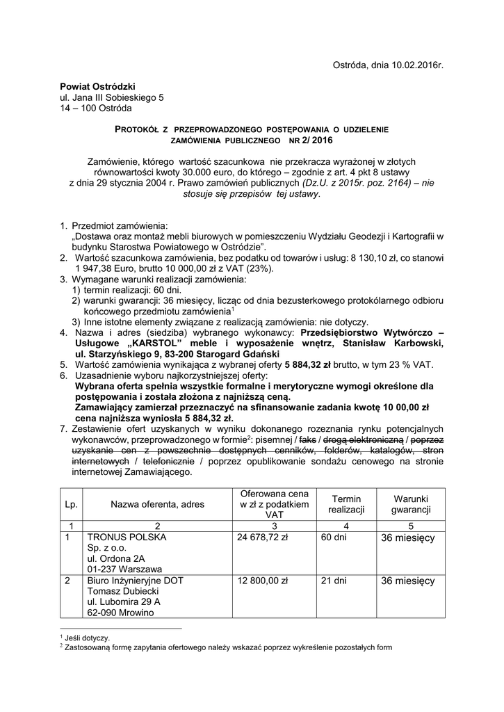 Ostróda, dnia 10.02.2016r. Powiat Ostródzki ul. Jana III Sobieskiego 5 14 – 100 Ostróda PROTOKÓŁ Z PRZEPROWADZONEGO POSTĘPOWANIA O UDZIELENIE ZAMÓWIENIA PUBLICZNEGO NR 2/ 2016 Zamówienie, którego wartość szacunkowa nie przekracza wyrażonej w złotych równowartości kwoty 30.000 euro, do którego – zgodnie z art. 4 pkt 8 ustawy z dnia 29 stycznia 2004 r. Prawo zamówień publicznych (Dz.U. z 2015r. poz. 2164) – nie stosuje się przepisów tej ustawy. 1. Przedmiot zamówienia: „Dostawa oraz montaż mebli biurowych w pomieszczeniu Wydziału Geodezji i Kartografii w budynku Starostwa Powiatowego w Ostródzie”. 2. Wartość szacunkowa zamówienia, bez podatku od towarów i usług: 8 130,10 zł, co stanowi 1 947,38 Euro, brutto 10 000,00 zł z VAT (23%). 3. Wymagane warunki realizacji zamówienia: 1) termin realizacji: 60 dni. 2) warunki gwarancji: 36 miesięcy, licząc od dnia bezusterkowego protokólarnego odbioru końcowego przedmiotu zamówienia1 3) Inne istotne elementy związane z realizacją zamówienia: nie dotyczy. 4. Nazwa i adres (siedziba) wybranego wykonawcy: Przedsiębiorstwo Wytwórczo – Usługowe „KARSTOL” meble i wyposażenie wnętrz, Stanisław Karbowski, ul. Starzyńskiego 9, 83-200 Starogard Gdański 5. Wartość zamówienia wynikająca z wybranej oferty 5 884,32 zł brutto, w tym 23 % VAT. 6. Uzasadnienie wyboru najkorzystniejszej oferty: Wybrana oferta spełnia wszystkie formalne i merytoryczne wymogi określone dla postępowania i została złożona z najniższą ceną. Zamawiający zamierzał przeznaczyć na sfinansowanie zadania kwotę 10 00,00 zł cena najniższa wyniosła 5 884,32 zł. 7. Zestawienie ofert uzyskanych w wyniku dokonanego rozeznania rynku potencjalnych wykonawców, przeprowadzonego w formie2: pisemnej / faks / drogą elektroniczną / poprzez uzyskanie cen z powszechnie dostępnych cenników, folderów, katalogów, stron internetowych / telefonicznie / poprzez opublikowanie sondażu cenowego na stronie internetowej Zamawiającego. Lp. 1 1 2 1 2 Nazwa oferenta, adres 2 TRONUS POLSKA Sp. z o.o. ul. Ordona 2A 01-237 Warszawa Biuro Inżynieryjne DOT Tomasz Dubiecki ul. Lubomira 29 A 62-090 Mrowino Oferowana cena w zł z podatkiem VAT 3 24 678,72 zł 4 60 dni 36 miesięcy 12 800,00 zł 21 dni 36 miesięcy Termin realizacji Warunki gwarancji 5 Jeśli dotyczy. Zastosowaną formę zapytania ofertowego należy wskazać poprzez wykreślenie pozostałych form 3 SEPAR - MEBLE Arkadiusz Piechowski ul. Partyzantów 32 10-401 Olsztyn 7 360,00 zł 30 dni 36 miesięcy 4 MEBELUX - MEBLOMIX S.C. Michał Kierszk Jarosław Zakrzewski ul. Zakładowa 18 89-600 Chojnice 11 200,00 zł 30 dni 36 miesięcy 5 „DRZEWIARZ – BIS” Sp. z o.o. ul. Kardynała Wyszyńskiego 46a 87-600 Lipno 6 691,20 zł 14 dni 36 miesięcy 6 Przedsiębiorstwo WytwórczoUsługowe „KARSTOL” meble i wyposażenie wnętrz Stanisław Karbowski ul. Starzyńskiego 9 83-200 Starogard Gdański 5 884,32 zł 30 dni 36 miesięcy 7 „EMIL” Jacek Śliwiński ul. Jaracza 4 B 14-100 Ostróda 13 744,00 zł 60 dni 36 miesięcy 8 DORMAR Dorota Pinczewska Strzelce Dolne 48 86-022 Dobrcz 8 068,80 zł 14 dni 36 miesięcy 9 Zakład Produkcji Mebli MEBLEX Grzegorz Obuchowicz ul. Barczewskiego 18 11-001 Dywity 8 659,20 zł 30 dni 36 miesięcy 10 KALL – CARRION TRADING Sp. Z o.o. Sp. k. Al. Solidarności 75/26 00-090 Warszawa 9 840,00 zł 60 dni 36 miesięcy 11 KOMA R. Kozakiewicz Spółka Jawna ul. Chorzowska 3 lok. 3 26-600 Radom 8 944,00 zł 30 dni 36 miesięcy 12 P.H.U. LU.TECH PROJEKT Jacek Łukaszuk ul. I. Paderewskiego 10 15-349 Białystok 11 600,18 zł 30 dni 36 miesięcy 13 Meble Borkowski Dominik ul. Armii Krajowej 15 11-300 Biskupiec 12 201,60 zł 45 dni 36 miesięcy 14 PUPH „STANEX” S.C. Stanisław Rzeszot, Ewa Rzeszot ul. Jana Pawła II 11 11-001 Dywity 13 088,00 zł 60 dni 36 miesięcy 15 P.P.H.U. „RamGa” Marcin Nozderka ul. Leśna 11/24 07-320 Małkinia Górna 12 800,00 zł 30 dni 36 miesięcy 16 NIKODEMUS Sebastian Czuryński ul. Grudzińskiego 18A/18 62-020 Swarzędz 13 161,00 zł 30 dni 36 miesięcy 17 Z.P.U.H. „JAWOR” Zbigniew Świadek Linowiec 22 83-200 Starogard Gdański 13 185,60 zł 30 dni 36 miesięcy 18 Czapla i Spółka s.c. ul. Sokola 6 c 11-041 Olsztyn 8 672,19 zł 14 dni 36 miesięcy 19 DORMATECH A. Sienkiewicz ul. Pieniężnego 8 14-100 Ostróda 15 360,00 zł 30 dni 36 miesięcy 20 P.P.H.U. AS POMORZANKA Andrzej Szarmach ul. Prusa 7 83-220 Skórcz TOBO Datczuk Spółka Jawna Kuriany 104 15-589 Białystok HOUSE SERVICE Przemysław Górski ul. Pana Tadeusza 7/32 10-460 Olsztyn 7 872,00 zł 60 dni 36 miesięcy 12 544,00 zł 60 dni 36 miesięcy 10 455,00 zł 60 dni 36 miesięcy 21 22 Sporządził: Marek Myśliński Zatwierdził: Starosta Andrzej Wiczkowski
