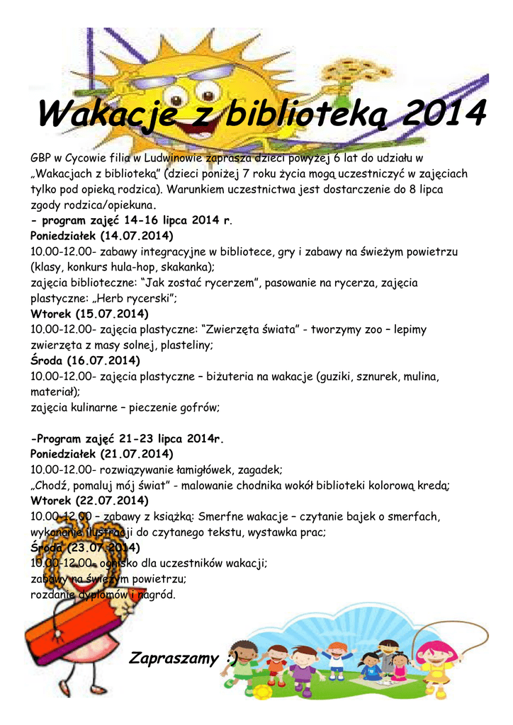 Wakacje z biblioteką 2014 GBP w Cycowie filia w Ludwinowie zaprasza dzieci powyżej 6 lat do udziału w „Wakacjach z biblioteką” (dzieci poniżej 7 roku życia mogą uczestniczyć w zajęciach tylko pod opieką rodzica). Warunkiem uczestnictwa jest dostarczenie do 8 lipca zgody rodzica/opiekuna. - program zajęć 14-16 lipca 2014 r. Poniedziałek (14.07.2014) 10.00-12.00- zabawy integracyjne w bibliotece, gry i zabawy na świeżym powietrzu (klasy, konkurs hula-hop, skakanka); zajęcia biblioteczne: “Jak zostać rycerzem”, pasowanie na rycerza, zajęcia plastyczne: „Herb rycerski”; Wtorek (15.07.2014) 10.00-12.00- zajęcia plastyczne: “Zwierzęta świata” - tworzymy zoo – lepimy zwierzęta z masy solnej, plasteliny; Środa (16.07.2014) 10.00-12.00- zajęcia plastyczne – biżuteria na wakacje (guziki, sznurek, mulina, materiał); zajęcia kulinarne – pieczenie gofrów; -Program zajęć 21-23 lipca 2014r. Poniedziałek (21.07.2014) 10.00-12.00- rozwiązywanie łamigłówek, zagadek; „Chodź, pomaluj mój świat” - malowanie chodnika wokół biblioteki kolorową kredą; Wtorek (22.07.2014) 10.00-12.00 – zabawy z książką: Smerfne wakacje – czytanie bajek o smerfach, wykonanie ilustracji do czytanego tekstu, wystawka prac; Środa (23.07.2014) 10.00-12.00- ognisko dla uczestników wakacji; zabawy na świeżym powietrzu; rozdanie dyplomów i nagród. Zapraszamy :)