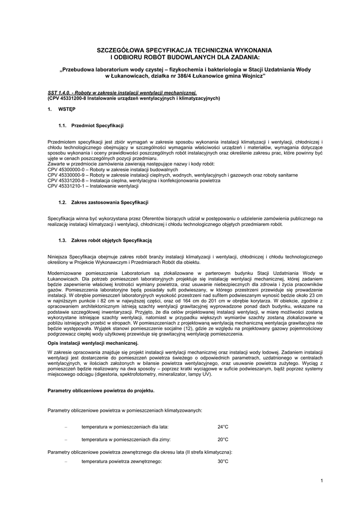 SZCZEGÓŁOWA SPECYFIKACJA TECHNICZNA WYKONANIA I ODBIORU ROBÓT BUDOWLANYCH DLA ZADANIA: „Przebudowa laboratorium wody czystej – fizykochemia i bakteriologia w Stacji Uzdatniania Wody w Łukanowicach, działka nr 386/4 Łukanowice gmina Wojnicz” SST 1.4.0. - Roboty w zakresie instalacji wentylacji mechanicznej. (CPV 45331200-8 Instalowanie urządzeń wentylacyjnych i klimatyzacyjnych) 1. WSTĘP 1.1. Przedmiot Specyfikacji Przedmiotem specyfikacji jest zbiór wymagań w zakresie sposobu wykonania instalacji klimatyzacji i wentylacji, chłodniczej i chłodu technologicznego obejmujący w szczególności wymagania właściwości urządzeń i materiałów, wymagania dotyczące sposobu wykonania i oceny prawidłowości poszczególnych robót instalacyjnych oraz określenie zakresu prac, które powinny być ujęte w cenach poszczególnych pozycji przedmiaru. Zawarte w przedmiocie zamówienia zawierają następujące nazwy i kody robót: CPV 45300000-0 – Roboty w zakresie instalacji budowalnych CPV 45330000-9 – Roboty w zakresie instalacji cieplnych, wodnych, wentylacyjnych i gazowych oraz roboty sanitarne CPV 45331200-8 – Instalacja cieplna, wentylacyjna i konfekcjonowania powietrza CPV 45331210-1 – Instalowanie wentylacji 1.2. Zakres zastosowania Specyfikacji Specyfikacja winna być wykorzystana przez Oferentów biorących udział w postępowaniu o udzielenie zamówienia publicznego na realizację instalacji klimatyzacji i wentylacji, chłodniczej i chłodu technologicznego objętych przedmiarem robót. 1.3. Zakres robót objętych Specyfikacją Niniejsza Specyfikacja obejmuje zakres robót branży instalacji klimatyzacji i wentylacji, chłodniczej i chłodu technologicznego określony w Projekcie Wykonawczym i Przedmiarach Robót dla obiektu. Modernizowane pomieszczenia Laboratorium są zlokalizowane w parterowym budynku Stacji Uzdatniania Wody w Łukanowicach. Dla potrzeb pomieszczeń laboratoryjnych projektuje się instalację wentylacji mechanicznej, której zadaniem będzie zapewnienie właściwej krotności wymiany powietrza, oraz usuwanie niebezpiecznych dla zdrowia i życia pracowników gazów. Pomieszczenia laboratoryjne będą posiadały sufit podwieszany, w którego przestrzeni przewiduje się prowadzenie instalacji. W obrębie pomieszczeń laboratoryjnych wysokość przestrzeni nad sufitem podwieszanym wynosić będzie około 23 cm w najniższym punkcie i 82 cm w najwyższej części, oraz od 164 cm do 201 cm w obrębie korytarza. W obiekcie, zgodnie z opracowaniem architektonicznym istnieją szachty wentylacji grawitacyjnej wyprowadzone ponad dach budynku, wskazane na podstawie szczegółowej inwentaryzacji. Przyjęto, że dla celów projektowanej instalacji wentylacji, w miarę możliwości zostaną wykorzystane istniejące szachty wentylacji, natomiast w przypadku większych wymiarów szachty zostaną zlokalizowane w pobliżu istniejących przebić w stropach. W pomieszczeniach z projektowaną wentylacją mechaniczną wentylacja grawitacyjna nie będzie występowała. Wyjątek stanowi pomieszczenie socjalne (12), gdzie ze względu na projektowany gazowy pojemnościowy podgrzewacz ciepłej wody użytkowej przewiduje się grawitacyjną wentylację pomieszczenia. Opis instalacji wentylacji mechanicznej. W zakresie opracowania znajduje się projekt instalacji wentylacji mechanicznej oraz instalacji wody lodowej. Zadaniem instalacji wentylacji jest dostarczenie do pomieszczeń powietrza świeżego o odpowiednich parametrach, uzdatnionego w centralach wentylacyjnych, w ilościach założonych w bilansie powietrza wentylacyjnego, oraz usuwanie powietrza zużytego. Wyciąg z pomieszczeń będzie realizowany na dwa sposoby – poprzez kratki wyciągowe w suficie podwieszanym, bądź poprzez systemy miejscowego odciągu (digestoria, spektrofotometry, mineralizator, lampy UV). Parametry obliczeniowe powietrza do projektu. Parametry obliczeniowe powietrza w pomieszczeniach klimatyzowanych: – temperatura w pomieszczeniach dla lata: 24°C – temperatura w pomieszczeniach dla zimy: 20°C Parametry obliczeniowe powietrza zewnętrznego dla okresu lata (II strefa klimatyczna): – temperatura powietrza zewnętrznego: 30°C 1 – wilgotność powietrza zewnętrznego: 50% Parametry obliczeniowe powietrza zewnętrznego dla okresu zimy (III strefa klimatyczna): – temperatura powietrza zewnętrznego: -20°C – wilgotność powietrza zewnętrznego: 100% Parametry wody lodowej do zasilania chłodnic central wentylacyjnych: – temperatura zasilania/powrotu na instalacji: 7°C/12°C Ogólne założenia dla projektowanych systemów. Pomieszczenia przeznaczone do mechanicznej obróbki powietrza zostały podzielone na dwie grupy. Pierwszą grupę stanowią pomieszczenia, w których nie projektuje się urządzeń do miejscowego odciągu powietrza, za wyjątkiem odciągów znad lamp UV i okapu, ze względu na niedużą ilość powietrza wyciąganego. W pomieszczeniach tych z założenia nie będą powstawały niebezpieczne zanieczyszczenia, stąd system ten, określany w dalszej części opracowania jako wentylacja mechaniczna nawiewno – wywiewna, ma zapewnić niezbędną krotność wymiany powietrza przez dostarczenie uzdatnionego powietrza świeżego. Celem zapewnienia właściwej krotności wymiany powietrza w pomieszczeniach wentylowanych przewidziano układ grzewczo – chłodzący uzdatniania powietrza. Dodatkowo zakłada się odzysk ciepła i chłodu. Uzdatnianie powietrza będzie się odbywało w centrali wentylacyjnej nawiewno – wywiewnej w przestrzeni nad stropem podwieszanym korytarza. Pomieszczenia obsługiwane przez system wentylacji nawiewno – wywiewnej, oznaczony N1-W1: – – – – – – – – – – – – 03 – Pokój kierownika; 04 – Przyjmowanie próbek; 05 – Laboratorium biologiczne; 05-A – Boks szczepień; 05-B – Pomieszczenie z autoklawem; 05-C – Śluza; 05-D – Pożywkarnia; 05-E – Myjnia; 05-F – Pomieszczenie z autoklawem; 10 – Ko