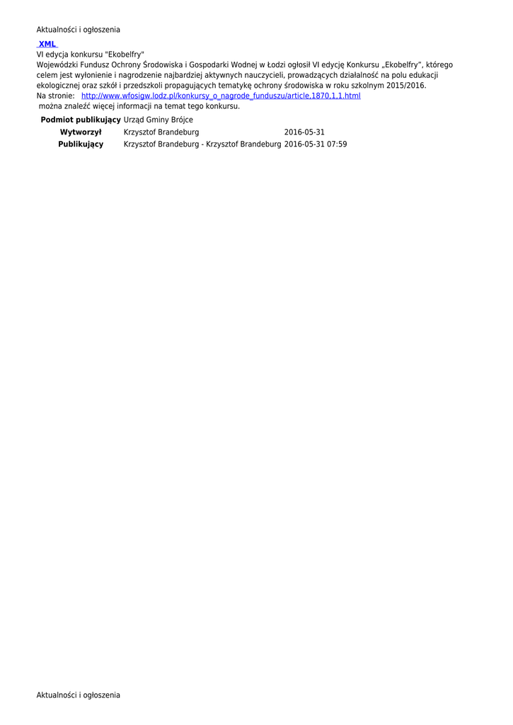 Aktualności i ogłoszenia XML VI edycja konkursu "Ekobelfry" Wojewódzki Fundusz Ochrony Środowiska i Gospodarki Wodnej w Łodzi ogłosił VI edycję Konkursu „Ekobelfry”, którego celem jest wyłonienie i nagrodzenie najbardziej aktywnych nauczycieli, prowadzących działalność na polu edukacji ekologicznej oraz szkół i przedszkoli propagujących tematykę ochrony środowiska w roku szkolnym 2015/2016. Na stronie: http://www.wfosigw.lodz.pl/konkursy_o_nagrode_funduszu/article,1870,1,1.html można znaleźć więcej informacji na temat tego konkursu. Podmiot publikujący Urząd Gminy Brójce Wytworzył Krzysztof Brandeburg Publikujący Krzysztof Brandeburg - Krzysztof Brandeburg 2016-05-31 07:59 Aktualności i ogłoszenia 2016-05-31