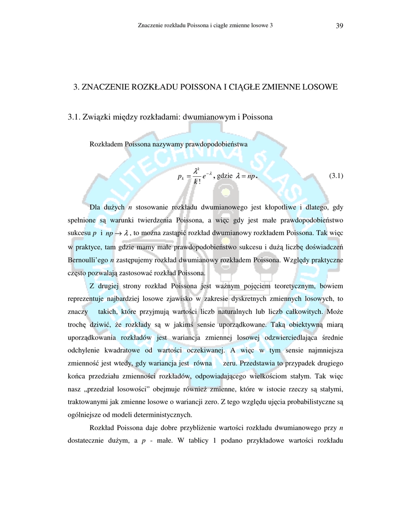 Znaczenie rozkładu Poissona i ciągłe zmienne losowe 3 39 3. ZNACZENIE ROZKŁADU POISSONA I CIĄGŁE ZMIENNE LOSOWE 3.1. Związki między rozkładami: dwumianowym i Poissona Rozkładem Poissona nazywamy prawdopodobieństwa pk = λk k! e − λ , gdzie λ = np . (3.1) Dla dużych n stosowanie rozkładu dwumianowego jest kłopotliwe i dlatego, gdy spełnione są warunki twierdzenia Poissona, a więc gdy jest małe prawdopodobieństwo sukcesu p i np → λ , to można zastąpić rozkład dwumianowy rozkładem Poissona. Tak więc w praktyce, tam gdzie mamy małe prawdopodobieństwo sukcesu i dużą liczbę doświadczeń Bernoulli’ego n zastępujemy rozkład dwumianowy rozkładem Poissona. Względy praktyczne często pozwalają zastosować rozkład Poissona. Z drugiej strony rozkład Poissona jest ważnym pojęciem teoretycznym, bowiem reprezentuje najbardziej losowe zjawisko w zakresie dyskretnych zmiennych losowych, to znaczy takich, które przyjmują wartości liczb naturalnych lub liczb całkowitych. Może trochę dziwić, że rozkłady są w jakimś sensie uporządkowane. Taką obiektywną miarą uporządkowania rozkładów jest wariancja zmiennej losowej odzwierciedlająca średnie odchylenie kwadratowe od wartości oczekiwanej. A więc w tym sensie najmniejsza zmienność jest wtedy, gdy wariancja jest równa zeru. Przedstawia to przypadek drugiego końca przedziału zmienności rozkładów, odpowiadającego wielkościom stałym. Tak więc nasz „przedział losowości” obejmuje również zmienne, które w istocie rzeczy są stałymi, traktowanymi jak zmienne losowe o wariancji zero. Z tego względu ujęcia probabilistyczne są ogólniejsze od modeli deterministycznych. Rozkład Poissona daje dobre przybliżenie wartości rozkładu dwumianowego przy n dostatecznie dużym, a p - małe. W tablicy 1 podano przykładowe wartości rozkładu Znaczenie rozkładu Poissona i ciągłe zmienne losowe 3 40 dwumianowego i rozkładu Poissona, dla k = 0,1,...,11, przy założeniu, że p = 0.02, a n = 100. Tablica 3.1 Rozkład dwumianowy k n n− k P( X = k ) = p k (1 − p) k Rozkład Poissona P( X = k ) k np) ( = k! 0 0.13262 0.135333 1 0.27065 0.27067 2 0.27342 0.27367 3 0.18228 0.18044 4 0.09021 0.09022 5 0.03535 0.03609 6 0.01142 0.01203 7 0.00313 0.00343 8 0.00073 0.00085 9 0.00015 0.00019 10 0.00003 0.00004 11 0.00001 0.000007 e − np Im p mniejsze, tym lepsze przybliżenie: Rozkład Poissona ≡ Rozkład rzadkich zdarzeń. Przykłady zastosowania rozkładu Poissona, jako przybliżenia rozkładu dwumianowego (Hellwig 1977) Przykład 3.1 Jeżeli wiadomo, że wadliwość żarówek (tzn. przeciętny procent braków) wynosi 2%, w partii liczącej 100 sztuk znajdzie się trzy sztuki złe? W zadaniu tym p = 0.02, n =100, a więc np = 2, k = 3. Należy obliczyć Znaczenie rozkładu Poissona i ciągłe zmienne losowe 3 41 P( X < 4) = P( X = 0) + P( X = 1) + P( X = 2) + P( X = 3) W tablicy rozkładu Poissona podane są wartości k P( X ≤ k ) = ∑ i=0 ( np) i e − np . i! (3.2) Dla np = 2 i k = 3 znajdujemy szukane prawdopodobieństwo 0.857. Przykład 3.2 Wadliwość elementów elektronicznych wynosi 2%. Ile dobrych elementów należy dodać, aby z prawdopodobieństwem nie mniejszym niż 0.95 partia zawierała 100 sztuk dobrych? W zadaniu tym znamy p = 0.02, n = 100, P( X ≤ k ) = 0.95 , np = 2. Szukamy k. W tablicy rozkładu Poissona w wierszu z nagłówkiem 2 szukamy liczby większej od 0.95. Jest to 0.983, która znajduje się w kolumnie z nagłówkiem k = 5. Tak więc należy dodać 5 sztuk dobrych elementów. Przykład 3.3 Wadliwość elementów elektronicznych nie jest znana. Czy można z prawdopodobieństwem większym niż 0.90 twierdzić, że wadliwość jest mniejsza niż 0.02, jeśli w partii liczącej 100 sztuk znaleziono 7 sztuk złych? Przy założeniu, że p = 0.02 mamy P( X > 0) = 0.865 < 0.90 Oznacza to, że gdybyśmy w naszej partii nie znaleźli ani jednego wadliwego elementu, to i tak nie moglibyśmy z prawdopodobieństwem większym niż 0.90 twierdzić, że wadliwość jest mniejsza niż 0.02. Ponieważ w partii znaleziono 7 sztuk złych, a przy wadliwości 0.02 i wielkości partii 100 sztuk prawdopodobieństwo tego, że liczba braków jest większa niż 6 wynosi 0.005, a więc jest to zdarzenie bardzo mało prawdopodobne. Stąd wniosek, że wadliwość jest większa niż 0.02. 42 Znaczenie rozkładu Poissona i ciągłe zmienne losowe 3 3.2. Rozkład geometryczny Rozkładem geometrycznym nazywa się prawdopodobieństwo pierwszego sukcesu po l porażkach w doświadczeniach Bernoulli’ego, na przykład przechodzień, który na ulicy jednokierunkowej po przepuszczeniu l samochodów znajduje wreszcie właściwy odstęp: prawdopodobieństwo nie zaakceptowania odstępu przez przechodnia wynosi q prawdopodobieństwo nie zaakceptowania dwóch odstępów wynosi q 2 prawdopodobieństwo nie zaakceptowania trzech odstępów wynosi q 3 ... prawdopodobieństwo nie zaakceptowania l odstępów wynosi q l prawdopodobieństwo nie zaakceptowania l odstępów i zaakceptowania l + 1 odstępu: p l = pq l , p + q = 1. (3.3) Jest to rozkład geometryczny. Uogólnieniem rozkładu geometrycznego jest rozkład ujemny dwumianowy wyrażający prawdopodobieństwo k - tego sukcesu po l porażkach: l + k − 1 k l pl , k = p q , k −1 (3.4) o następujących charakterystykach E( X ) = m = k (1 − p) , p V( X) = σ 2 = k (1 − p) . p2 (3.5) Znaczenie rozkładu Poissona i ciągłe zmienne losowe 3 43 3.3. Ciągłe zmienne losowe Dotychczasowe pojęcia zmiennych losowych odnosiły się do dyskretnych zmiennych losowych, a więc przyjmujących tylko wartości dyskretne. Nasze potrzeby praktyczne wymagają jednak stosowania również pojęć ciągłych zmiennych losowych. Najprostszym przykładem ciągłej zmiennej losowej jest odstęp czasu między kolejnymi pojazdami obserwowanego potoku ruchu. Dobrą ilustracją odstępów potoku ruchu jest wykres ruchu przedstawiający rozmieszczenie na drodze i w cza