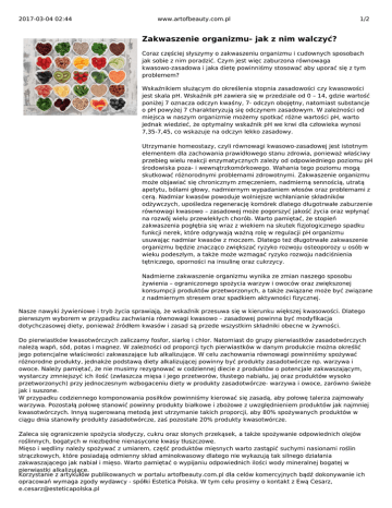 2017-03-04 02:44 www.artofbeauty.com.pl 1/2 Zakwaszenie organizmu- jak z nim walczyć? Coraz częściej słyszymy o zakwaszeniu organizmu i cudownych sposobach jak sobie z nim poradzić. Czym jest więc zaburzona równowaga kwasowo-zasadowa i jaka dietę powinniśmy stosować aby uporać się z tym problemem? Wskaźnikiem służącym do określenia stopnia zasadowości czy kwasowości jest skala pH. Wskaźnik pH zawiera się w przedziale od 0 – 14, gdzie wartość poniżej 7 oznacza odczyn kwaśny, 7- odczyn obojętny, natomiast substancje o pH powyżej 7 charakteryzują się odczynem zasadowym. W zależności od miejsca w naszym organizmie możemy spotkać różne wartości pH, warto jednak wiedzieć, że optymalny wskaźnik pH we krwi dla człowieka wynosi 7,35-7,45, co wskazuje na odczyn lekko zasadowy. Utrzymanie homeostazy, czyli równowagi kwasowo-zasadowej jest istotnym elementem dla zachowania prawidłowego stanu zdrowia, ponieważ właściwy przebieg wielu reakcji enzymatycznych zależy od odpowiedniego poziomu pH środowiska poza- i wewnątrzkomórkowego. Wahania tego poziomu mogą skutkować różnorodnymi problemami zdrowotnymi. Zakwaszenie organizmu może objawiać się chronicznym zmęczeniem, nadmierną sennością, utratą apetytu, bólami głowy, nadmiernym wypadaniem włosów oraz problemami z cerą. Nadmiar kwasów powoduje wolniejsze wchłanianie składników odżywczych, upośledza regenerację komórek dlatego długotrwałe zaburzenie równowagi kwasowo – zasadowej może pogorszyć jakość życia oraz wpłynąć na rozwój wielu przewlekłych chorób. Warto pamiętać, że stopień zakwaszenia pogłębia się wraz z wiekiem na skutek fizjologicznego spadku funkcji nerek, które odgrywają ważną rolę w regulacji pH organizmu usuwając nadmiar kwasów z moczem. Dlatego też długotrwałe zakwaszenie organizmu będzie znacząco zwiększać ryzyko rozwoju osteoporozy u osób w wieku podeszłym, a także może wzmagać ryzyko rozwoju nadciśnienia tętniczego, oporności na insulinę oraz cukrzycy. Nadmierne zakwaszenie organizmu wynika ze zmian naszego sposobu żywienia – ograniczonego spożycia warzyw i owoców oraz zwiększonej konsumpcji produktów przetworzonych, a także związane może być związane z nadmiernym stresem oraz spadkiem aktywności fizycznej. Nasze nawyki żywieniowe i tryb życia sprawiają, że wskaźnik przesuwa się w kierunku większej kwasowości. Dlatego pierwszym wyborem w przypadku zachwiania równowagi kwasowo – zasadowej powinna być modyfikacja dotychczasowej diety, ponieważ źródłem kwasów i zasad są przede wszystkim składniki obecne w żywności. Do pierwiastków kwasotwórczych zaliczamy fosfor, siarkę i chlor. Natomiast do grupy pierwiastków zasadotwórczych należą wapń, sód, potas i magnez. W zależności od proporcji tych pierwiastków w danym produkcie można określić jego potencjalne właściwości zakwaszające lub alkalizujące. W celu zachowania równowagi powinniśmy spożywać różnorodne produkty, jednakże podstawą diety alkalizującej powinny być produkty zasadotwórcze np. warzywa i owoce. Należy pamiętać, że nie musimy rezygnować w codziennej diecie z produktów o potencjale zakwaszającym, wystarczy zmniejszyć ich ilość (zwłaszcza mięsa i jego przetworów, tłustego nabiału, jaj oraz produktów wysoko przetworzonych) przy jednoczesnym wzbogaceniu diety w produkty zasadotwórcze- warzywa i owoce, zarówno świeże jak i suszone. W przypadku codziennego komponowania posiłków powinniśmy kierować się zasadą, aby połowę talerza zajmowały warzywa. Pozostałą połowę stanowić powinny produkty białkowe i zbożowe z uwzględnieniem produktów jak najmniej kwasotwórczych. Innyą sugerowaną metodą jest utrzymanie takich proporcji, aby 80% spożywanych produktów w ciągu dnia stanowiły produkty zasadotwórcze, zaś pozostałe 20% produkty kwasotwórcze. Zaleca się ograniczenie spożycia słodyczy, cukru oraz słonych przekąsek, a także spożywanie odpowiednich olejów roślinnych, bogatych w niezbędne nienasycone kwasy tłuszczowe. Mięso i wędliny należy spożywać z umiarem, część produktów mięsnych warto zastąpić suchymi nasionami roślin strączkowych, które posiadają odmienny skład aminokwasowy dlatego nie wykazują tak silnego działania zakwaszającego jak nabiał i mięso. Warto pamiętać o wypijaniu odpowiednich ilości wody mineralnej bogatej w pierwiastki alkalizujące. Korzystanie z artykułów publikowanych w portalu artofbeauty.com.pl dla celów komercyjnych bądź dokonywanie ich opracowań wymaga zgody wydawcy - spółki Estetica Polska. W tym celu prosimy o kontakt z Ewą Cesarz, [email protected] 2017-03-04 02:44 www.artofbeauty.com.pl 2/2 W diecie odkwaszającej powinny się znaleźć większe ilości sałatek warzywnych i owocowych, część wyrobów mięsnych powinniśmy zastąpić pastami z roślin strączkowych, a także warzywnymi pasztetami. Na podwieczorek lub drugie śniadanie doskonale sprawdzą się różnorodne koktajle warzywno-owocowe. Zamiast soli warto natomiast stosować dodatek ziół i przypraw, które wykazują silne właściwości zasadotwórcze. Trychologiczne Centrum Zdrowych Włosów ul. św. Krzyża 19/8 Kraków www.trychologia.krakow.pl Zapisy na szkolenia dietetyczne i trychologiczne: 669 797 079, 790 499 993 Dla pięciu pierwszych uczestników kursu Dietetyka w trychologii – nagrody! Korzystanie z artykułów publikowanych w portalu artofbeauty.com.pl dla celów komercyjnych bądź dokonywanie ich opracowań wymaga zgody wydawcy - spółki Estetica Polska. W tym celu prosimy o kontakt z Ewą Cesarz, [email protected]