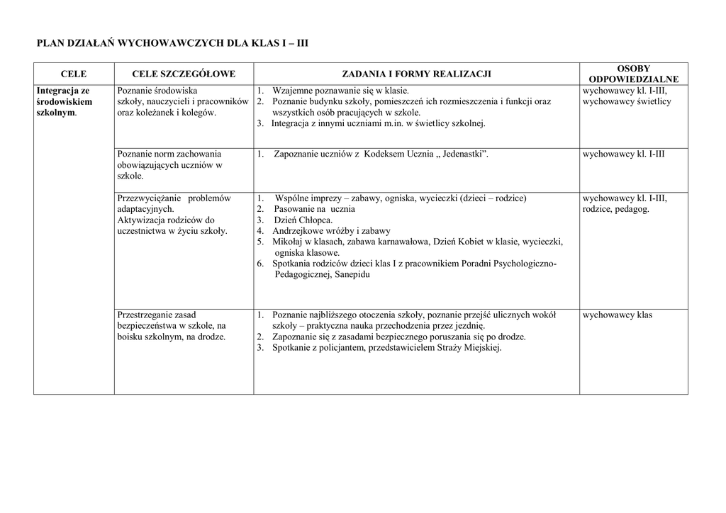 PLAN DZIAŁAŃ WYCHOWAWCZYCH DLA KLAS I – III CELE Integracja ze środowiskiem szkolnym. CELE SZCZEGÓŁOWE ZADANIA I FORMY REALIZACJI Poznanie środowiska 1. Wzajemne poznawanie się w klasie. szkoły, nauczycieli i pracowników 2. Poznanie budynku szkoły, pomieszczeń ich rozmieszczenia i funkcji oraz oraz koleżanek i kolegów. wszystkich osób pracujących w szkole. 3. Integracja z innymi uczniami m.in. w świetlicy szkolnej. Zapoznanie uczniów z Kodeksem Ucznia „ Jedenastki”. OSOBY ODPOWIEDZIALNE wychowawcy kl. I-III, wychowawcy świetlicy Poznanie norm zachowania obowiązujących uczniów w szkole. 1. wychowawcy kl. I-III Przezwyciężanie problemów adaptacyjnych. Aktywizacja rodziców do uczestnictwa w życiu szkoły. 1. Wspólne imprezy – zabawy, ogniska, wycieczki (dzieci – rodzice) 2. Pasowanie na ucznia 3. Dzień Chłopca. 4. Andrzejkowe wróżby i zabawy 5. Mikołaj w klasach, zabawa karnawałowa, Dzień Kobiet w klasie, wycieczki, ogniska klasowe. 6. Spotkania rodziców dzieci klas I z pracownikiem Poradni PsychologicznoPedagogicznej, Sanepidu wychowawcy kl. I-III, rodzice, pedagog. Przestrzeganie zasad bezpieczeństwa w szkole, na boisku szkolnym, na drodze. 1. Poznanie najbliższego otoczenia szkoły, poznanie przejść ulicznych wokół szkoły – praktyczna nauka przechodzenia przez jezdnię. 2. Zapoznanie się z zasadami bezpiecznego poruszania się po drodze. 3. Spotkanie z policjantem, przedstawicielem Straży Miejskiej. wychowawcy klas CELE Wychowanie prozdrowotne CELE SZCZEGÓŁOWE Nabywanie umiejętności dbania o własne zdrowie. 1. 2. 3. Rozwijanie i pogłębianie kultury osobistej ucznia. 4. 5. 6. 1. 2. Wyrabianie nawyków poszanowania drugiego człowieka (kolegów, członków rodziny, osób starszych, niepełnosprawnych). Wychowanie społeczne 1. 2. 3. 4. 5. Rozwijanie samorządności uczniowskiej OSOBY ODPOWIEDZIALNE Zdobywanie przez uczniów niezbędnych wiadomości z zakresu higieny wychowawcy, nauczyciele osobistej i potrzeb własnego organizmu – pogadanki z higienistką szkolną i WF, stomatologiem, pogadanki wewnątrzklasowe. Wystawki książek promujące pracownicy służby zdrowy styl życia, wystawy prac plastycznych o tematyce zdrowotnej, udział w zdrowia, pedagog, konkursach o zasięgu szkolnym, miejskim i ogólnopolskim. bibliotekarz, rodzice Wyrabianie nawyków dbania o organizm obciążony pracą umysłową. Strukturalizacja wolnego czasu ucznia – racjonalne planowanie dnia ucznia. Sposoby zagospodarowania czasu wolnego – wycieczki, rajdy, biwaki, wyjścia do muzeum, teatru, kina, na wystawy. Uświadomienie zagrożeń związanych z uzależnieniami i nałogami. Nauka pływania oraz zajęcia gimnastyki korekcyjnej. Organizacja wyjazdów na „Zieloną Szkołę”. Wdrażanie do przestrzegania kulturalnego zachowania się w klasie, na terenie wychowawcy, szkoły, w czasie przedstawień, koncertów i seansów filmowych, wycieczek nauczyciele, pracownicy klasowych. szkoły, rodzice, Przestrzeganie obowiązku noszenia stroju szkolnego i stroju galowego. - Noszenie w ciągu roku szkolnego stroju uczniowskiego (czerwone lub granatowe sweterki, białe lub szare koszulki polo) i stroju galowego podczas uroczystości szkolnych Wdrażanie do rozwiązywania problemów i konfliktów na drodze porozumienia wychowawcy, rodzice, SU Realizacja programu profilaktycznego „Spójrz inaczej” w klasach I i II Tworzenie wewnętrznych umów klasowych. Wyrabianie nawyków poszanowania przedmiotów i środków wspólnej użyteczności i cudzej własności poprzez dbanie o klasę, korytarz szkolny, otoczenie szkoły. Udział w imprezach klasowych, szkolnych, środowiskowych: - Dzień Chłopca - Dzień Nauczyciela - Andrzejki - Mikołajki - Jasełka i opłatek - Dzień Babci i Dziadka - Dzień Kobiet - Święto Wiosny, Dzień Ziemi - Święto Szkoły (piknik) - Dzień Matki - Dzień Dziecka Wybory do samorządu klasowego Udział w bieżących akcjach charytatywnych. ZADANIA I FORMY REALIZACJI 6. 7. CELE SZCZEGÓŁOWE Wychowanie ekologiczne Kształcenie postaw i nawyków ochrony przyrody i środowiska 1. Budzenie szacunku do przyrody poprzez poznanie składników środowiska naturalnego – pogadanki nauczycieli, akcje, konkursy 2. Akcja Sprzątania Świata . 3. Dzień Ziemi. 4. Zbiórka i segregacja surowców wtórnych 5. Ukwiecenie sal lekcyjnych i korytarzy szkolnych. Konkursy wewnątrzklasowe. 6. Segregowanie odpadów. 7. Uczymy się oszczędzać wodę i światło. 8. Zapoznanie ze źródłami zanieczyszczeń środowiska i sposobami ich przeciwdziałaniu: apele, wystawki, konkursy plastyczne i muzyczne Ugruntowanie poczucia tożsamości narodowej przez rozwój tożsamości regionalnej. 1. Historia i dzień dzisiejszy symboli narodowych – pogadanki. 2. Godne zachowanie się i stosowny strój galowy (granatowe lub czarne spódniczki/spodnie i białe bluzki/koszule) w czasie świąt i uroczystości szkolnych, państwowych i kościelnych: Święto Niepodległości, Rocznica Konstytucji 3 Maja, Dzień Papieski Święto Szkoły 3. Prezentacja sylwetek słynnych Polaków, ukazywanie wzorców patriotycznych, budzenie dumy z osiągnięć narodowych (spotkanie z kombatantami, wycieczki do lokalnych miejsc pamięci narodowych). 4. Wycieczki promujące region, jego historię, sztukę ludową (klasztor oo Kapucynów, zespół pałacowy w Charzewicach, wycieczki do Muzeum Regionalnego, spotkania z twórcami ludowymi). 1. Zapoznanie z patronem szkoły. 2. Przygotowanie i uczestniczenie w imprezach związanych z patronem 3. Uczestnictwo w konkursach, wystawach i apelach związanych z patronem szkoły. 4. Spotkania z kombatantami. 5. Konkurs wiedzy o patronie szkoły 6. Nauka hymnu szkoły. wychowawcy i nauczyciele poszczególnych przedmiotów, rodzice 1. Andrzejkowe wróżby i zabawa klasowa. 2. Jasełka. 3. Walentynki. 4. Pożegnanie zimy, powitanie wiosny. 5. Wielkanocne pisanki i obrzędy. wychowawcy, SU Wychowanie patriotyczne i regionalne Kultywowanie pamię