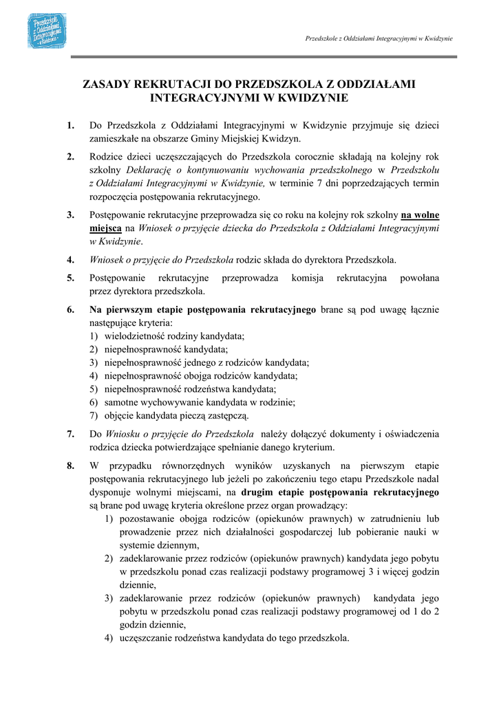zasady rekrutacji do przedszkola z oddziałami integracyjnymi w