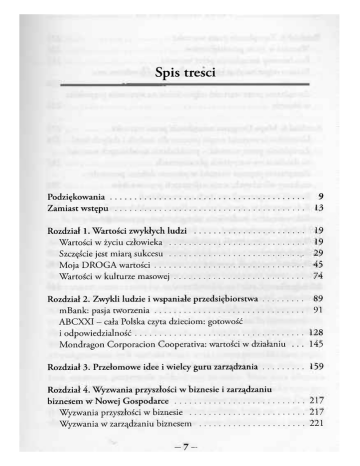 Spis treści Podziękowania Zamiast wstępu 9 13 Rozdział 1. Wartości zwykłych ludzi Wartości w życiu człowieka Szczęście jest miarą sukcesu Moja DROGA wartości Wartości w kulturze masowej 19 19 .. 29 45 74 Rozdział 2. Zwykli ludzie i wspaniałe przedsiębiorstwa 89 mBank: pasja tworzenia 91 ABCXXI - cała Polska czyta dzieciom: gotowość i odpowiedzialność 128 Mondragon Corporacion Cooperativa: wartości w działaniu . . . 145 Rozdział 3. Przełomowe idee i wielcy guru zarządzania 159 Rozdział 4. Wyzwania przyszłości w biznesie i zarządzaniu biznesem w Nowej Gospodarce Wyzwania przyszłości w biznesie Wyzwania w zarządzaniu biznesem 217 217 221 - 7 - 17 iv u u n n atim-j atu u ił m Rozdział 5. Zarządzanie przez wartości Wartości w życiu przedsiębiorstw Fundamenty zarządzania przez wartości Kultura organizacyjna - niewidzialna siła, prawdziwa moc wartości Zarządzanie przez wartości odpowiedzią na wyzwania przyszłości w biznesie 229 231 242 Rozdział 6. Mapa Drogowa zarządzania przez wartości Identyfikacja wartości - opis procesu dla małych i dużych firm? Zarządzanie przez wartości - przekładanie zasadniczych wartości na działania we wszystkich płaszczyznach Zarządzanie poprzez wartości w procesie doboru personelu szukamy właściwych, a nie najlepszych pracowników Rozwój kompetencji opartych na wartościach Rola wartości w zapewnianiu realizacji wysokich wyników Rola wartości w budowaniu zaangażowania pracowników i kultury organizacyjnej Wartości w zarządzaniu produktami, sprzedażą i wynikiem finansowym Przywództwo przez wartości 273 278 Bibliografia 340 — 8 — 250 258 287 289 300 313 326 329 336