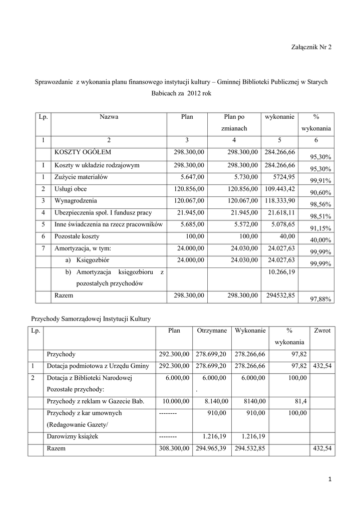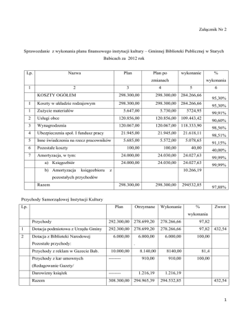 Załącznik Nr 2 Sprawozdanie z wykonania planu finansowego instytucji kultury – Gminnej Biblioteki Publicznej w Starych Babicach za 2012 rok Lp. Nazwa Plan Plan po wykonanie zmianach 1 2 3 wykonania 4 5 6 KOSZTY OGÓŁEM 298.300,00 298.300,00 284.266,66 I Koszty w układzie rodzajowym 298.300,00 298.300,00 284.266,66 1 Zużycie materiałów 5.647,00 5.730,00 5724,95 2 Usługi obce 120.856,00 120.856,00 109.443,42 3 Wynagrodzenia 120.067,00 120.067,00 118.333,90 4 Ubezpieczenia społ. I fundusz pracy 21.945,00 21.945,00 21.618,11 5 Inne świadczenia na rzecz pracowników 5.685,00 5.572,00 5.078,65 6 Pozostałe koszty 100,00 100,00 40,00 7 Amortyzacja, w tym: 24.000,00 24.030,00 24.027,63 a) Księgozbiór 24.000,00 24.030,00 24.027,63 b) Amortyzacja księgozbioru % z 95,30% 95,30% 99,91% 90,60% 98,56% 98,51% 91,15% 40,00% 99,99% 99,99% 10.266,19 pozostałych przychodów Razem 298.300,00 298.300,00 294532,85 97,88% Przychody Samorządowej Instytucji Kultury Lp. Plan Otrzymane Wykonanie % Zwrot wykonania Przychody 292.300,00 278.699,20 278.266,66 97,82 1 Dotacja podmiotowa z Urzędu Gminy 292.300,00 278.699,20 278.266,66 97,82 432,54 2 Dotacja z Biblioteki Narodowej 6.000,00 6.000,00 100,00 8.140,00 8140,00 81,4 -------- 910,00 910,00 100,00 Darowizny książek -------- 1.216,19 1.216,19 Razem 308.300,00 294.965,39 294.532,85 Pozostałe przychody: Przychody z reklam w Gazecie Bab. Przychody z kar umownych 6.000,00 . 10.000,00 (Redagowanie Gazety/ 432,54 1 Stan środków obrotowych Samorządowej Instytucji Kultury Lp. Wyszczególnienie 1 Środki pieniężne 0,00 0,00 2 Należności z lat ubiegłych 0,00 0,00 3 Pozostałe środki obrotowe 0,00 0,00 4 Zobowiązania, w tym: 0,00 0,00 a) z lat ubiegłych 0,00 0,00 b) z roku bieżącego 0,00 0,00 0,00 0,00 Stan środków obrotowych netto: Stan na 01.01.2012 r. Stan na 31.12.2012 r. Biblioteka na dzień 31.12.2012 r. nie posiada żadnych zobowiązań ani należności w tym wymagalnych. Plan finansowy Gminnej Biblioteki Publicznej na 2012 rok opiewał na kwotę 292 300,00 złotych. Dotacja podmiotowa 292 300,00 złotych, dotacja z Biblioteki Narodowej na zakup nowości wydawniczych 6 000,00 złotych. Pozostałe przychody to: z reklam w Gazecie Babickiej - 8 140,00 zł. wpływy z kar umownych910,00 zł. darowizny księgozbioru 1 216,19 zł. Łączna kwota przychodów wyniosła 308 566,19 zł. Z kwoty dotacji podmiotowej wydatkowano: na zakup materiałów 5.724,95 zakupiono: regały biblioteczne, telefon Panasonic, kody kreskowe, materiały biurowe, środki czystości, folię samoprzylepną, folię, książki jako materiał instruktażowy, radioodtwarzacz, słuchawki, monitor, głośniki itp. Na usługi obce: 109.443,42 w tym usługi telekomunikacyjne, zakup znaczków pocztowych 2.593,46, przegląd, konserwacja gaśnic, instalację i konfigurację płyty głównej oraz konserwację sieci komputerowej 941,29, za opiekę autorską nad programem kadry płace, pakiet dla administracji serwis, utrzymanie serwera, przedłużenie rejestracji domeny 3810,54, materiały prasowe i zdjęcia do Gazety Babickiej, wydruk gazety 99.329,20, wydruk list nowości książkowych 158,40, zestaw odnowieniowy/certyfikat kwalifikowany/ 159,90, aktualizację strony bibliotecznej 369,00, wykonanie projektu szaty graficznej Gazety Babickiej 2000,00, usługi transportu oraz wiadomości SMSAP 81,63. Na płace wydatkowano 118.333,90 w tym umowy o dzieło 2.084,00. Na inne świadczenia na rzecz pracowników 5.078,65 w tym: szkolenie 1035,00, świadczenia urlopowe 2.461,35, badania lekarskie i zakup okularów dla pracowników /2 osoby/ 1133,50, zakup wody do picia i herbaty 448,80. Na ubezpieczenia społeczne i fundusz pracy 21.618,11. Pozostałe koszty 40,00 –opłata wniosku ORD-IN wydanie interpretacji indywidualnej w zakresie koszty opinii. Na amortyzację księgozbioru 24.027,63 /łącznie z dotacją z Biblioteki Narodowej/. Z pozostałych przychodów tj. z reklam w Gazecie Babickiej i kar umownych zakupiono książki i audio buki do biblioteki. Otrzymano z Urzędu Gminy w ciągu całego roku dotację w kwocie 278.699,20 z kwoty tej wydatkowano 278.266,66. Niewykorzystaną kwotę w wysokości 432,54 zwrócono na konto Urzędu Gminy. Dotację z Biblioteki Narodowej wykorzystano w całości. Naliczone odsetki od dotacji za cały rok 2012 w kwocie 584,57 w tym za IV kwartał 125,65 zwrócono do Urzędu Gminy. Nie wykorzystano w całości dotacji z powodu mniejszego nakładu Gazety Babickiej niż założono w budżecie w poszczególnych miesiącach roku /zrealizowany wydruk wystarczył na pokrycie zapotrzebowania/. 2