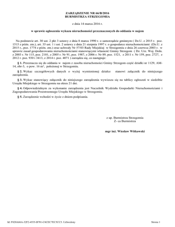 ZARZĄDZENIE NR 66/B/2016 BURMISTRZA STRZEGOMIA z dnia 14 marca 2016 r. w sprawie ogłoszenia wykazu nieruchomości przeznaczonych do oddania w najem Na podstawie art. 30 ust. 2 pkt 3 ustawy z dnia 8 marca 1990 r. o samorządzie gminnym ( Dz.U. z 2015 r. poz. 1515 z późn. zm.), art. 35 ust. 1 i ust. 2 ustawy z dnia 21 sierpnia 1997 r. o gospodarce nieruchomościami (Dz.U. z 2015 r., poz. 1774 z późn. zm.) oraz uchwały Nr 57/03 Rady Miejskiej w Strzegomiu z dnia 26 czerwca 2003 r. w sprawie zasad gospodarowania nieruchomościami stanowiącymi własność Gminy Strzegom ( Dz. Urz. Woj. Doln. z 2003 r. Nr 115, poz. 2101, z 2005 r. Nr 91, poz. 1987, z 2006 r. Nr 89, poz. 1521, z 2011 r. Nr 159, poz. 2727, z 2012 r. poz. 930 i 3413, z 2014 r. poz. 4071 ) zarządza się, co następuje: § 1. Przeznacza się do oddania w najem z zasobu nieruchomości Gminy Strzegom część działki nr 1129, AM14, obr-3, o pow. 16 m2, położonej w Strzegomiu. § 2. Wykaz szczegółowych danych o wyżej wymienionej działce zarządzenia. stanowi załącznik do niniejszego § 3. Wykaz stanowiący załącznik do niniejszego zarządzenia wywiesza się na tablicy ogłoszeń w siedzibie Urzędu Miejskiego w Strzegomiu na okres 21 dni. § 4. Odpowiedzialnym za wykonanie zarządzenia jest Naczelnik Wydziału Gospodarki Nieruchomościami i Zagospodarowania Przestrzennego Urzędu Miejskiego w Strzegomiu. § 5. Zarządzenie wchodzi w życie z dniem podpisania. z up. Burmistrza Strzegomia Z- ca Burmistrza mgr inż. Wiesław Witkowski Id: F820A66A-32F2-4535-B781-C6CEC7EC5CC5. Uchwalony Strona 1 Załącznik do Zarządzenia Nr 66/B/2016 Burmistrza Strzegomia z dnia 14 marca 2016 r. Wykaz nieruchomości przeznaczonych do oddania w najem L.p. 1. Oznaczenie nieruchomości Działka Nr 1129, AM-14, obr-3 w Strzegomiu ul. Niepodległosci 5 Pow. Opis nieruchomości Forma oddania nieruchomości Grunt pod garażem. Najem na czas nie oznaczony. 16 m2 Id: F820A66A-32F2-4535-B781-C6CEC7EC5CC5. Uchwalony Wysokość opłat i termin ich wnoszenia Czynsz 1,47 zł./m2 + 23 % VAT w skali miesiąca Miesięczny czynsz płatny do 20 dnia każdego miesiąca. Warunki zmiany wysokości czynszu Czynsz regulowany na podstawie Zarządzenia Burmistrza Strzegomia. Rozwiązanie umowy Na podstawie wypowiedzenia, zachowując jednomiesięczny okres wypowiedzenia. Strona 1 UZASADNIENIE do ZARZĄZENIA Nr 66/B/2016 BURMISTRZA STRZEGOMIA z dnia 14 marca 2016 r. w sprawie ogłoszenia wykazu nieruchomości przeznaczonych do oddania w najem Zgodnie z art. 35 ust. 1 i ust. 2 ustawy z dnia 21 sierpnia 1997 r. o gospodarce nieruchomościami (Dz.U. z 2015 r., poz. 1774 z póżń.zm.) Burmistrz Strzegomia jest zobowiązany do sporządzania i podania do publicznej wiadomości wykazu nieruchomości przeznaczonych do oddania w najem W związku z powyższym wydanie niniejszego zarządzenia jest uzasadnione. Id: F820A66A-32F2-4535-B781-C6CEC7EC5CC5. Uchwalony Strona 1
