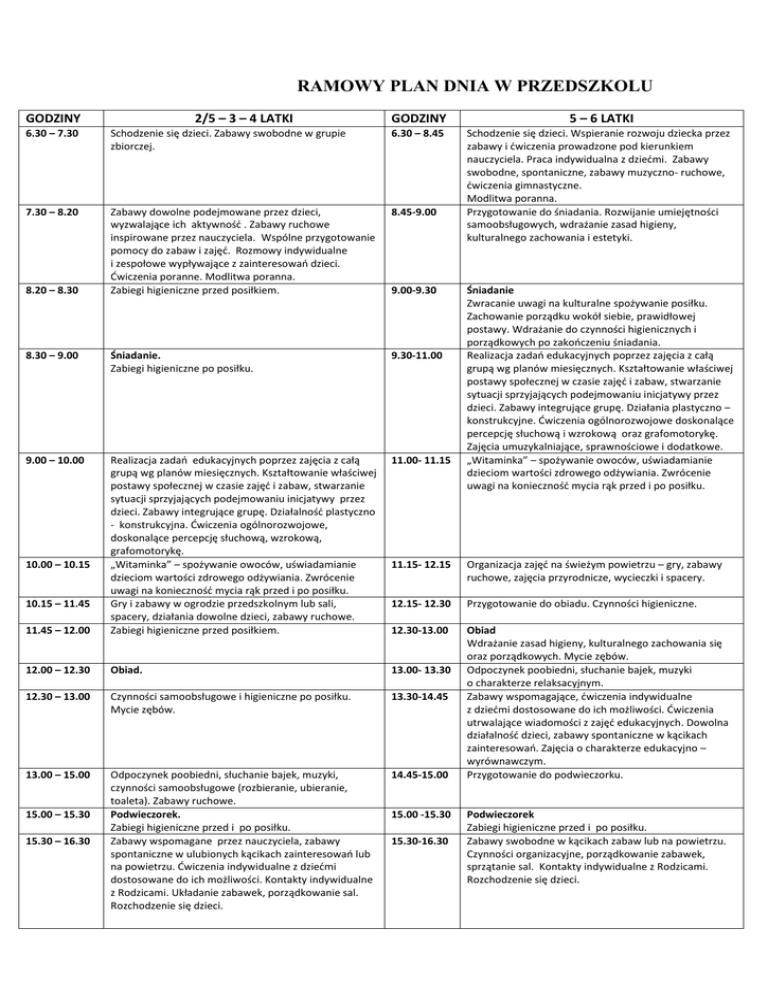 RAMOWY PLAN DNIA W PRZEDSZKOLU GODZINY GODZINY 5 – 6 LATKI 6.30 – 7.30 Schodzenie się dzieci. Zabawy swobodne w grupie zbiorczej. 6.30 – 8.45 7.30 – 8.20 Zabawy dowolne podejmowane przez dzieci, wyzwalające ich aktywność . Zabawy ruchowe inspirowane przez nauczyciela. Wspólne przygotowanie pomocy do zabaw i zajęć. Rozmowy indywidualne i zespołowe wypływające z zainteresowań dzieci. Ćwiczenia poranne. Modlitwa poranna. Zabiegi higieniczne przed posiłkiem. 8.45-9.00 Schodzenie się dzieci. Wspieranie rozwoju dziecka przez zabawy i ćwiczenia prowadzone pod kierunkiem nauczyciela. Praca indywidualna z dziećmi. Zabawy swobodne, spontaniczne, zabawy muzyczno- ruchowe, ćwiczenia gimnastyczne. Modlitwa poranna. Przygotowanie do śniadania. Rozwijanie umiejętności samoobsługowych, wdrażanie zasad higieny, kulturalnego zachowania i estetyki. 8.30 – 9.00 Śniadanie. Zabiegi higieniczne po posiłku. 9.30-11.00 9.00 – 10.00 11.00- 11.15 11.45 – 12.00 Realizacja zadań edukacyjnych poprzez zajęcia z całą grupą wg planów miesięcznych. Kształtowanie właściwej postawy społecznej w czasie zajęć i zabaw, stwarzanie sytuacji sprzyjających podejmowaniu inicjatywy przez dzieci. Zabawy integrujące grupę. Działalność plastyczno - konstrukcyjna. Ćwiczenia ogólnorozwojowe, doskonalące percepcję słuchową, wzrokową, grafomotorykę. „Witaminka” – spożywanie owoców, uświadamianie dzieciom wartości zdrowego odżywiania. Zwrócenie uwagi na konieczność mycia rąk przed i po posiłku. Gry i zabawy w ogrodzie przedszkolnym lub sali, spacery, działania dowolne dzieci, zabawy ruchowe. Zabiegi higieniczne przed posiłkiem. 12.00 – 12.30 Obiad. 13.00- 13.30 12.30 – 13.00 Czynności samoobsługowe i higieniczne po posiłku. Mycie zębów. 13.30-14.45 13.00 – 15.00 Odpoczynek poobiedni, słuchanie bajek, muzyki, czynności samoobsługowe (rozbieranie, ubieranie, toaleta). Zabawy ruchowe. Podwieczorek. Zabiegi higieniczne przed i po posiłku. Zabawy wspomagane przez nauczyciela, zabawy spontaniczne w ulubionych kącikach zainteresowań lub na powietrzu. Ćwiczenia indywidualne z dziećmi dostosowane do ich możliwości. Kontakty indywidualne z Rodzicami. Układanie zabawek, porządkowanie sal. Rozchodzenie się dzieci. 14.45-15.00 8.20 – 8.30 10.00 – 10.15 10.15 – 11.45 15.00 – 15.30 15.30 – 16.30 2/5 – 3 – 4 LATKI 9.00-9.30 Śniadanie Zwracanie uwagi na kulturalne spożywanie posiłku. Zachowanie porządku wokół siebie, prawidłowej postawy. Wdrażanie do czynności higienicznych i porządkowych po zakończeniu śniadania. Realizacja zadań edukacyjnych poprzez zajęcia z całą grupą wg planów miesięcznych. Kształtowanie właściwej postawy społecznej w czasie zajęć i zabaw, stwarzanie sytuacji sprzyjających podejmowaniu inicjatywy przez dzieci. Zabawy integrujące grupę. Działania plastyczno – konstrukcyjne. Ćwiczenia ogólnorozwojowe doskonalące percepcję słuchową i wzrokową oraz grafomotorykę. Zajęcia umuzykalniające, sprawnościowe i dodatkowe. „Witaminka” – spożywanie owoców, uświadamianie dzieciom wartości zdrowego odżywiania. Zwrócenie uwagi na konieczność mycia rąk przed i po posiłku. 11.15- 12.15 Organizacja zajęć na świeżym powietrzu – gry, zabawy ruchowe, zajęcia przyrodnicze, wycieczki i spacery. 12.15- 12.30 Przygotowanie do obiadu. Czynności higieniczne. 12.30-13.00 Obiad Wdrażanie zasad higieny, kulturalnego zachowania się oraz porządkowych. Mycie zębów. Odpoczynek poobiedni, słuchanie bajek, muzyki o charakterze relaksacyjnym. Zabawy wspomagające, ćwiczenia indywidualne z dziećmi dostosowane do ich możliwości. Ćwiczenia utrwalające wiadomości z zajęć edukacyjnych. Dowolna działalność dzieci, zabawy spontaniczne w kącikach zainteresowań. Zajęcia o charakterze edukacyjno – wyrównawczym. Przygotowanie do podwieczorku. 15.00 -15.30 15.30-16.30 Podwieczorek Zabiegi higieniczne przed i po posiłku. Zabawy swobodne w kącikach zabaw lub na powietrzu. Czynności organizacyjne, porządkowanie zabawek, sprzątanie sal. Kontakty indywidualne z Rodzicami. Rozchodzenie się dzieci.