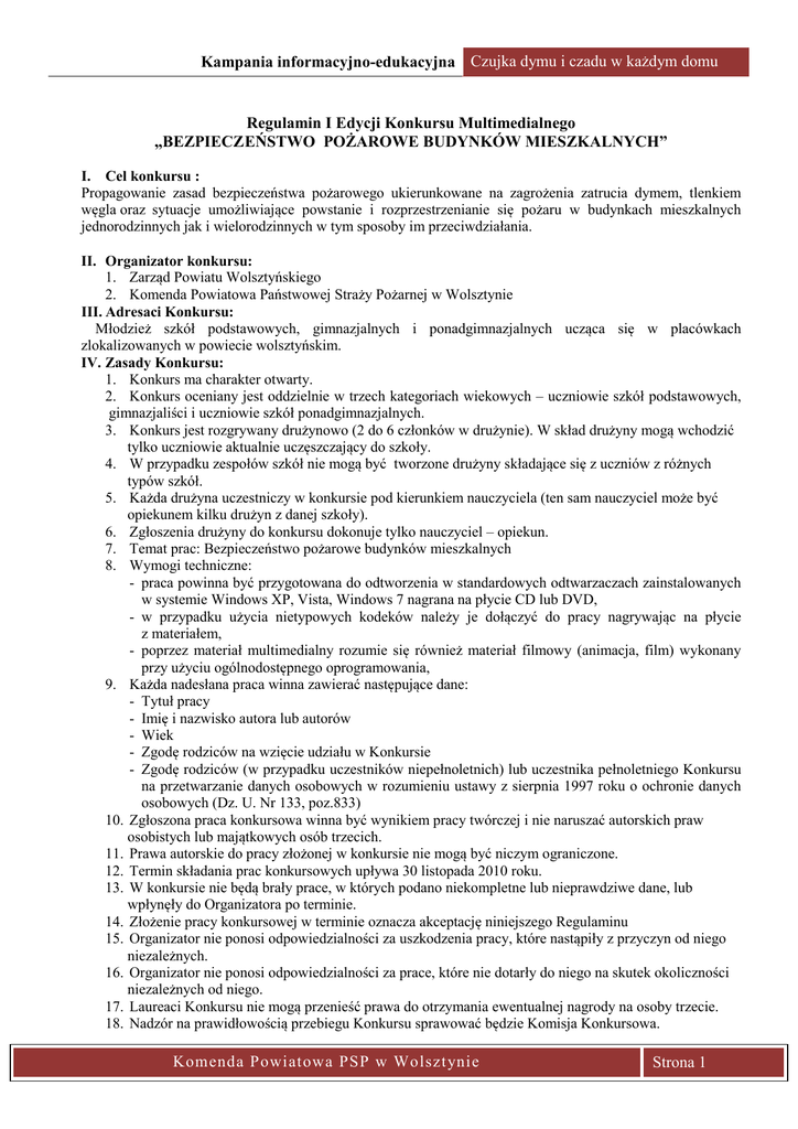Kampania informacyjno-edukacyjna Czujka dymu i czadu w każdym domu Regulamin I Edycji Konkursu Multimedialnego „BEZPIECZ EŃSTWO POŻAROWE BUDYNKÓW MIESZKALNYCH” I. Cel konkursu : Propagowanie zasad bezpieczeństwa pożarowego ukierunkowane na zagrożenia zatrucia dymem, tlenkiem węgla oraz sytuacje umożliwiające powstanie i rozprzestrzenianie się pożaru w budynkach mieszkalnych jednorodzinnych jak i wielorodzinnych w tym sposoby im przeciwdziałania. II. Organizator konkursu: 1. Zarząd Powiatu Wolsztyńskiego 2. Komenda Powiatowa Państwowej Straży Pożarnej w Wolsztynie III. Adresaci Konkursu: Młodzież szkół podstawowych, gimnazjalnych i ponadgimnazjalnych ucząca się w placówkach zlokalizowanych w powiecie wolsztyńskim. IV. Zasady Konkursu: 1. Konkurs ma charakter otwarty. 2. Konkurs oceniany jest oddzielnie w trzech kategoriach wiekowych – uczniowie szkół podstawowych, gimnazjaliści i uczniowie szkół ponadgimnazjalnych. 3. Konkurs jest rozgrywany drużynowo (2 do 6 członków w drużynie). W skład drużyny mogą wchodzić tylko uczniowie aktualnie uczęszczający do szkoły. 4. W przypadku zespołów szkół nie mogą być tworzone drużyny składające się z uczniów z różnych typów szkół. 5. Każda drużyna uczestniczy w konkursie pod kierunkiem nauczyciela (ten sam nauczyciel może być opiekunem kilku drużyn z danej szkoły). 6. Zgłoszenia drużyny do konkursu dokonuje tylko nauczyciel – opiekun. 7. Temat prac: Bezpieczeństwo pożarowe budynków mieszkalnych 8. Wymogi techniczne: - praca powinna być przygotowana do odtworzenia w standardowych odtwarzaczach zainstalowanych w systemie Windows XP, Vista, Windows 7 nagrana na płycie CD lub DVD, - w przypadku użycia nietypowych kodeków należy je dołączyć do pracy nagrywając na płycie z materiałem, - poprzez materiał multimedialny rozumie się również materiał filmowy (animacja, film) wykonany przy użyciu ogólnodostępnego oprogramowania, 9. Każda nadesłana praca winna zawierać następujące dane: - Tytuł pracy - Imię i nazwisko autora lub autorów - Wiek - Zgodę rodziców na wzięcie udziału w Konkursie - Zgodę rodziców (w przypadku uczestników niepełnoletnich) lub uczestnika pełnoletniego Konkursu na przetwarzanie danych osobowych w rozumieniu ustawy z sierpnia 1997 roku o ochronie danych osobowych (Dz. U. Nr 133, poz.833) 10. Zgłoszona praca konkursowa winna być wynikiem pracy twórczej i nie naruszać autorskich praw osobistych lub majątkowych osób trzecich. 11. Prawa autorskie do pracy złożonej w konkursie nie mogą być niczym ograniczone. 12. Termin składania prac konkursowych upływa 30 listopada 2010 roku. 13. W konkursie nie będą brały prace, w których podano niekompletne lub nieprawdziwe dane, lub wpłynęły do Organizatora po terminie. 14. Złożenie pracy konkursowej w terminie oznacza akceptację niniejszego Regulaminu 15. Organizator nie ponosi odpowiedzialności za uszkodzenia pracy, które nastąpiły z przyczyn od niego niezależnych. 16. Organizator nie ponosi odpowiedzialności za prace, które nie dotarły do niego na skutek okoliczności niezależnych od niego. 17. Laureaci Konkursu nie mogą przenieść prawa do otrzymania ewentualnej nagrody na osoby trzecie. 18. Nadzór na prawidłowością przebiegu Konkursu sprawować będzie Komisja Konkursowa. Komenda Powiatowa PSP w Wolszt ynie Wpisz adres firmy] Strona 1 Kampania informacyjno-edukacyjna Czujka dymu i czadu w każdym domu 19. Komisja Konkursowa składać się będzie od 3 do 5 osób. 20. Decyzja Komisji Konkursowej jest ostateczna. 21. Dane Uczestników Konkursu będą przetwarzane zgodnie z postanowieniami ustawy o ochronie danych osobowych (Dz. U. z 1997 r. Nr 133, poz. 883 ze zm.). 22. Administratorem danych osobowych udostępnianych przez uczestników Konkursu będzie Organizator. 23. Dane tych osób przetwarzane będą przez podmiot działający na zlecenie administratora w rozumieniu art. 31 ustawy o ochronie danych osobowych wyłącznie w celach związanych z organizacją niniejszego Konkursu. 24. Organizator oraz fundator nagród zastrzegają sobie prawo podania do publicznej wiadomości danych osobowych osób, które otrzymają nagrodę i wyróżnienia w Konkursie. 25. Organizatorowi przysługuje prawo publikowania informacji o nagrodzonych pracach, w środkach masowego przekazu, a także prawo swobodnego wykorzystywania tych prac, bez dalszych zobowiązań finansowych wobec uczestników konkursu. 26. Prawo do wiążącej i ostatecznej interpretacji zapisów Regulaminu przysługuje Organizatorowi lub Jury. 27. W kwestiach nieuregulowanych niniejszym Regulaminem stosuje się przepisy kodeksu cywilnego. V. Terminy Prace konkursowe należy przesłać do Organizatora: Adres: Komenda Powiatowa PSP w Wolsztynie, ul. Wschowska 17, 64-200 Wolsztyn z dopiskiem „Konkurs multimedialny” do 30 listopad 2010 roku - termin rozstrzygnięcia konkursu – 15 grudzień 2010r. - termin przekazania nagród – 30 grudzień 2010r. VI. Nagrody W Konkursie wyłoniona zostanie zwycięska drużyna w każdej z kategorii wiekowych. Laureaci otrzymają nagrody rzeczowe. VII. Organizator zastrzega, że nie zwraca nadesłanych prac. Zostaną one wykorzystane do publikacji własnych w celu dalszej profilaktyki i edukacji bezpieczeństwa pożarowego. VIII. Jury. Prace ocenia Jury, którego skład ustala Organizator Konkursu. Organizator Konkursu zastrzega sobie prawo do bezpłatnej prezentacji prac. SERDECZNIE ZAPRASZAMY DO UDZIAŁU W KONKURSIE! Komenda Powiatowa PSP w Wolszt ynie Wpisz adres firmy] Strona 2 Kampania informacyjno-edukacyjna Czujka dymu i czadu w każdym domu Formularz zgłoszeniowy do Konkursu multimedialnego „BEZPIECZE ŃSTWO POŻAROWE BUDYNKÓW MIESZKALNYCH”. Imię i nazwisko opiekuna Imiona i nazwiska uczniów 1. 2. 3. 4. 5. 6. Pełna nazwa placówki Adres Szkoły Numer telefonu do kontaktu Adres mail do kontaktu Tytuł opracowania: Formularz zgłoszeniowy należy dołączy