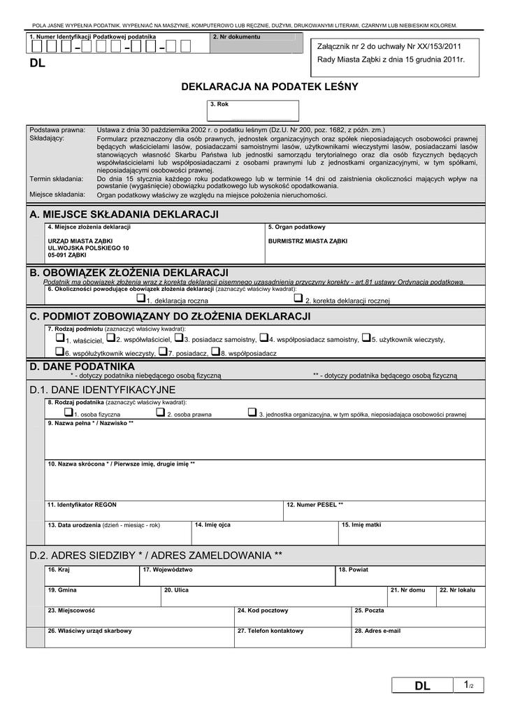 POLA JASNE WYPEŁNIA PODATNIK. WYPEŁNIAĆ NA MASZYNIE, KOMPUTEROWO LUB RĘCZNIE, DUŻYMI, DRUKOWANYMI LITERAMI, CZARNYM LUB NIEBIESKIM KOLOREM. 1. Numer Identyfikacji Podatkowej podatnika - DL - 2. Nr dokumentu - Załącznik nr 2 do uchwały Nr XX/153/2011 Rady Miasta Ząbki z dnia 15 grudnia 2011r. DEKLARACJA NA PODATEK LEŚNY 3. Rok ................................................... Podstawa prawna: Składający: Termin składania: Miejsce składania: Ustawa z dnia 30 października 2002 r. o podatku leśnym (Dz.U. Nr 200, poz. 1682, z późn. zm.) Formularz przeznaczony dla osób prawnych, jednostek organizacyjnych oraz spółek nieposiadających osobowości prawnej będących właścicielami lasów, posiadaczami samoistnymi lasów, użytkownikami wieczystymi lasów, posiadaczami lasów stanowiących własność Skarbu Państwa lub jednostki samorządu terytorialnego oraz dla osób fizycznych będących współwłaścicielami lub współposiadaczami z osobami prawnymi lub z jednostkami organizacyjnymi, w tym spółkami, nieposiadającymi osobowości prawnej. Do dnia 15 stycznia każdego roku podatkowego lub w terminie 14 dni od zaistnienia okoliczności mających wpływ na powstanie (wygaśnięcie) obowiązku podatkowego lub wysokość opodatkowania. Organ podatkowy właściwy ze względu na miejsce położenia nieruchomości. A. MIEJSCE SKŁADANIA DEKLARACJI 4. Miejsce złożenia deklaracji 5. Organ podatkowy URZĄD MIASTA ZĄBKI UL.WOJSKA POLSKIEGO 10 05-091 ZĄBKI BURMISTRZ MIASTA ZĄBKI B. OBOWIĄZEK ZŁOŻENIA DEKLARACJI Podatnik ma obowiązek złożenia wraz z korektą deklaracji pisemnego uzasadnienia przyczyny korekty - art.81 ustawy Ordynacja podatkowa. 1. deklaracja roczna 2. korekta deklaracji rocznej 6. Okoliczności powodujące obowiązek złożenia deklaracji (zaznaczyć właściwy kwadrat): C. PODMIOT ZOBOWIĄZANY DO ZŁOŻENIA DEKLARACJI 1. właściciel, 2. współwłaściciel, 3. posiadacz samoistny, 4. współposiadacz samoistny, 5. użytkownik wieczysty, 6. współużytkownik wieczysty, 7. posiadacz, 8. współposiadacz 7. Rodzaj podmiotu (zaznaczyć właściwy kwadrat): D. DANE PODATNIKA * - dotyczy podatnika niebędącego osobą fizyczną ** - dotyczy podatnika będącego osobą fizyczną D.1. DANE IDENTYFIKACYJNE 2. osoba prawna 8. Rodzaj podatnika (zaznaczyć właściwy kwadrat): 1. osoba fizyczna 9. Nazwa pełna * / Nazwisko ** 3. jednostka organizacyjna, w tym spółka, nieposiadająca osobowości prawnej 10. Nazwa skrócona * / Pierwsze imię, drugie imię ** 11. Identyfikator REGON 12. Numer PESEL ** 14. Imię ojca 13. Data urodzenia (dzień - miesiąc - rok) 15. Imię matki D.2. ADRES SIEDZIBY * / ADRES ZAMELDOWANIA ** 16. Kraj 19. Gmina 17. Województwo 18. Powiat 20. Ulica 21. Nr domu 23. Miejscowość 24. Kod pocztowy 25. Poczta 26. Właściwy urząd skarbowy 27. Telefon kontaktowy 28. Adres e-mail DL 22. Nr lokalu 1/2 POLA JASNE WYPEŁNIA PODATNIK. WYPEŁNIAĆ NA MASZYNIE, KOMPUTEROWO LUB RĘCZNIE, DUŻYMI, DRUKOWANYMI LITERAMI, CZARNYM LUB NIEBIESKIM KOLOREM. E. DANE DOTYCZĄCE LASÓW NIEPODLEGAJĄCYCH ZWOLNIENIU Szczegółowe dane o nieruchomościach leśnych proszę wykazać w załączniku Z-1/IL/DL Rodzaj gruntów leśnych Powierzchnia w ha z dokładnością do 1m2 1) Stawka podatku A B zł, 1. Lasy 29. 2. Lasy ochronne 33. 3. Lasy wchodzące w skład rezerwatów przyrody 37. 4. Lasy wchodzące w skład parków narodowych 41. Liczba miesięcy opodatkowania, np. 1/12, 12/12 gr C 30. Kwota podatku wyliczona wg wzoru: (AxBxC) zł, gr D 31. 32. 35. 36. 39. 40. 43. 44. , , 34. , , , 38. , , , 42. , , , , F. ŁĄCZNA KWOTA PODATKU Kwota podatku (w pełnych złotych) ***) 45. zł G. INFORMACJA O PRZEDMIOTACH ZWOLNIONYCH Przedmioty zwolnione należy wykazać w załączniku Z – 2/IL/DL G. INFORMACJA O ZAŁĄCZNIKACH (do niniejszej deklaracji dołączono) 46. Liczba załączników Z–1/IL/DL dotyczących szczegółowych danych o nieruchomościach leśnych: 47. Załącznik dotyczący przedmiotów zwolnionych Z - 2/IL/DL składany (zaznaczyć właściwy kwadrat): tak .................................. szt. nie H. OŚWIADCZENIE I PODPIS PODATNIKA / OSOBY REPREZENTUJĄCEJ PODATNIKA O wszelkich zmianach mających wpływ na wysokość zobowiązania podatkowego (powierzchnia, sposób użytkowania) zawiadomię tutejszy organ podatkowy, w terminie 14 dni od zaistnienia zmian. Oświadczam, że są mi znane przepisy Kodeksu karnego skarbowego o odpowiedzialności za podanie danych niezgodnych z rzeczywistością. 48. Imię 49. Nazwisko 50. Data wypełnienia deklaracji (dzień - miesiąc - rok) 51. Podpis (pieczęć) podatnika / osoby reprezentującej podatnika 2) ***) Pouczenie Niniejsza deklaracja stanowi podstawę do wystawienia tytułu wykonawczego, zgodnie z przepisami ustawy z dnia 17 czerwca 1966 r. o postępowaniu egzekucyjnym w administracji (Dz.U. z 2005 r. Nr 229, poz. 1954 z późn. zm.). 1) Należy podać z dokładnością do czterech miejsc po przecinku. 2) Niepotrzebne skreślić. DL 2/2